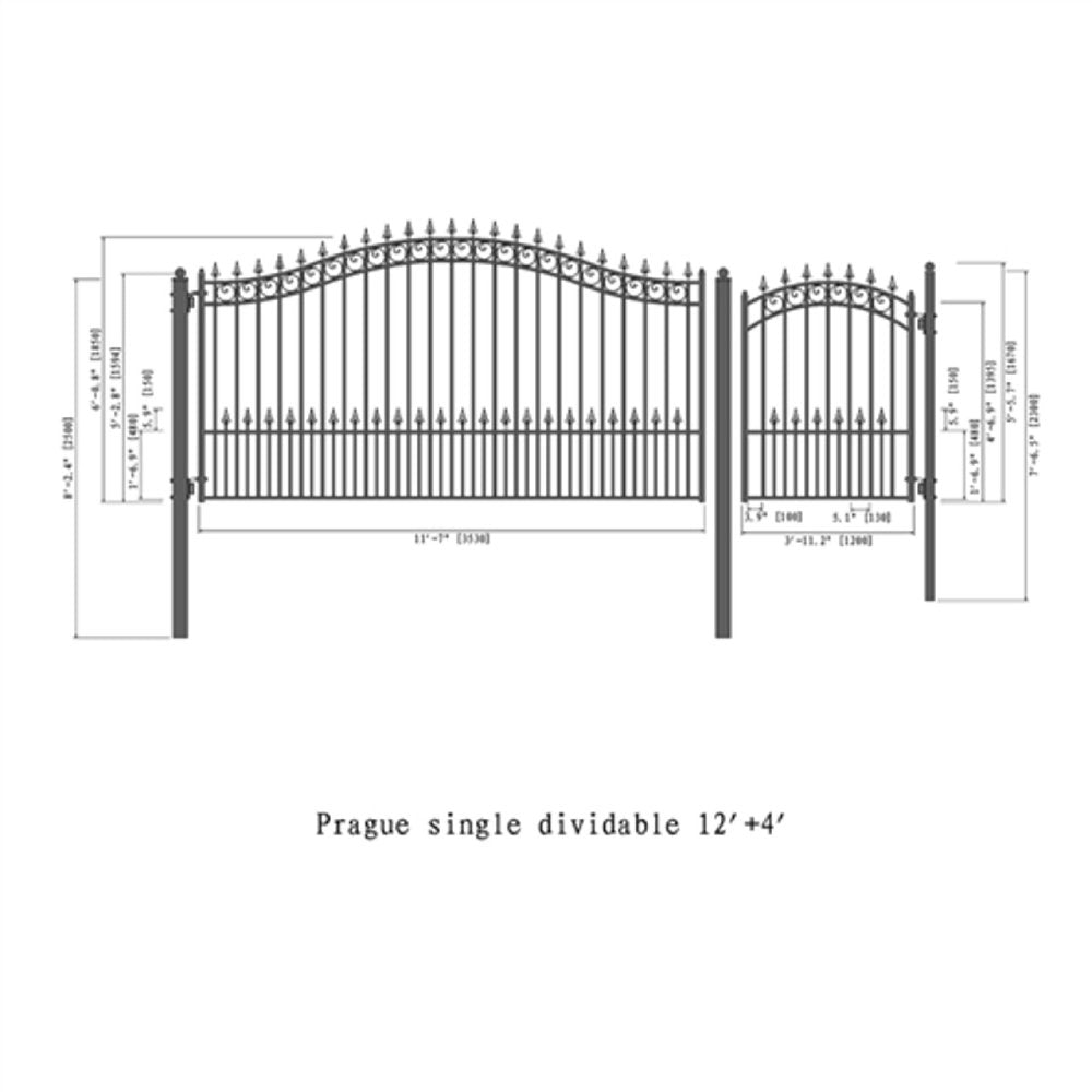 [12-16FT] Aleko Prague Style Heavy Duty Galvanized Steel Single Swing Driveway Gate With Pedestrian Gate (SAK98036)