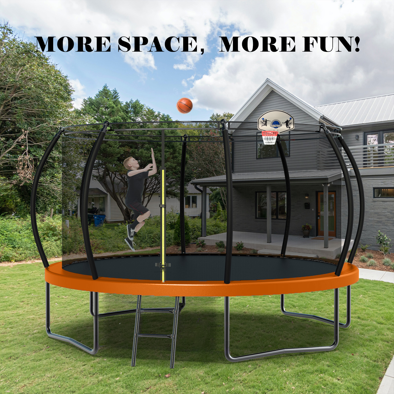 - Unique Style & Comprehensive Certification: Our 12FT big trampoline features a distinctive pumpkin-style design, providing a visually appealing and three-dimensional look. The spacious net poles and ample net space ensure a reduced risk of collisions. Rest assured, this product has undergone rigorous testing and holds certifications such as ASTM F381-16 & F2225-15, CPC, and CPSIA, guaranteeing its compliance with stringent safety standards.