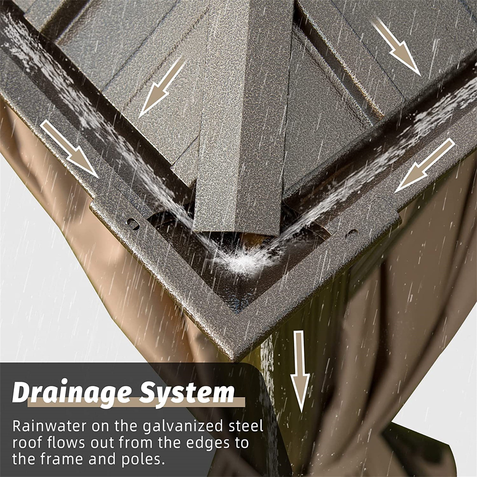 4. 【UNIQUE WATER GUTTER】This outdoor gazebo designed with water gutter which allows the rainwater flow from the edge of the top into the hole, then to the ground. No worries about the rainy day and snow melting.