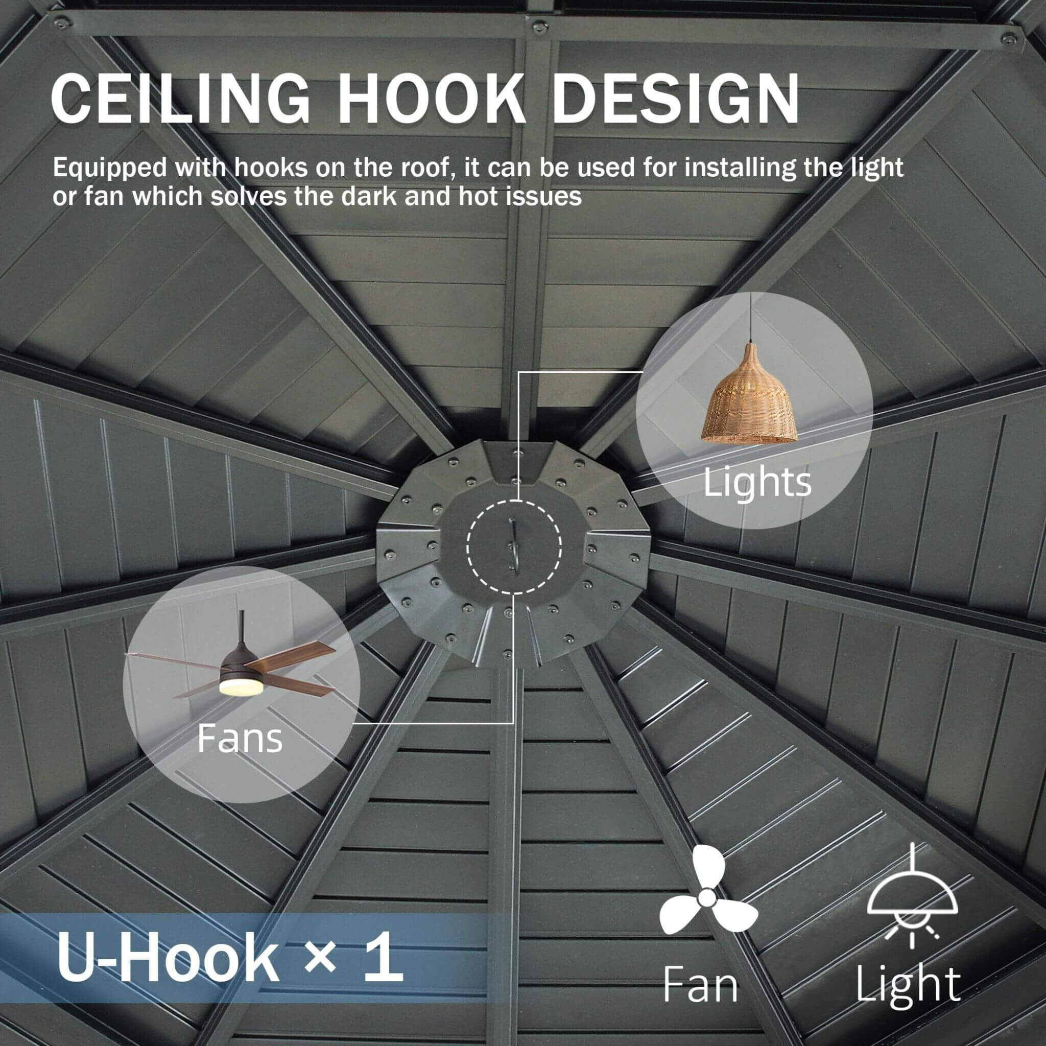 - The hardtop slope roof is made of long-lasting galvanized steel sheets, designed to allow water to flow off quickly, reducing pooling or snow build-up.
