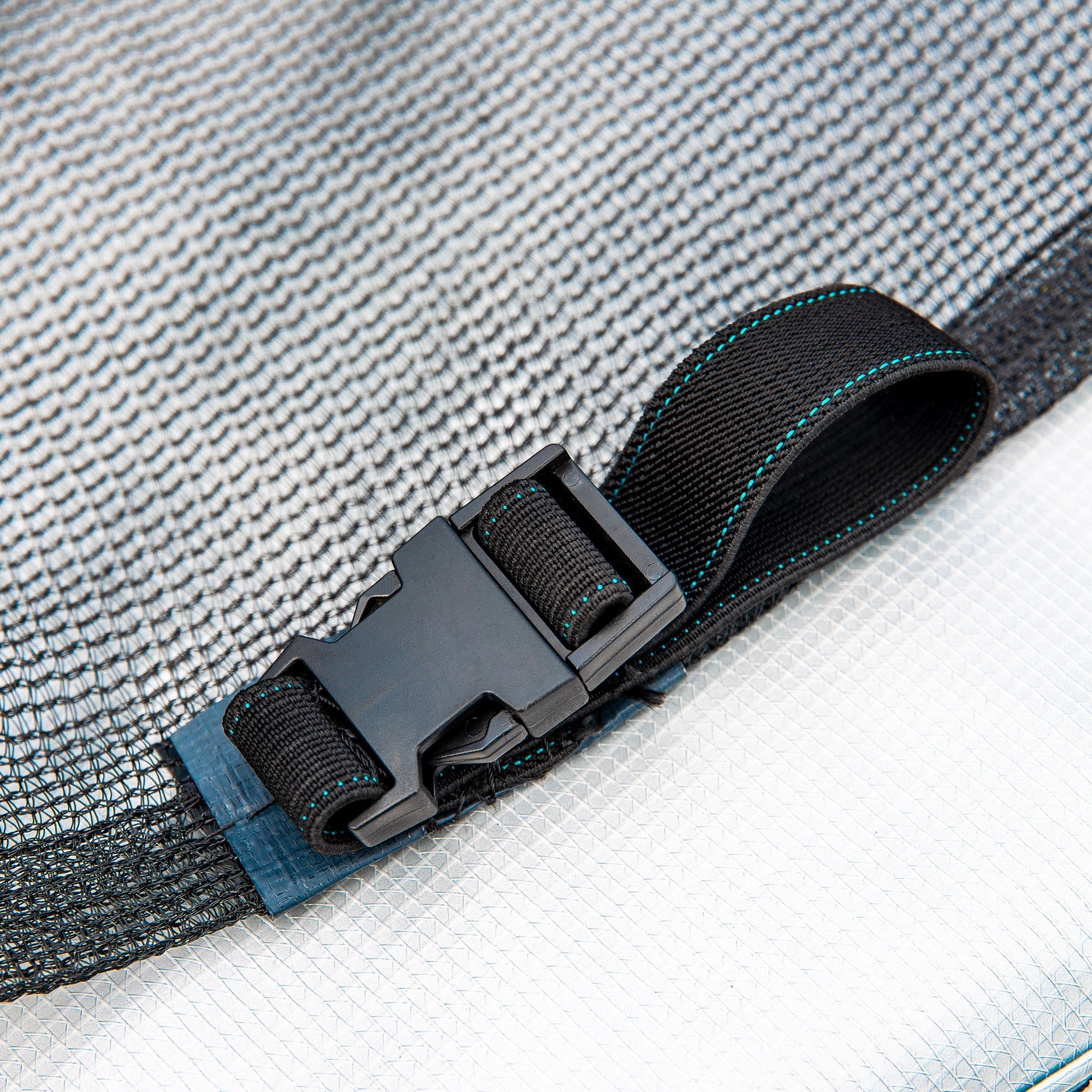 Add a triangle net around the backboard to keep the ball from flying off the trampoline