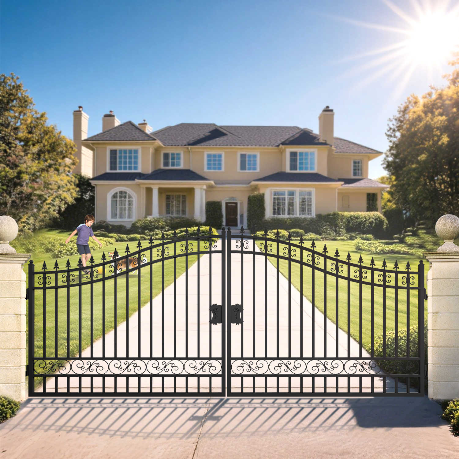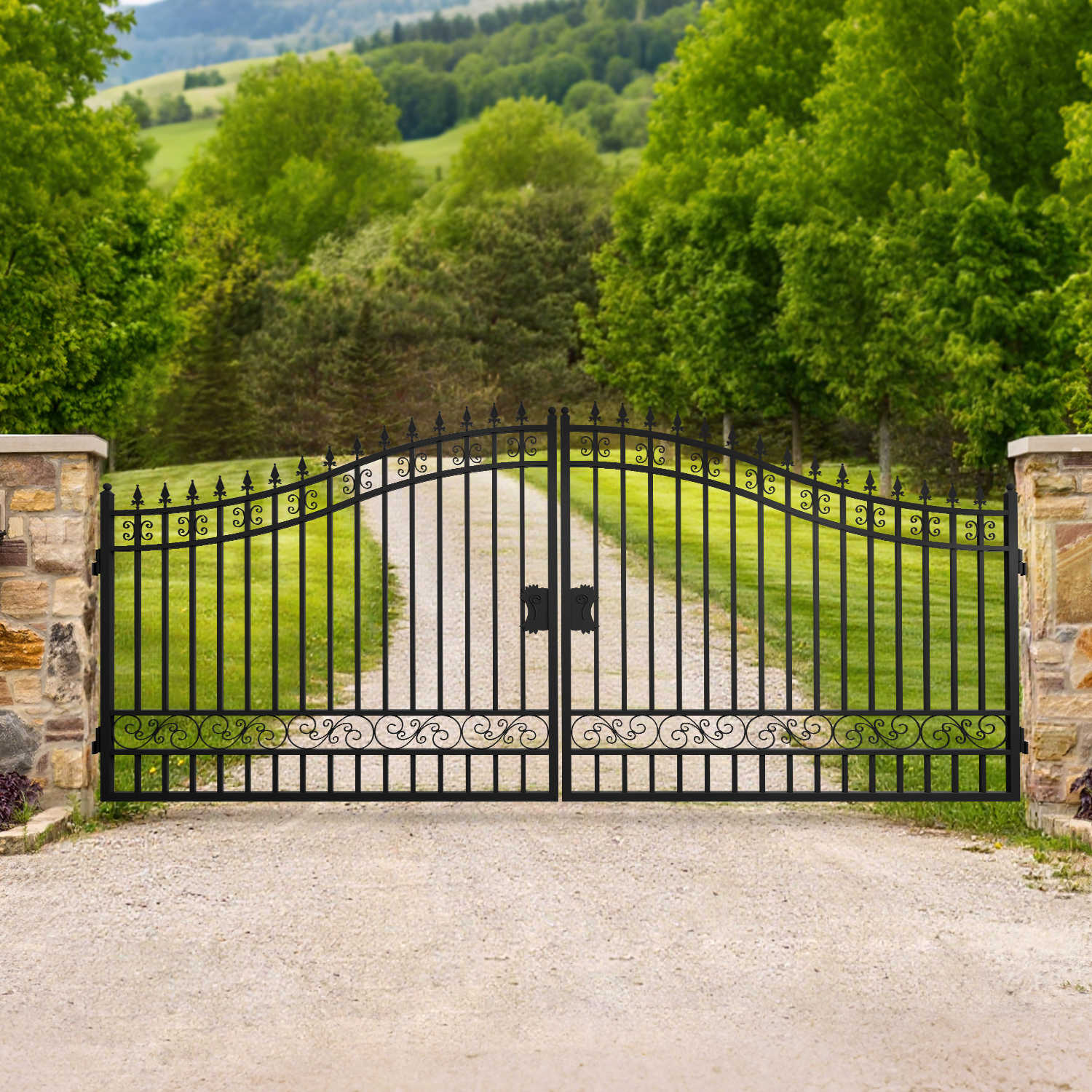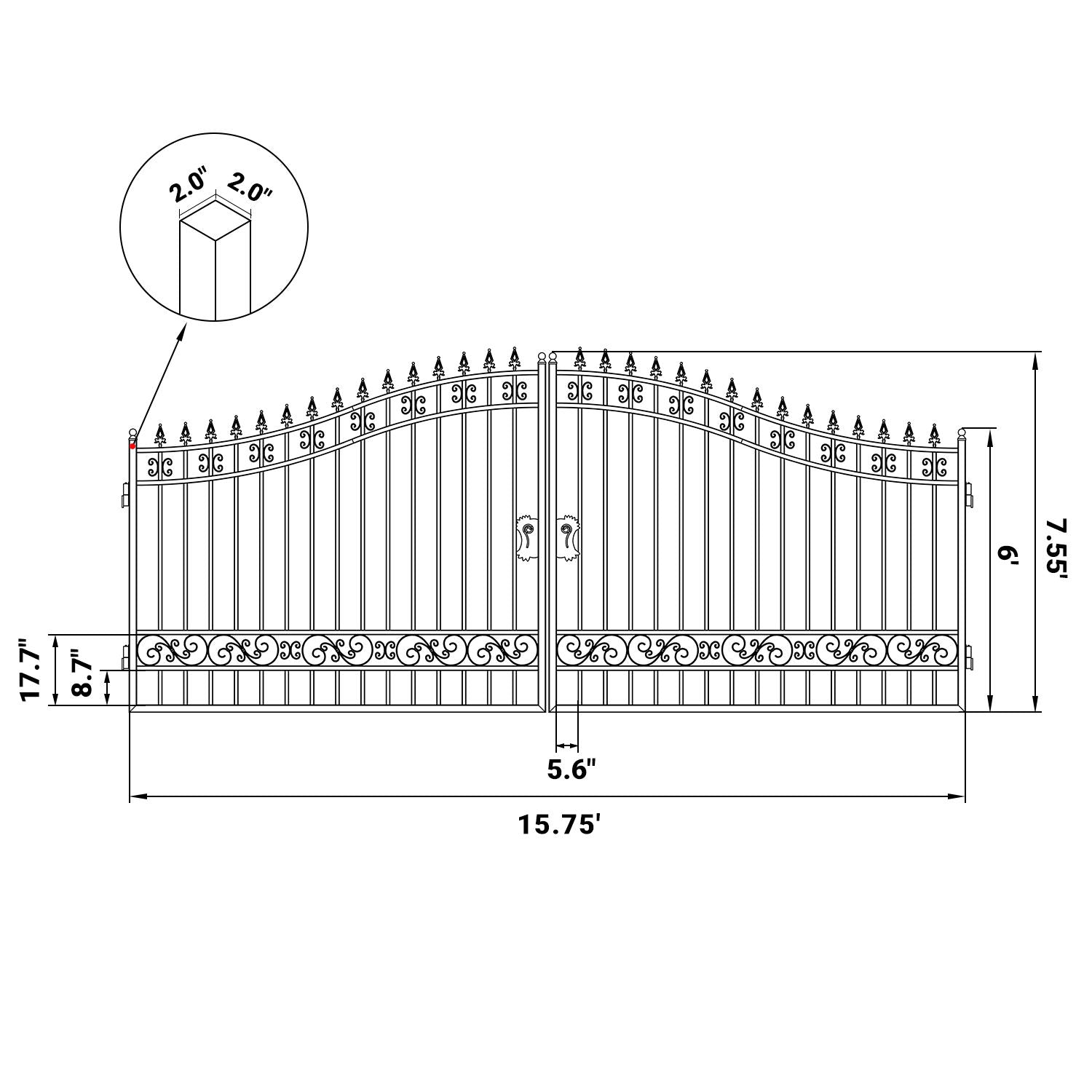This 16-foot dual swing wrought iron gate offers a classic, timeless look with clean, unadorned lines. Built for durability and security, its sturdy iron construction provides an elegant entryway, while the lack of decorative elements offers a sleek, minimalist aesthetic.
