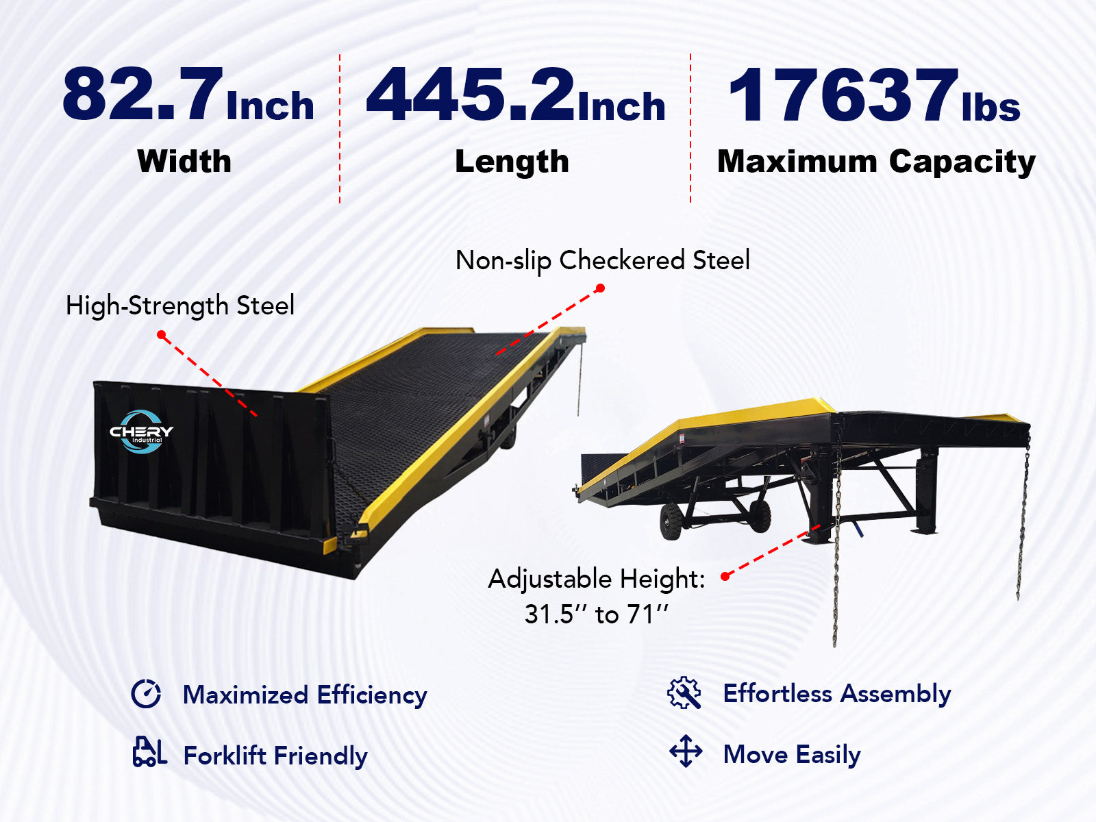 • Unrivaled Strength: Supporting a massive 17,637 lbs (8,000 kg), this ramp provides the robust support you need for heavy-duty material handling, reducing downtime and improving productivity.