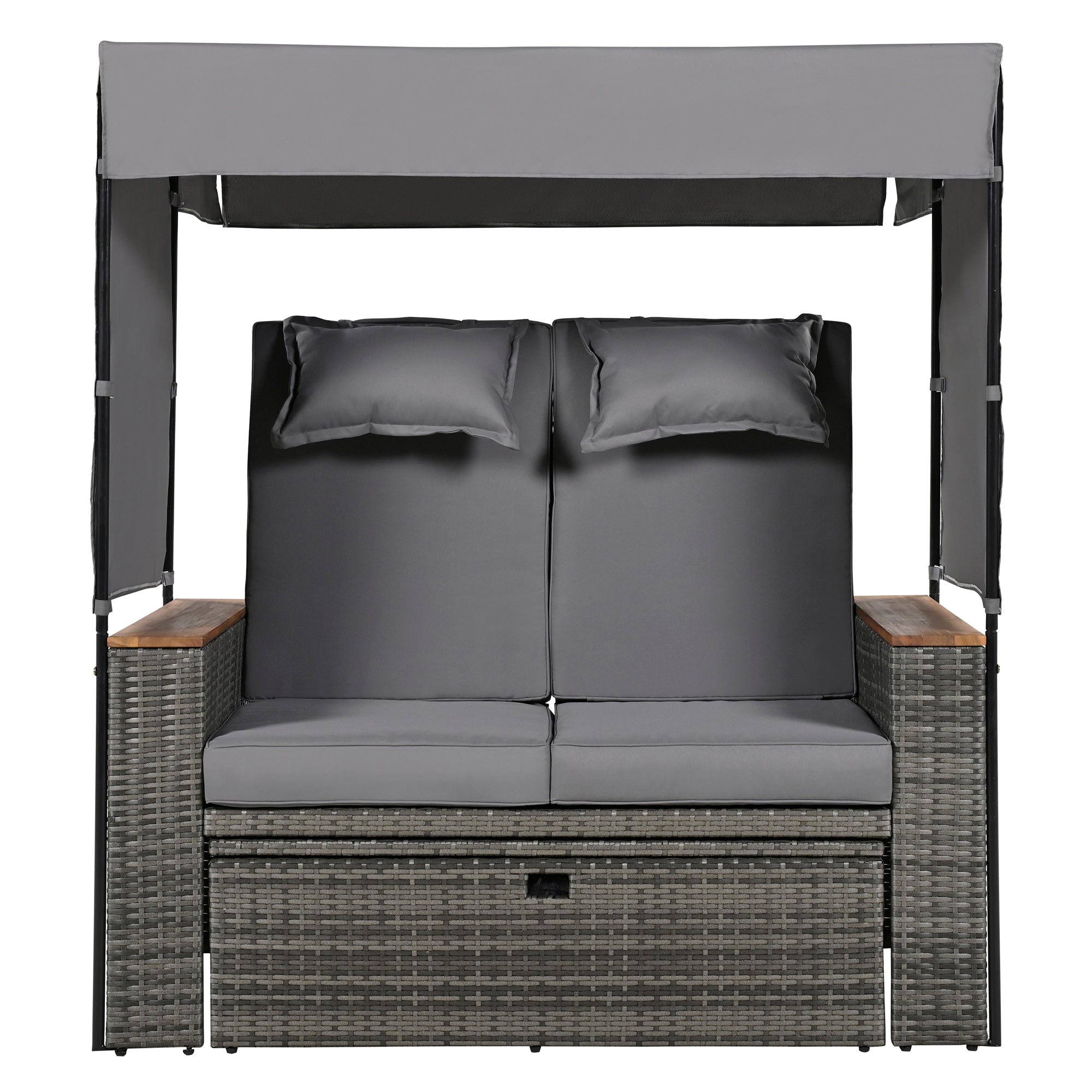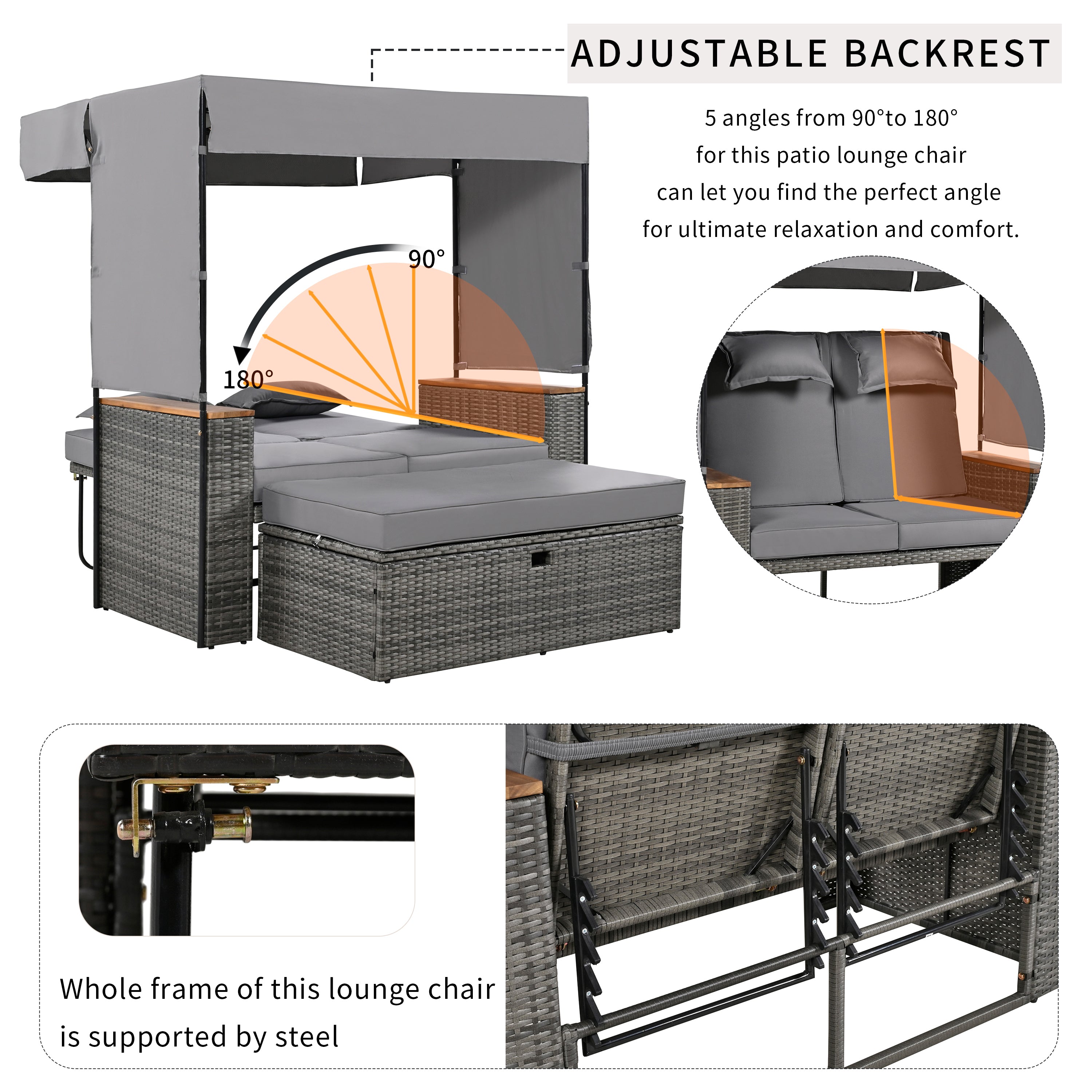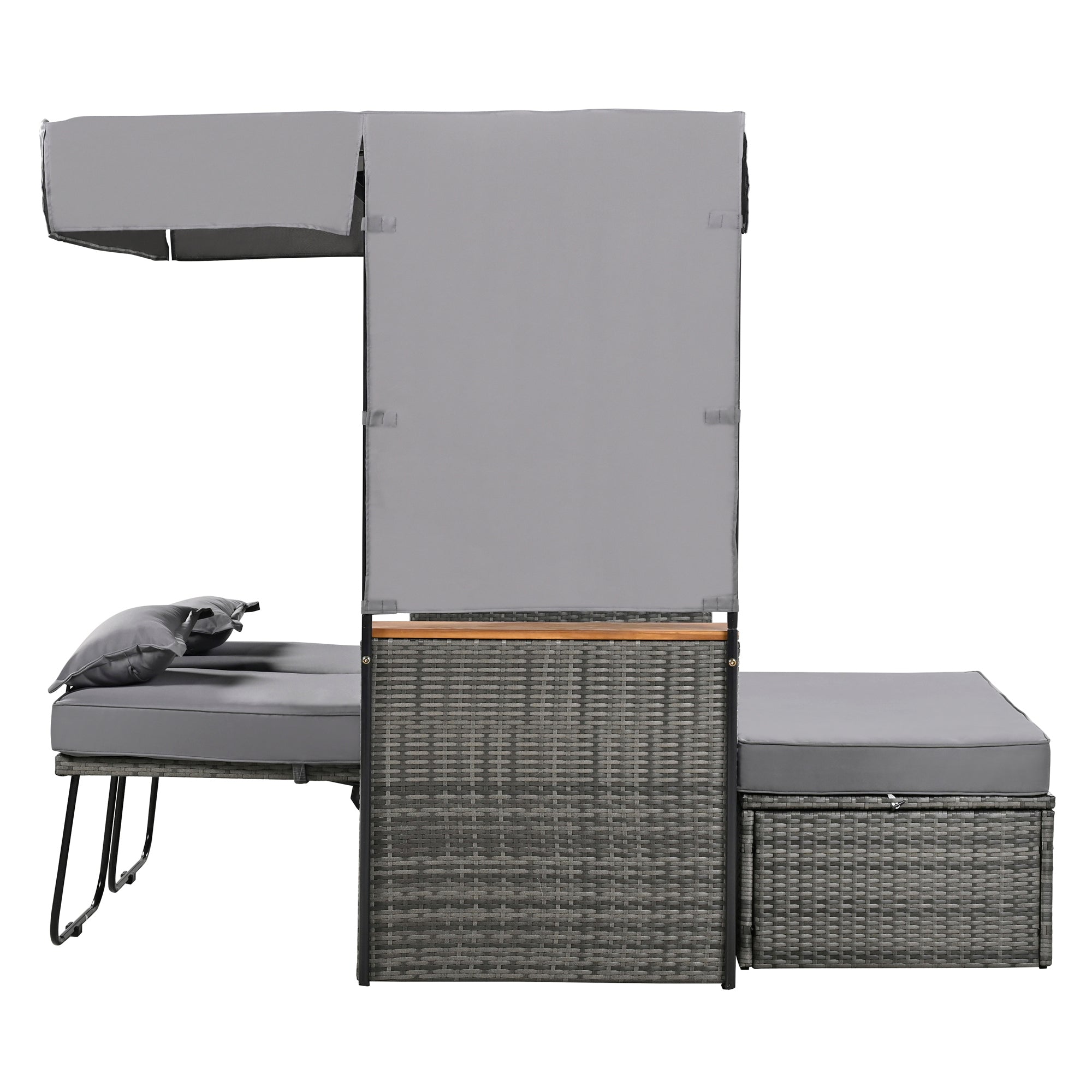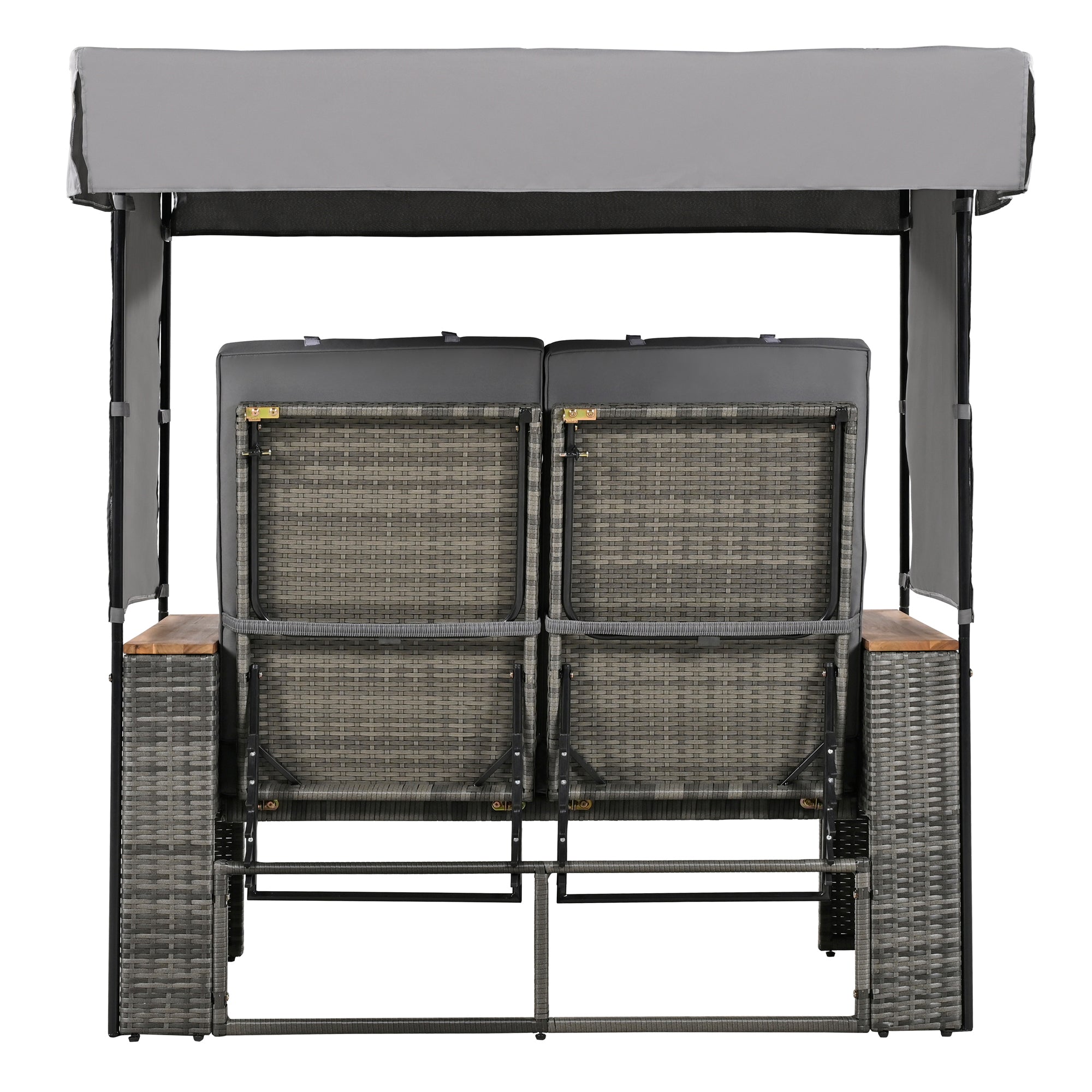 2-Piece Rattan Outdoor Patio Bench Lounge Roof Set, Effective UV Protection Fabric & Waterproof Cushions and Adjustable Backrest for Garden, Backyard and Porch (Grey Wicker + Grey Fabric)