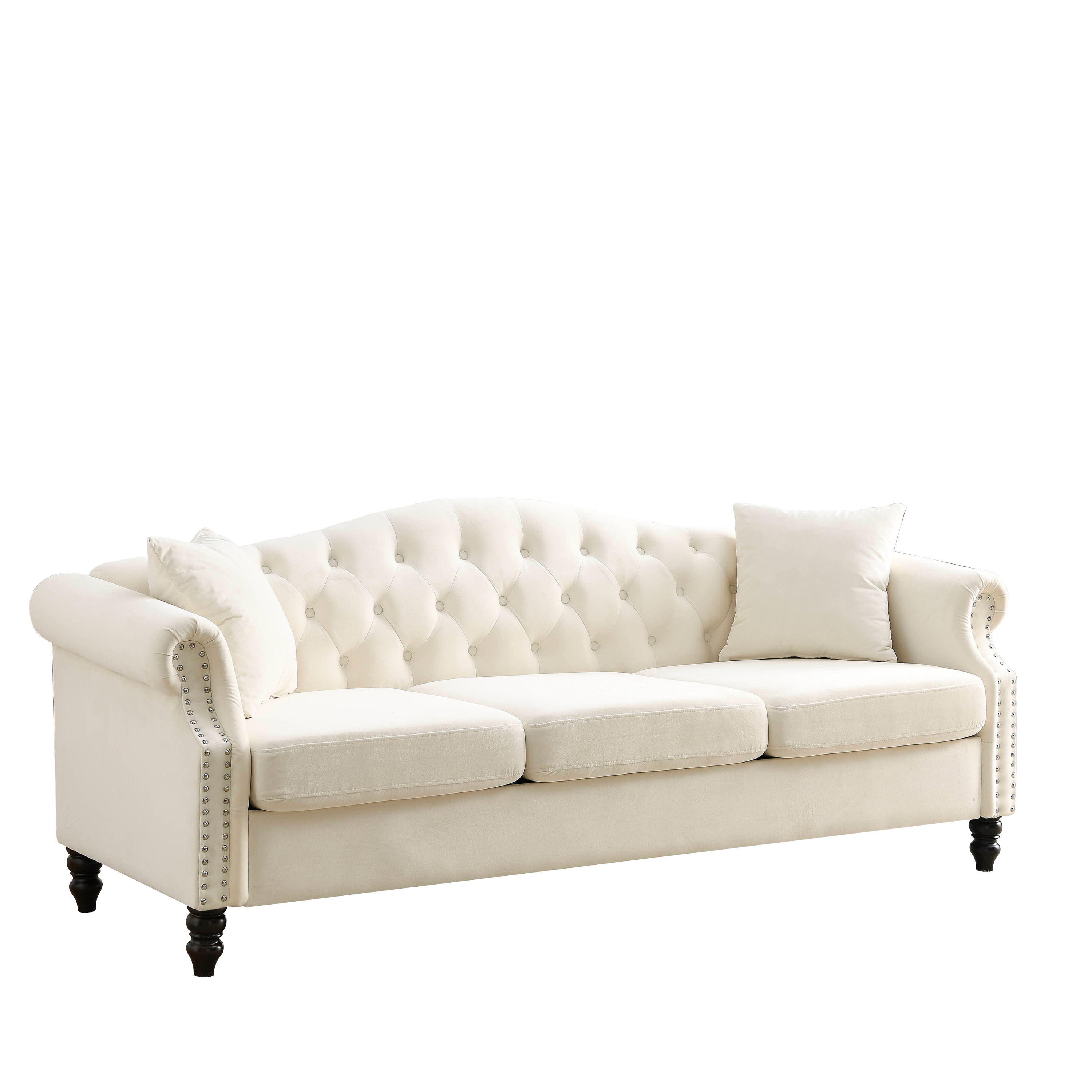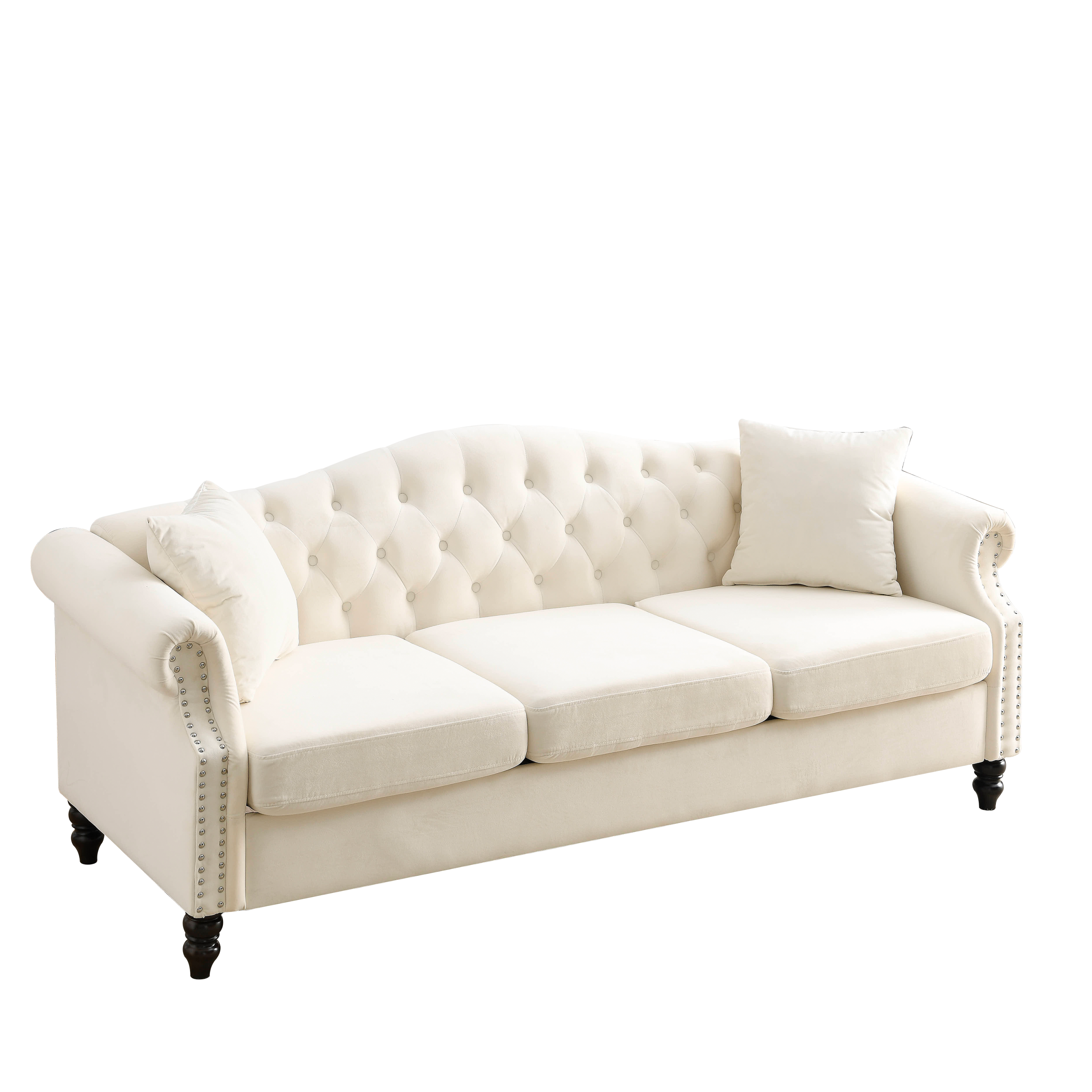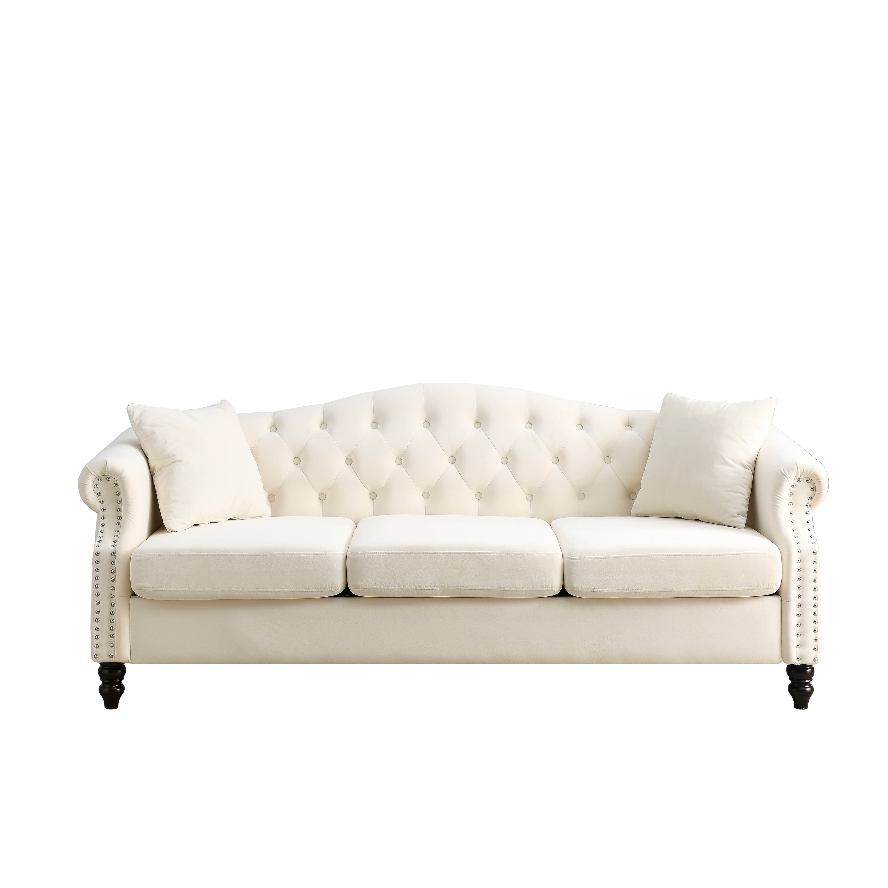 - Sturdy and durable. The frame of the sofa is made of solid wood for added sturdiness and durability. With comfortable foam, soft cushions supported by a curved spring structure and tufted buttons on the back and arms, this sofa is perfect for those who want to rest after a busy day.