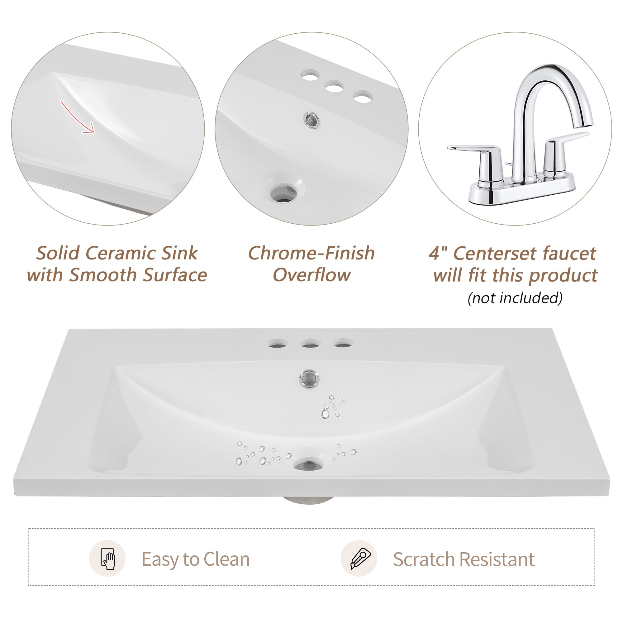 - Smooth Ceramic Sink: Our bathroom basin sink is made of solid ceramic with smooth and water-proof finish, which hardly leaves water stains. The pre-drilled three holes on the top is available to 4″ centerset faucet (not included). Besides, the overflow with metal circle is in case of water spilling over when you forgot to turn off the tap.