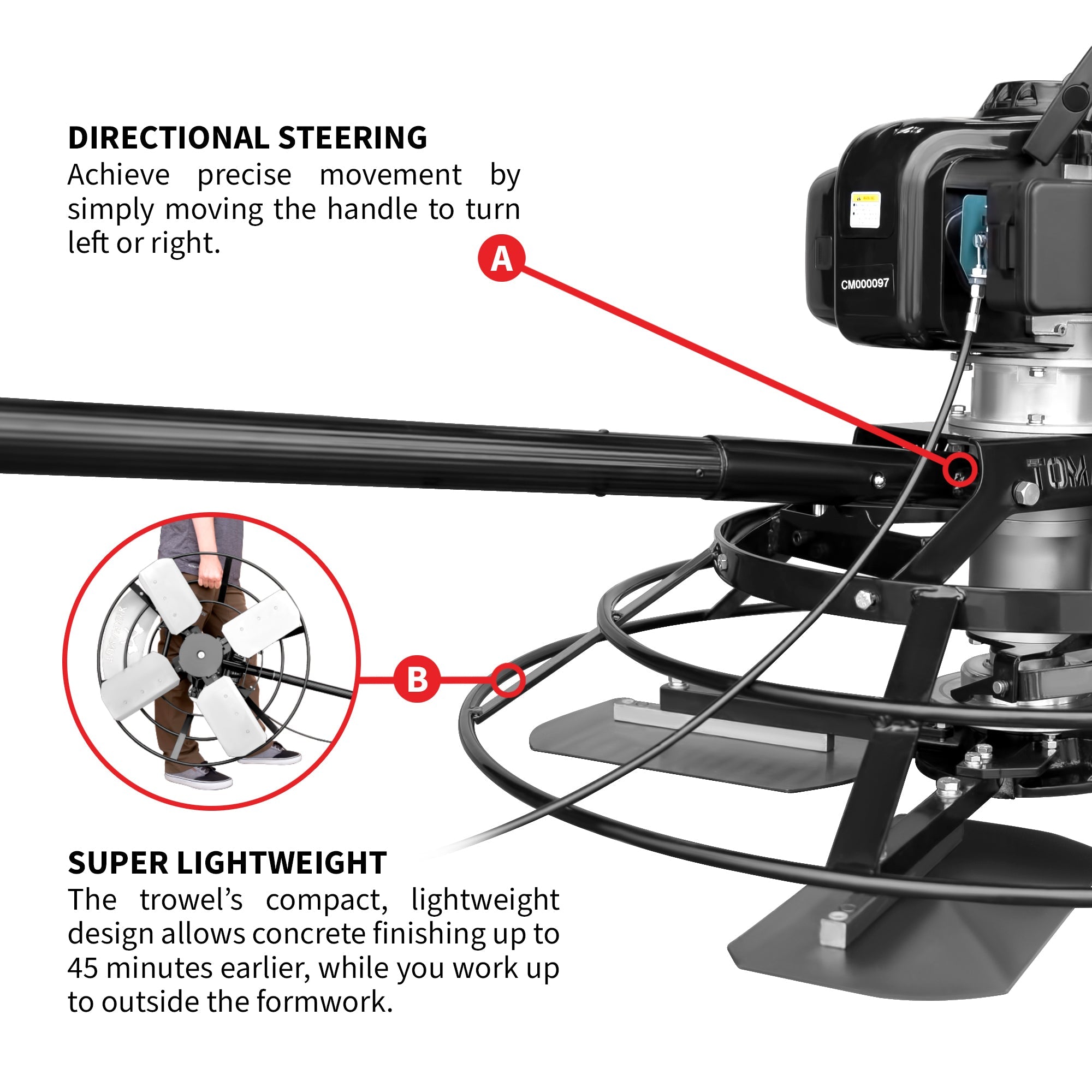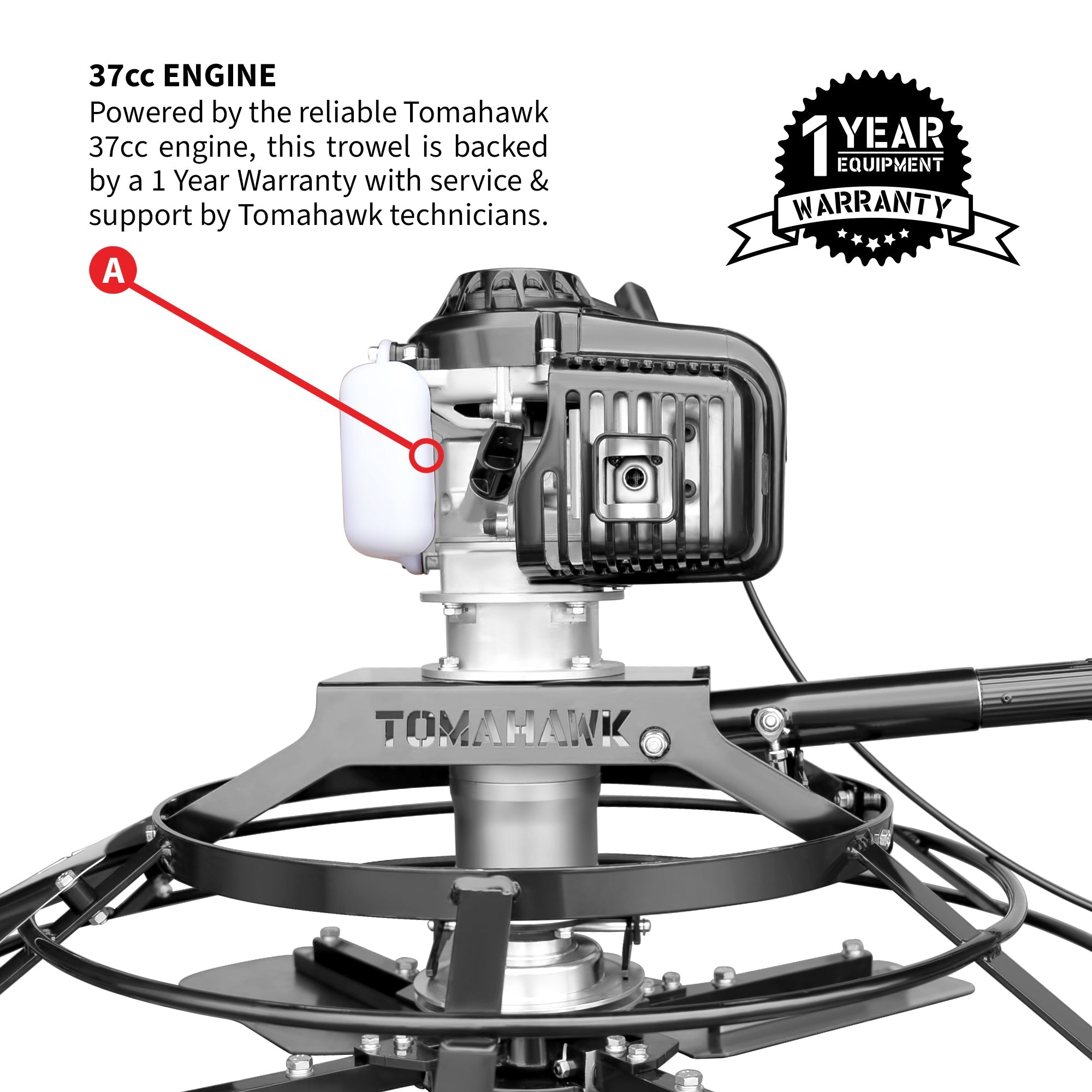 Powered by the trusted Tomahawk 4-stroke engine, this trowel offers consistent performance, easy starts, and exceptional fuel efficiency—perfect for demanding jobsites.