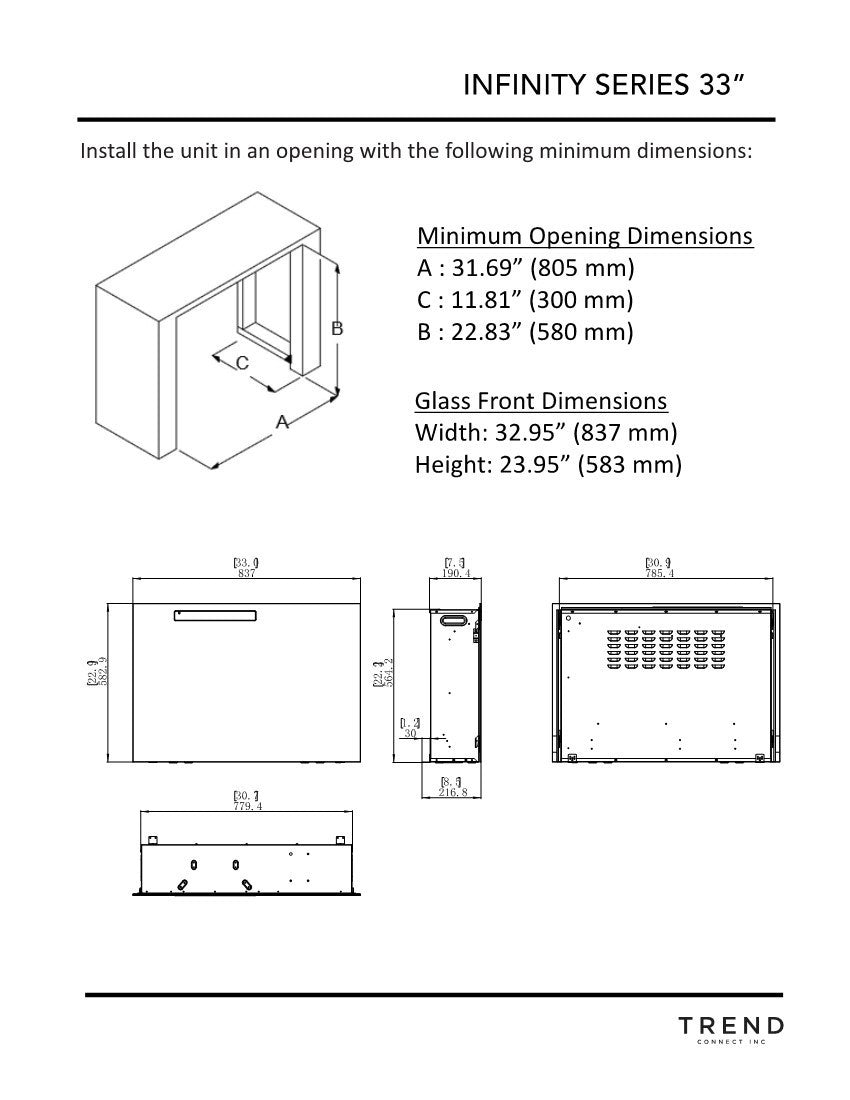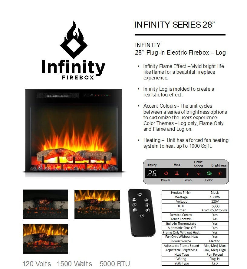 Our 33 inch Infinity firebox features realistic logs and fire and enough BTU’s to warm your space. This firebox fits our Grace Entertainment Console to make an attractive functional addition to your favorite space. Multiple heat levels including a fan only (no heat) setting, and three levels of flame all adjustable with the handy remote control.
