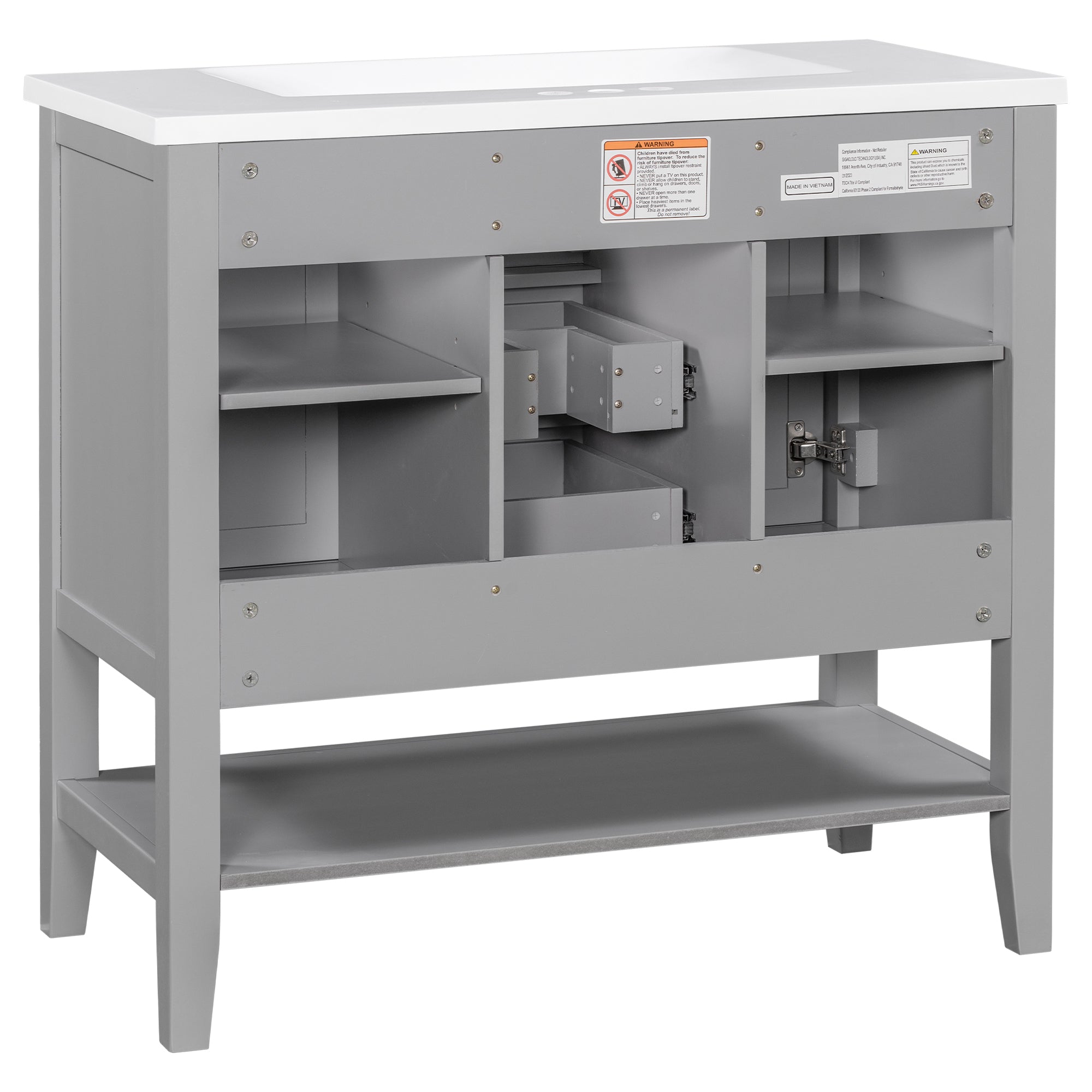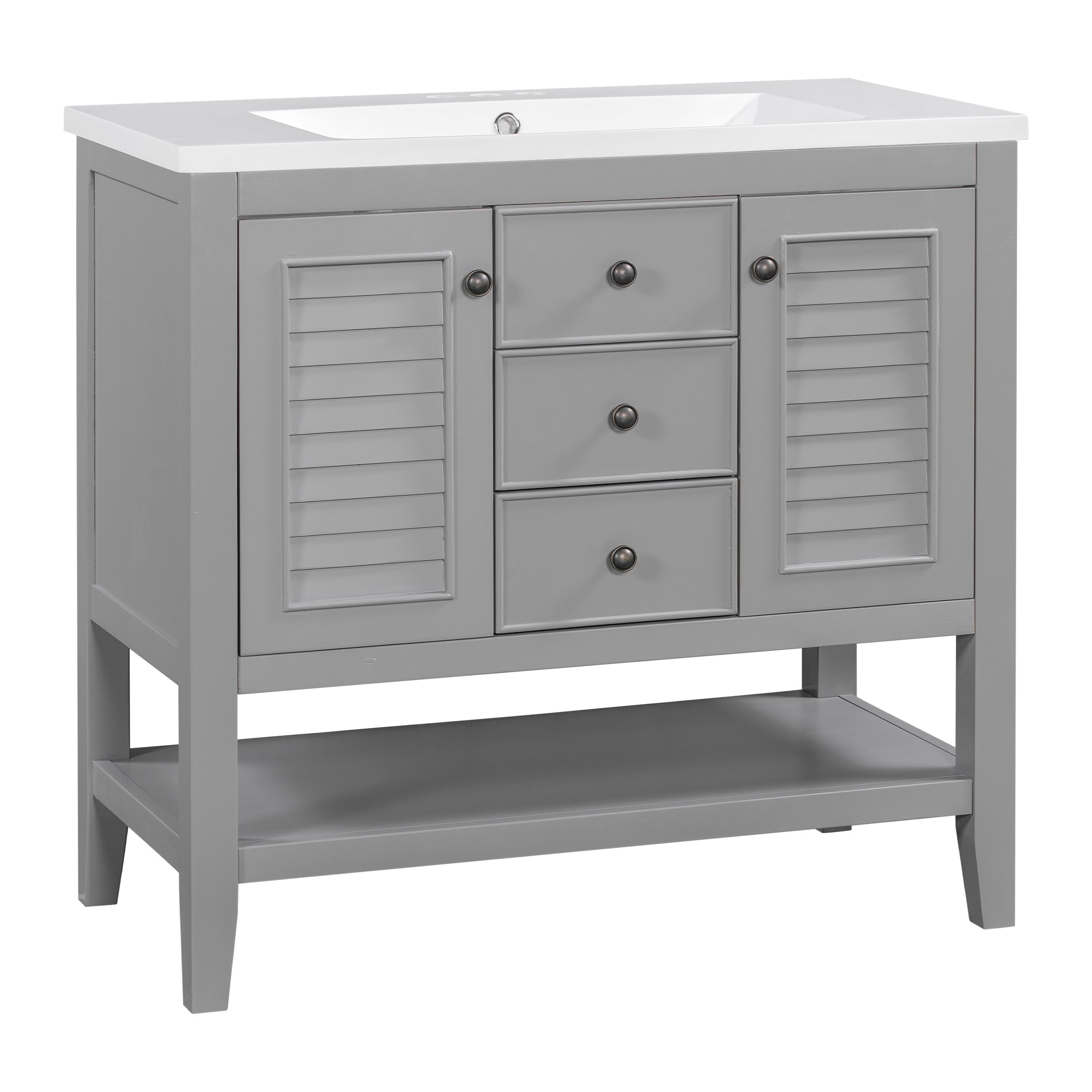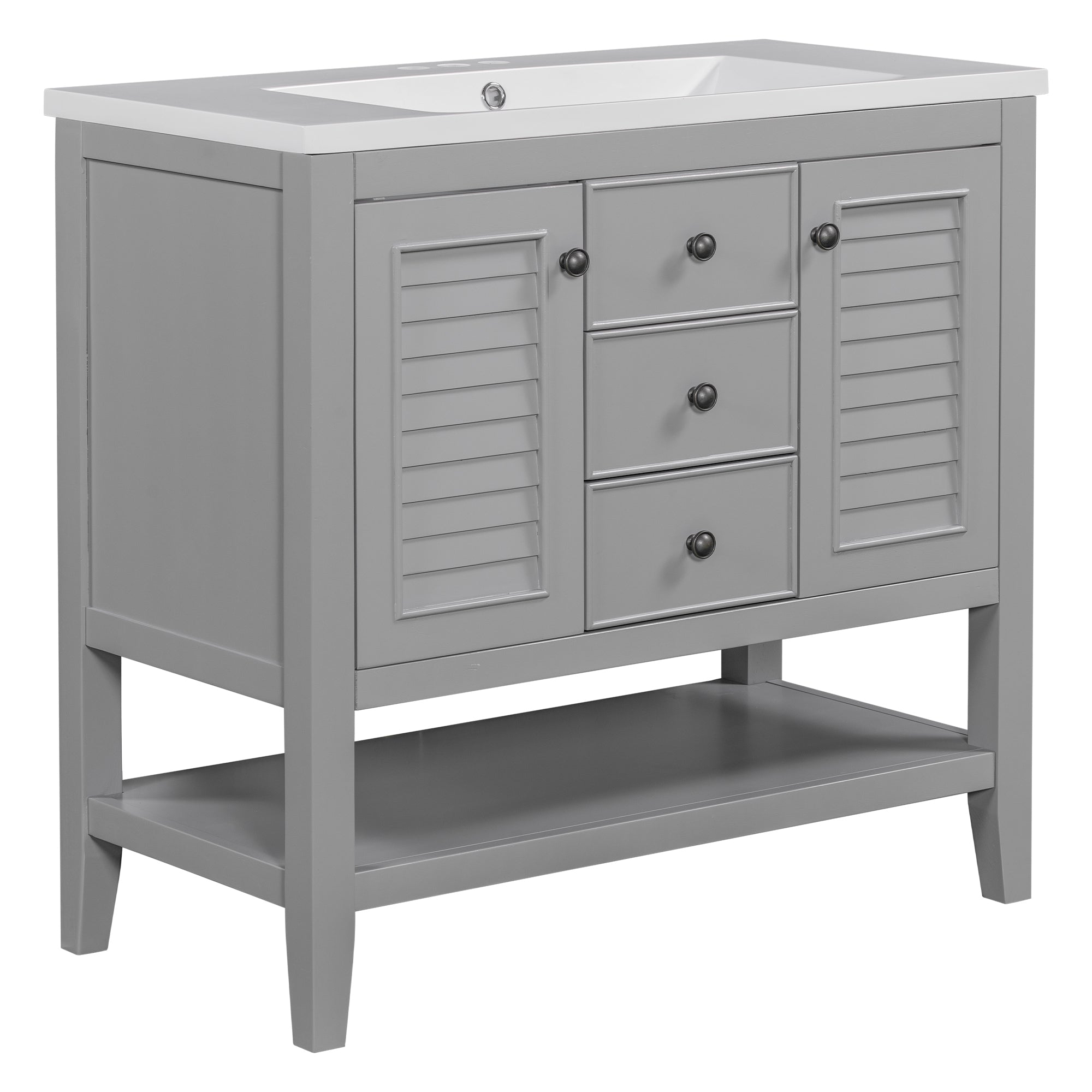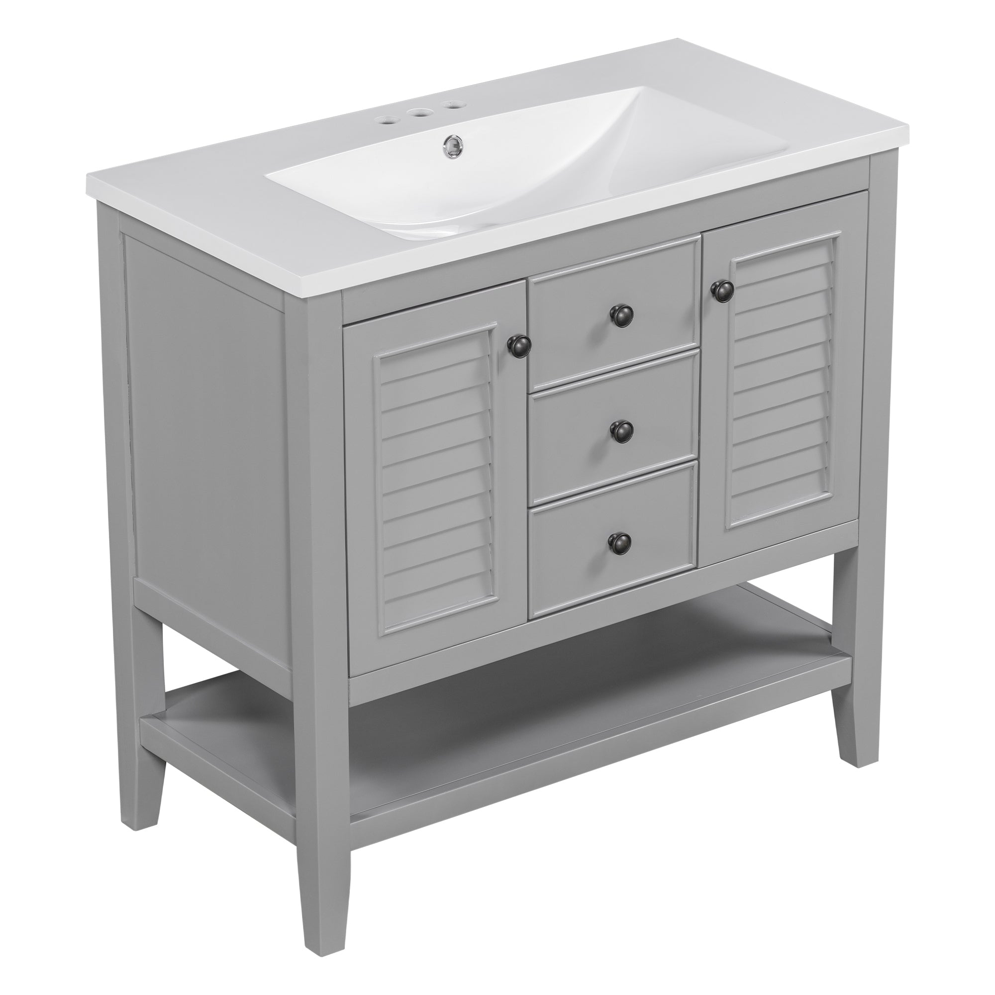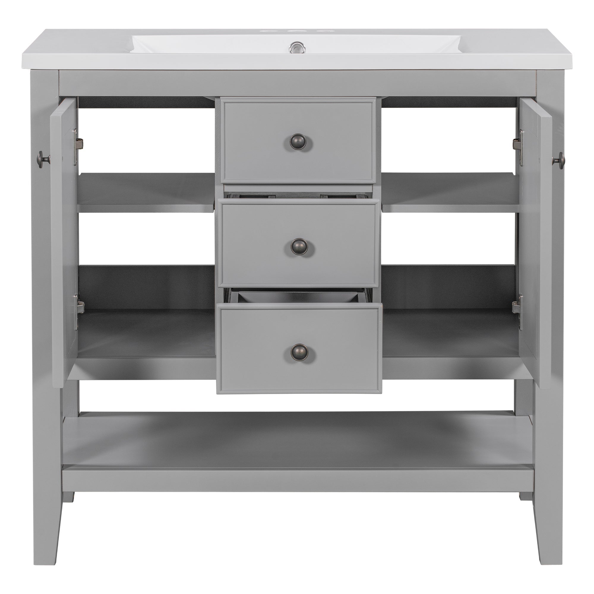 36″ Bathroom Vanity with Ceramic Basin, Two Cabinets and Drawers, Open Shelf, Solid Wood Frame, Grey