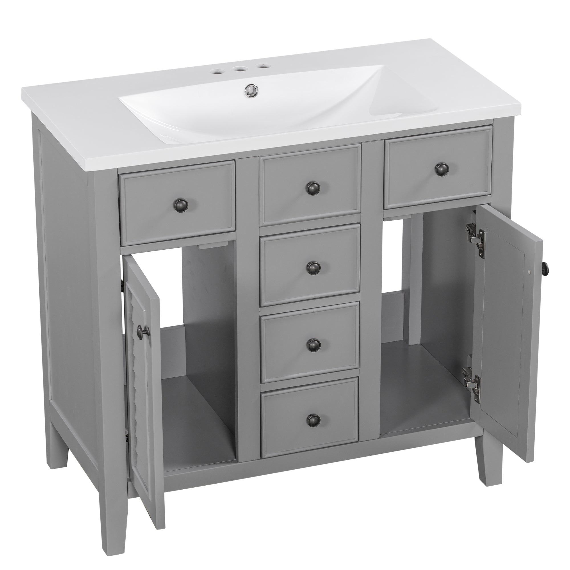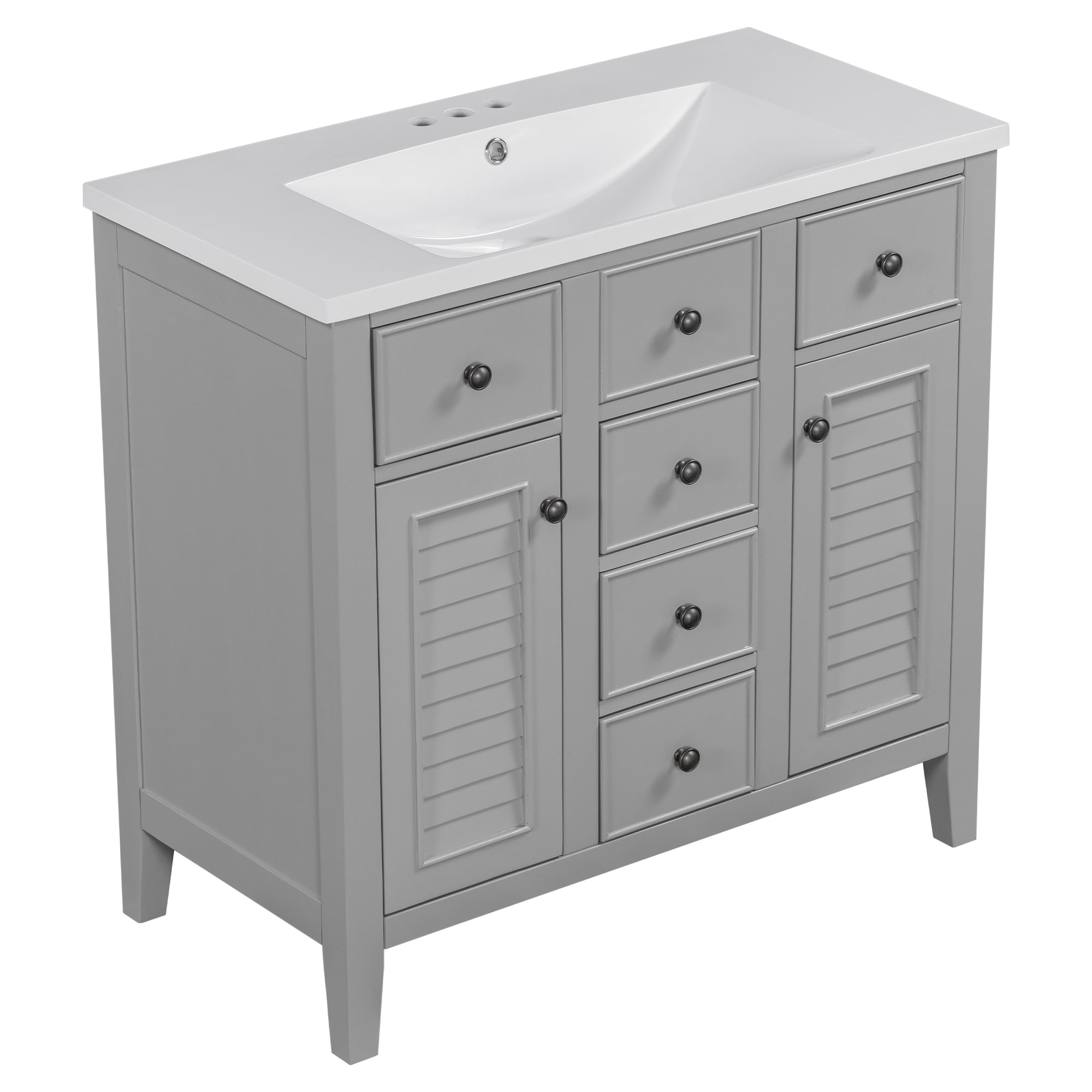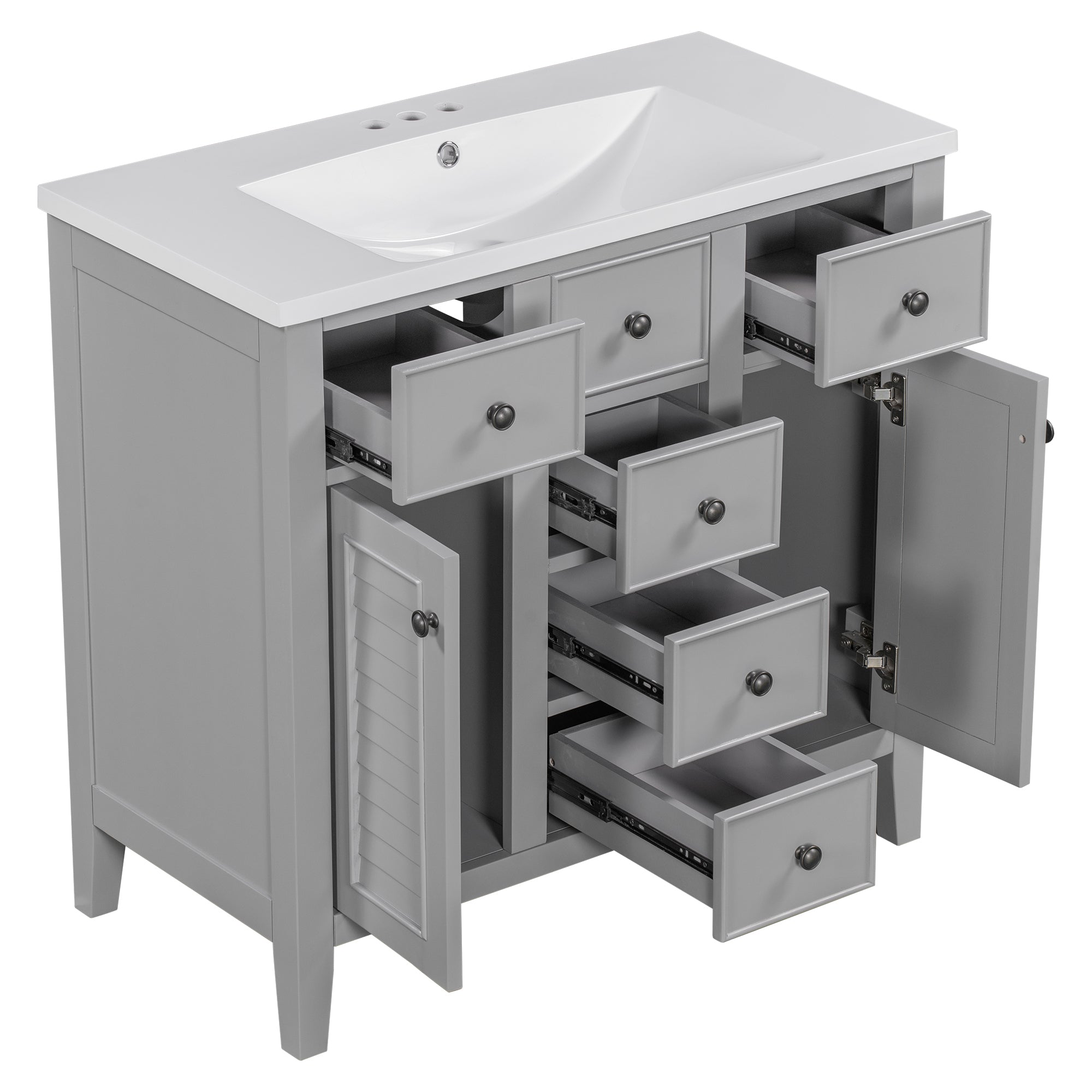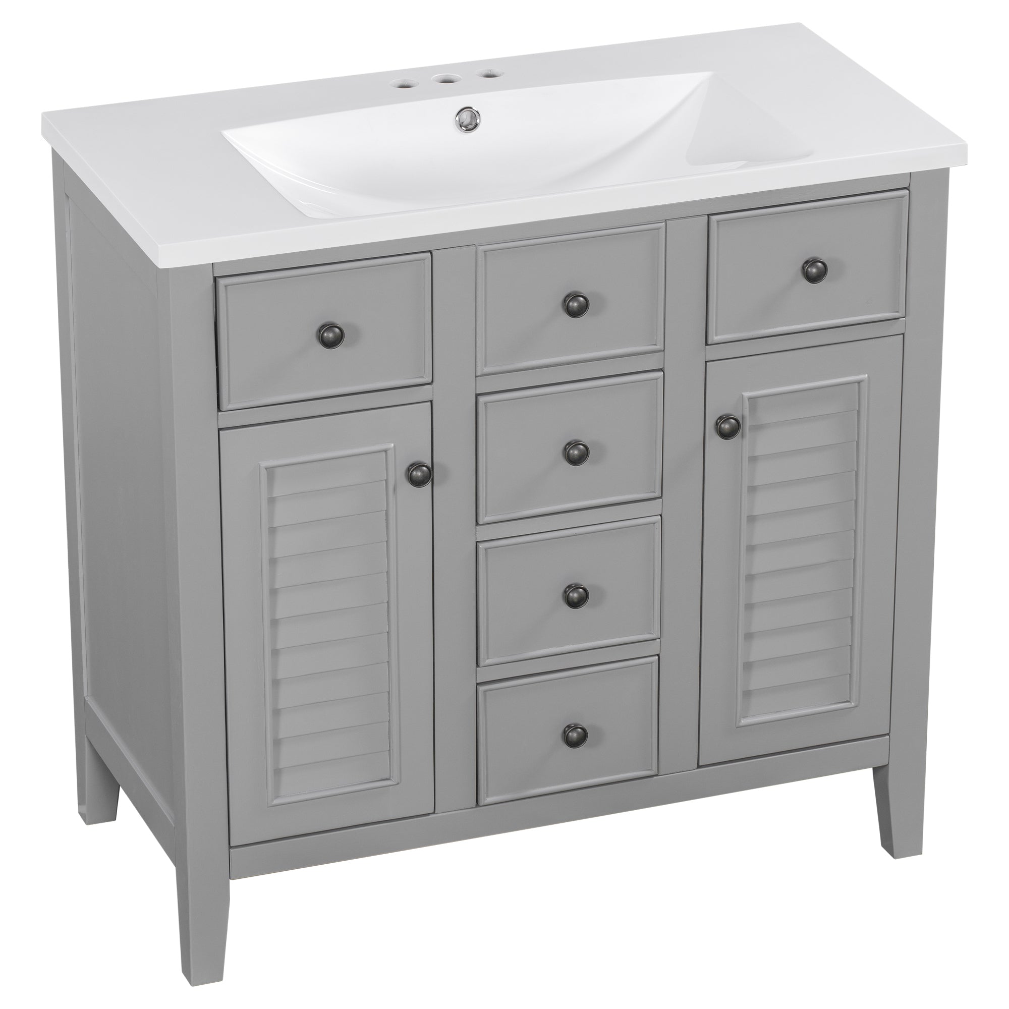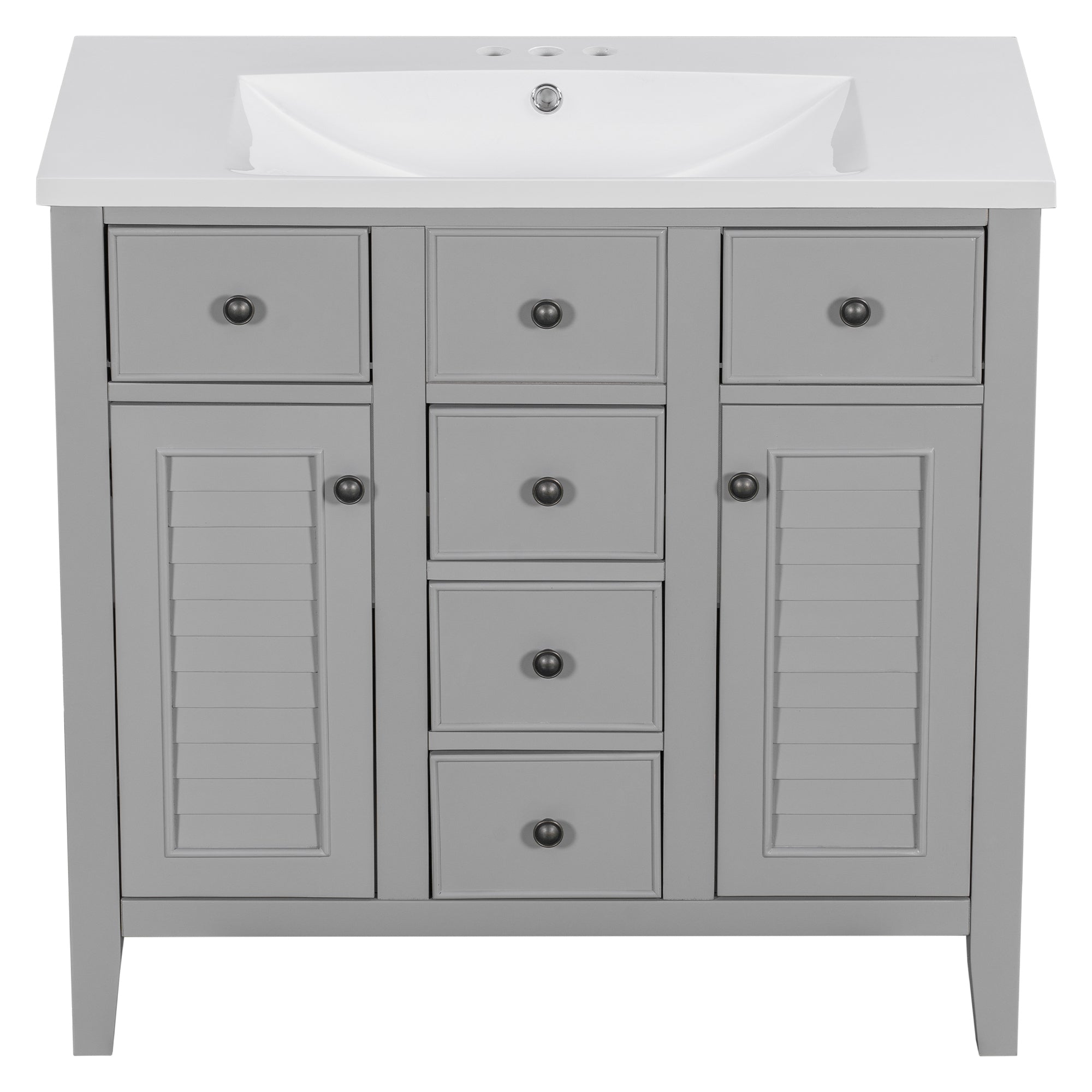 - Ample Storage Space: This bathroom basin cabinet has five drawers and two cabinets. Two larger drawers are located below the basin, and in the middle is a decorative fake drawer that cannot be opened. Three small drawers are arranged vertically under the decorative ones. On either side of the three small drawers are two cabinets, each with a louvered door. These five drawers and two cabinets can be used as storage.