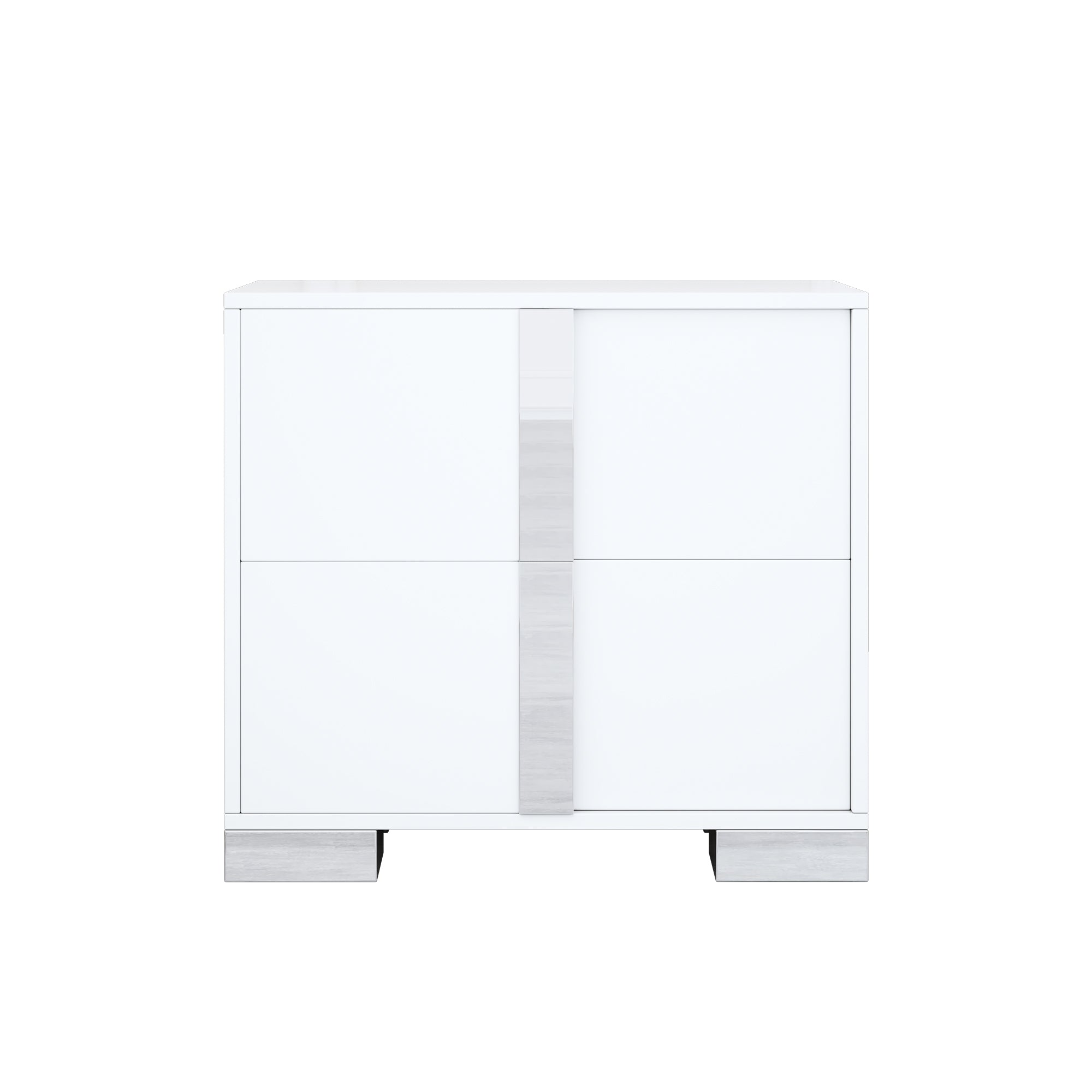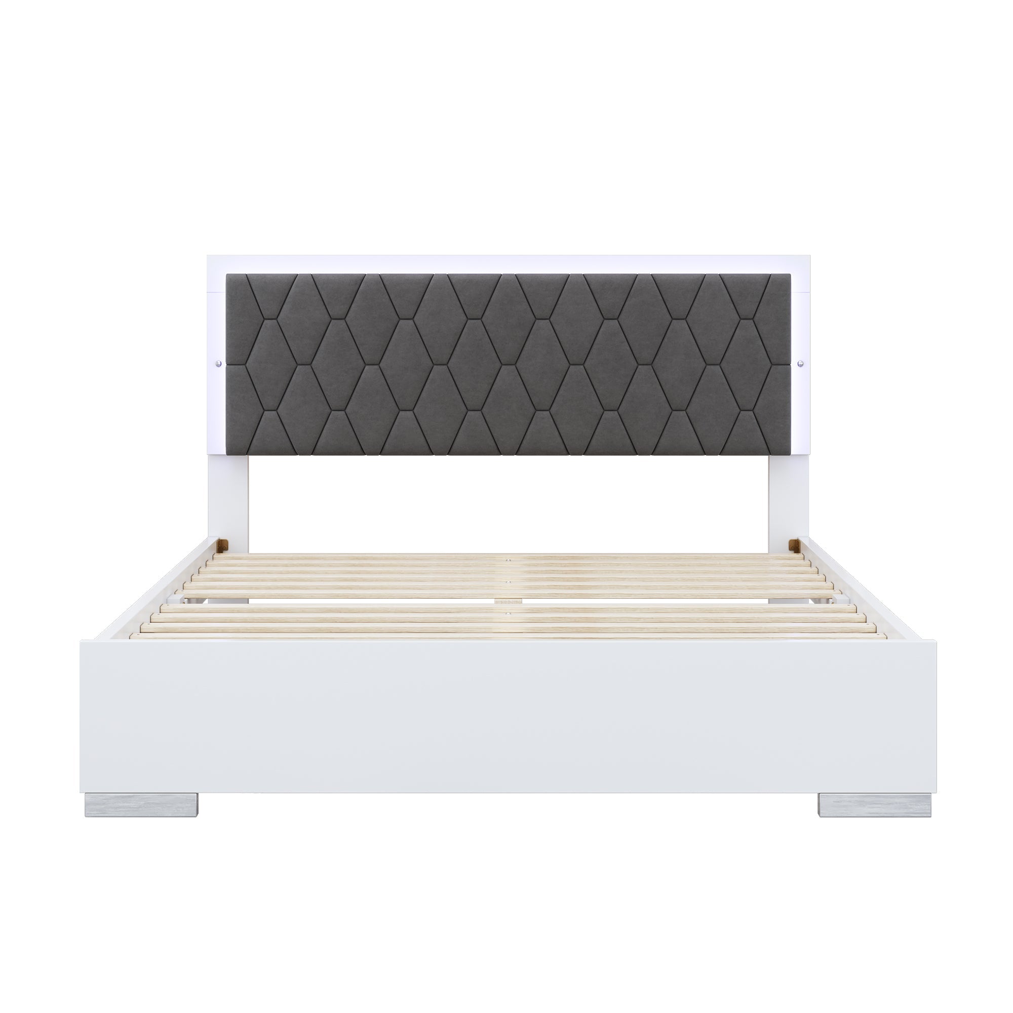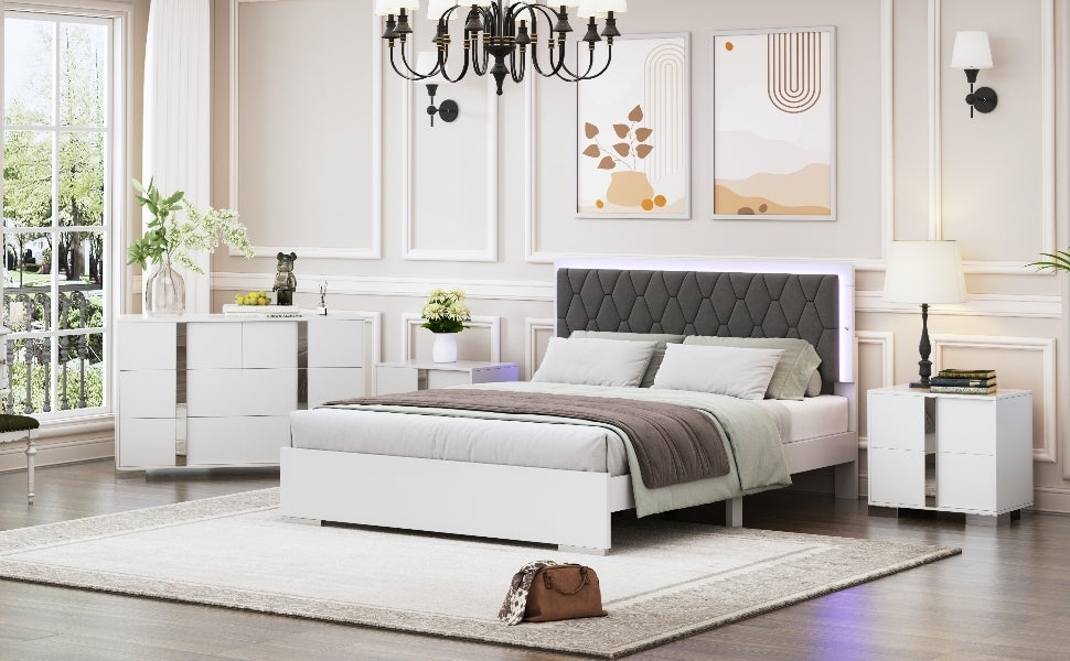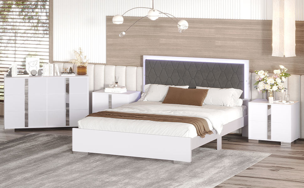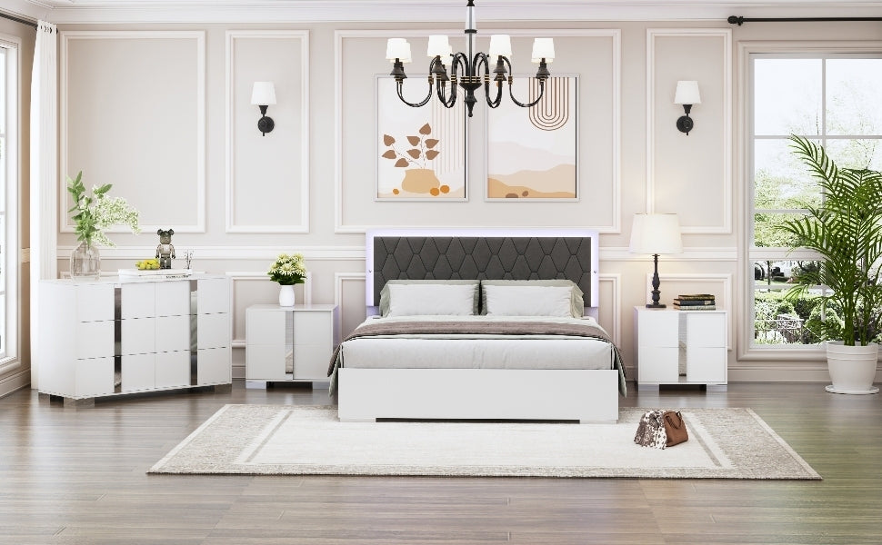 - 4-Pieces Perfect Bedroom Set: 1 queen size bed + 2 bedside tables + a chest of drawers. The modern and simple design fits the decoration style of most families. Mirror design + LED lights create a warm sleeping environment.