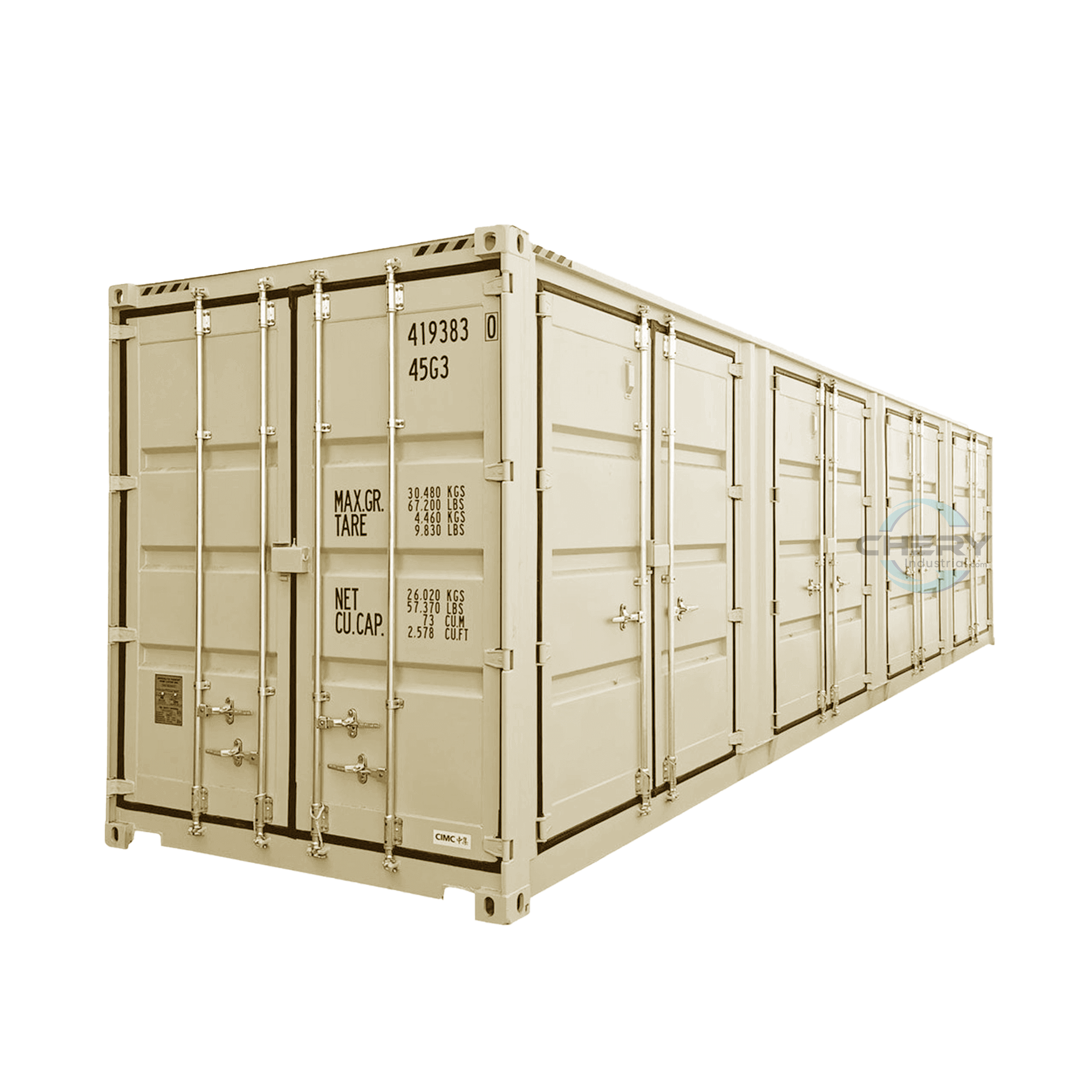 This 40ft container with 4 side doors is used for intermodal freight transportation, meaning the shipping containers can work without unloading and reloading their cargo. The shipping containers are also known as intermodal containers, cargo, freight containers, ISO containers, ocean containers, sea containers, sea vans, sea cans, and c cans. 90% of containers in the market are standardized, and they are called dry freight and general-purpose containers. Most of them are 8 feet wide and of either 20 feet or 40 feet standard length and 8 feet 6 inches high. Also, High Cube HC or HQ containers are 9 ft 6 inches in height.