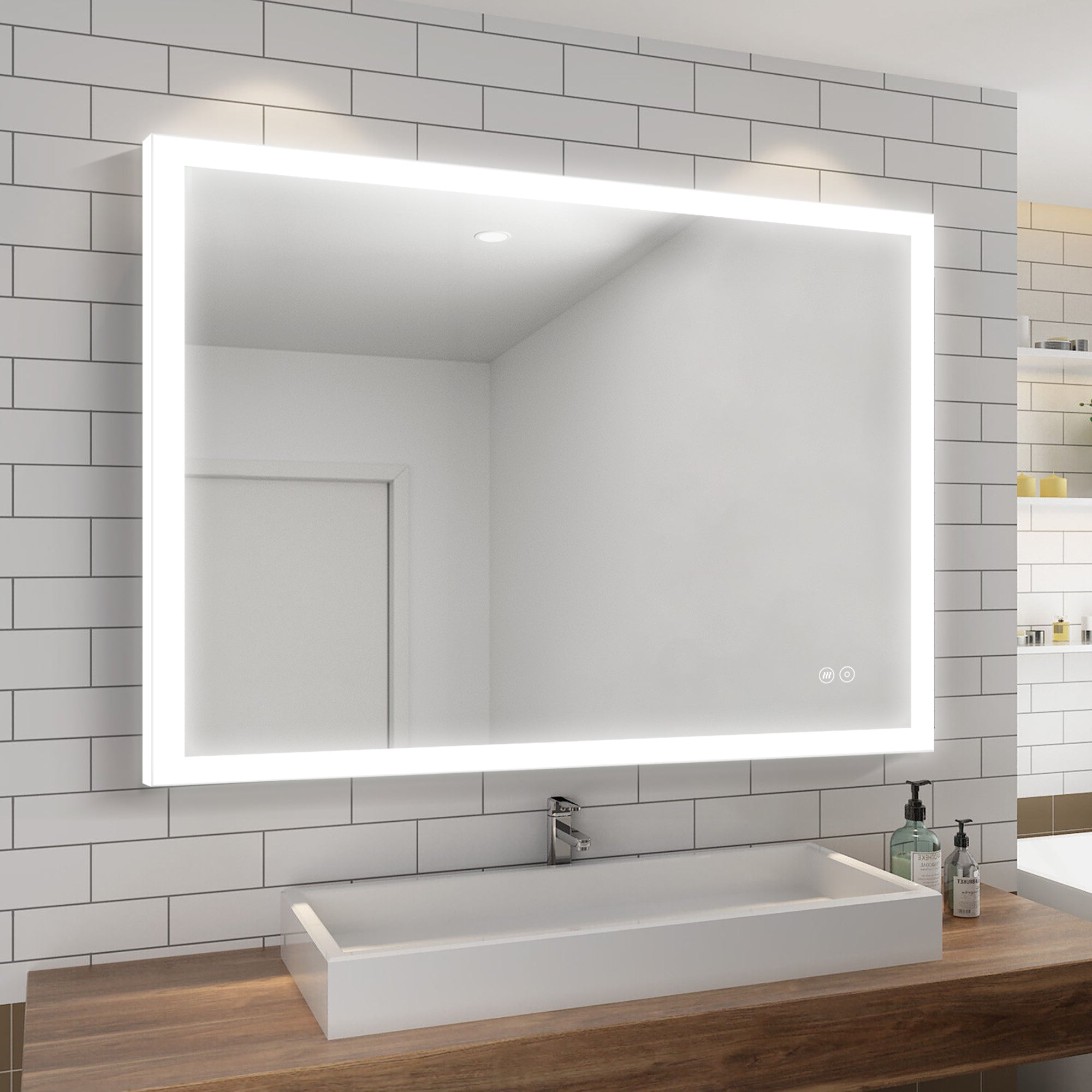 This LED illuminated mirror is multifunction. You can press the button to change the color temperatures 6000K CCT. Dimmable 100%-10% function allow you dim the bright to your comfortable level. The brightness and light color state are restored when the mirror is powered off.
