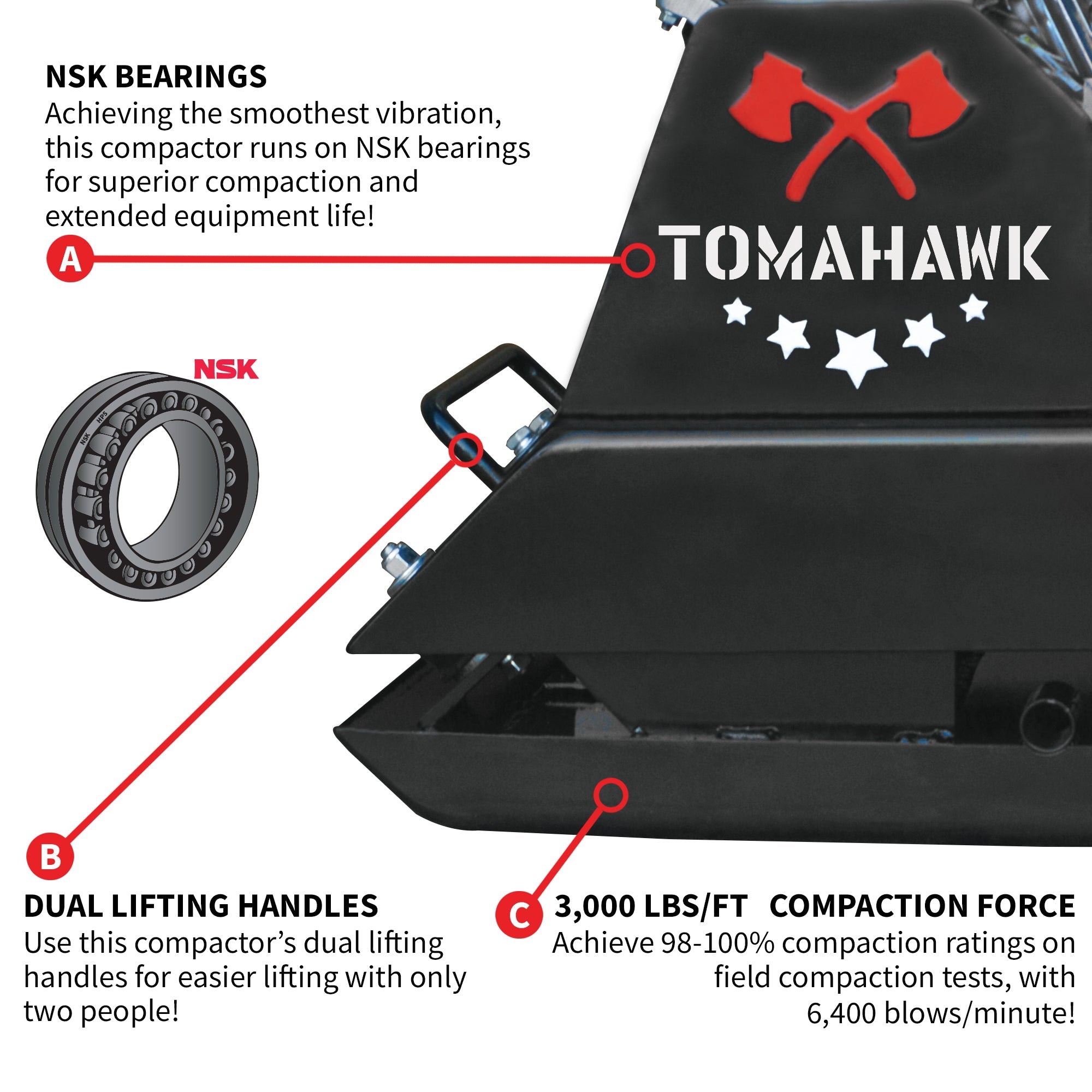 - Compaction force of 3000 lbs. per square ft. at 6400 blows per minute