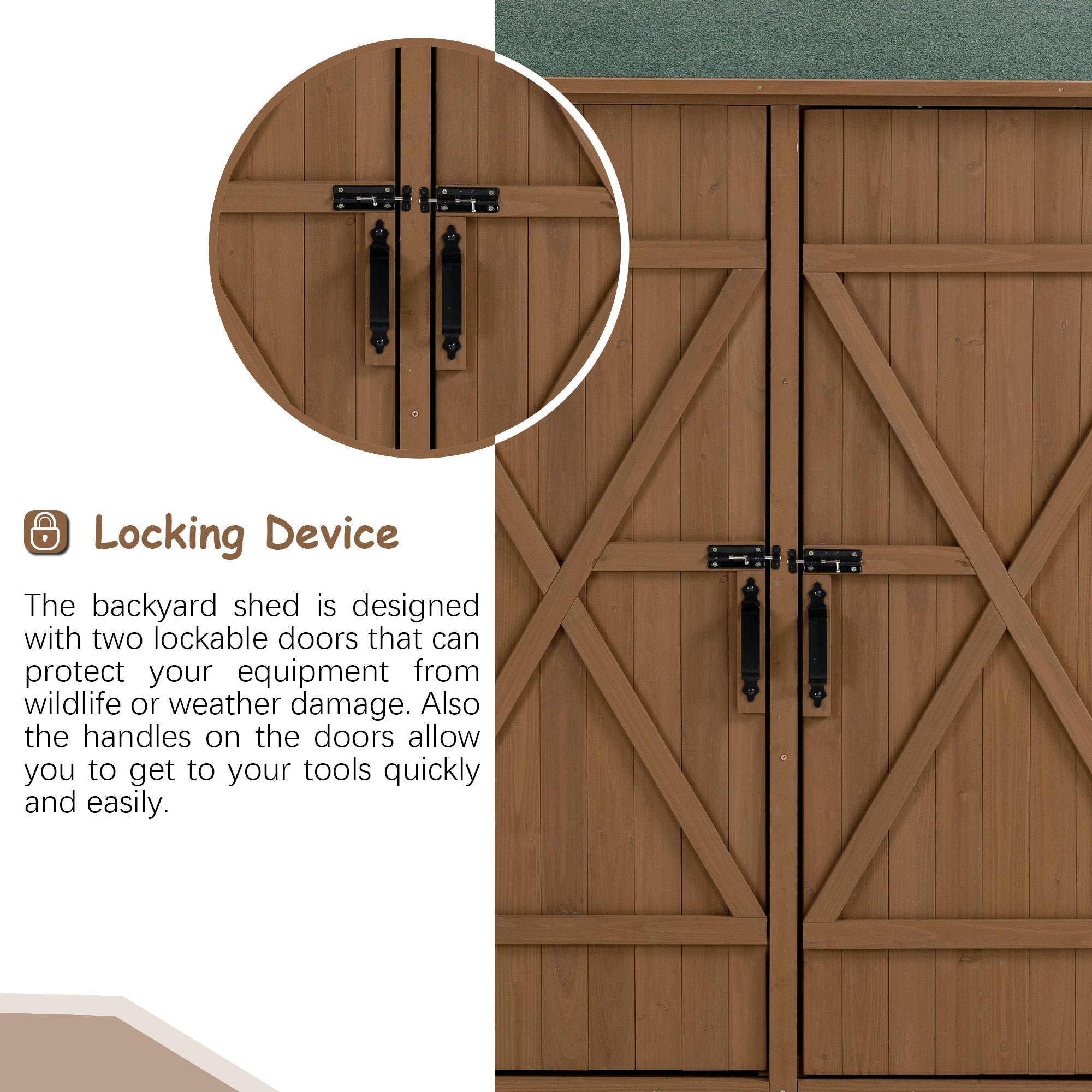 - [Safe Lockable Door]This garden storage shed is equipped with double doors, the metal latch can lock the doors to prevents tools from falling off the shelves. two metal hinges connect the doors to open flexibly.