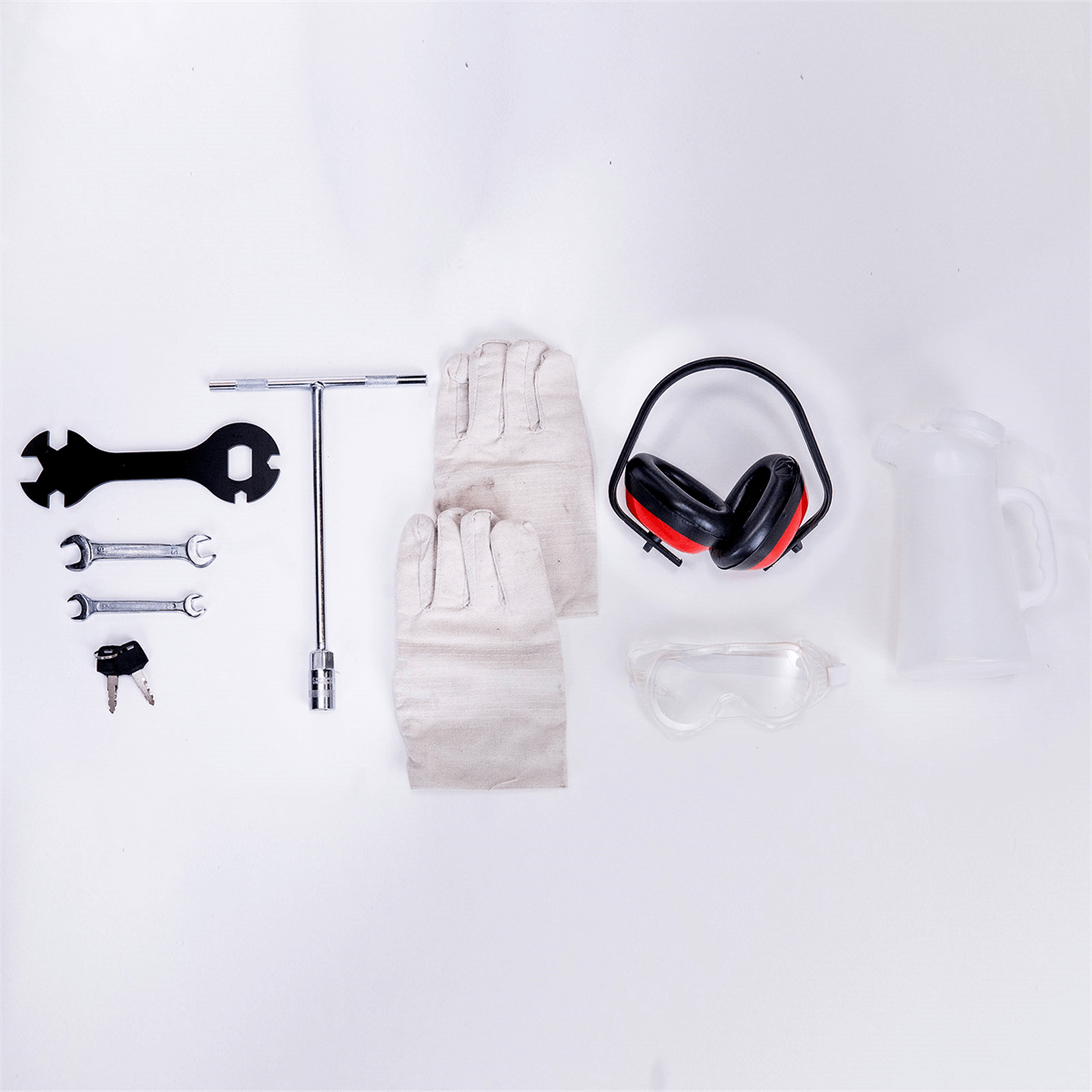 - The safety kit includes tools, glasses, ear protection, and gloves.