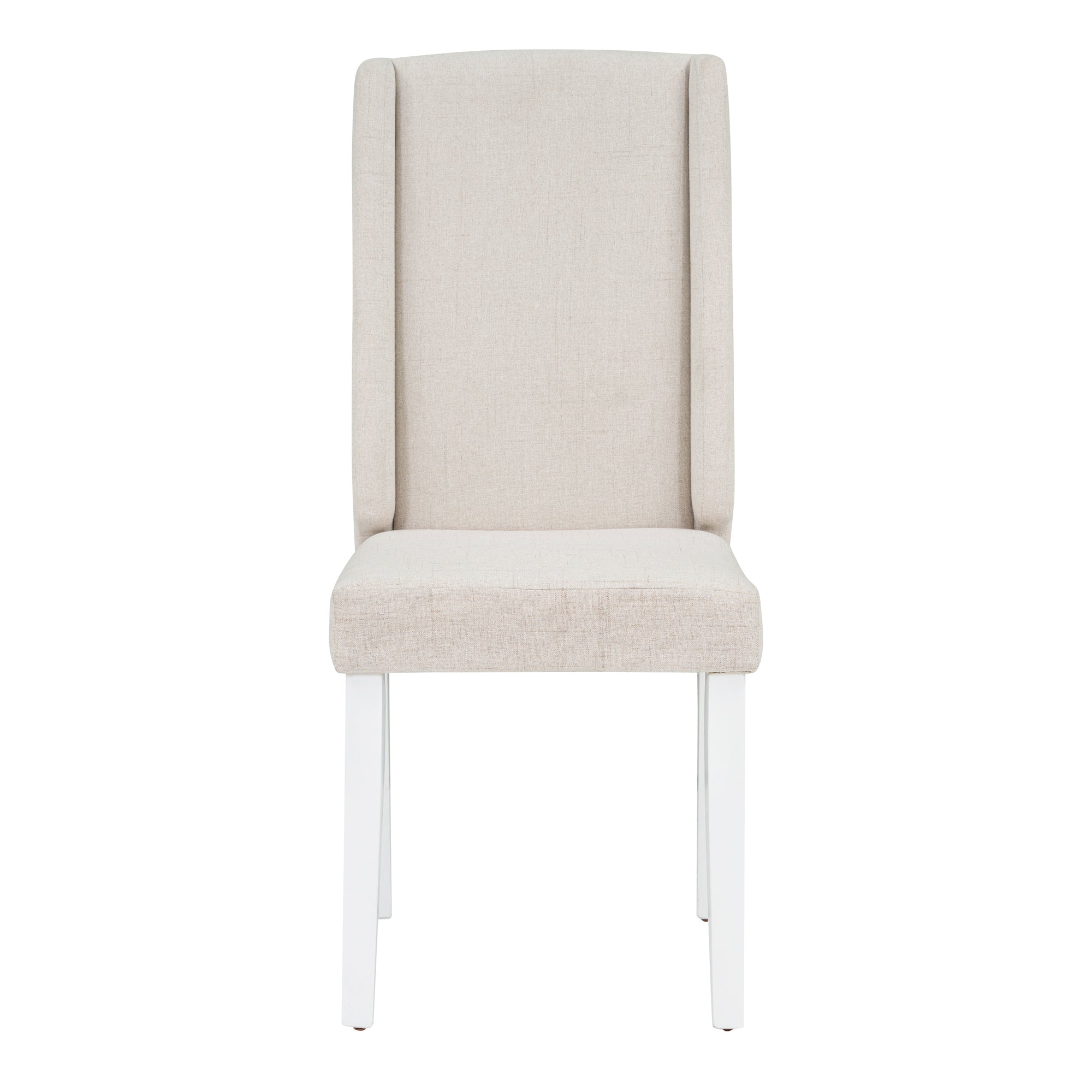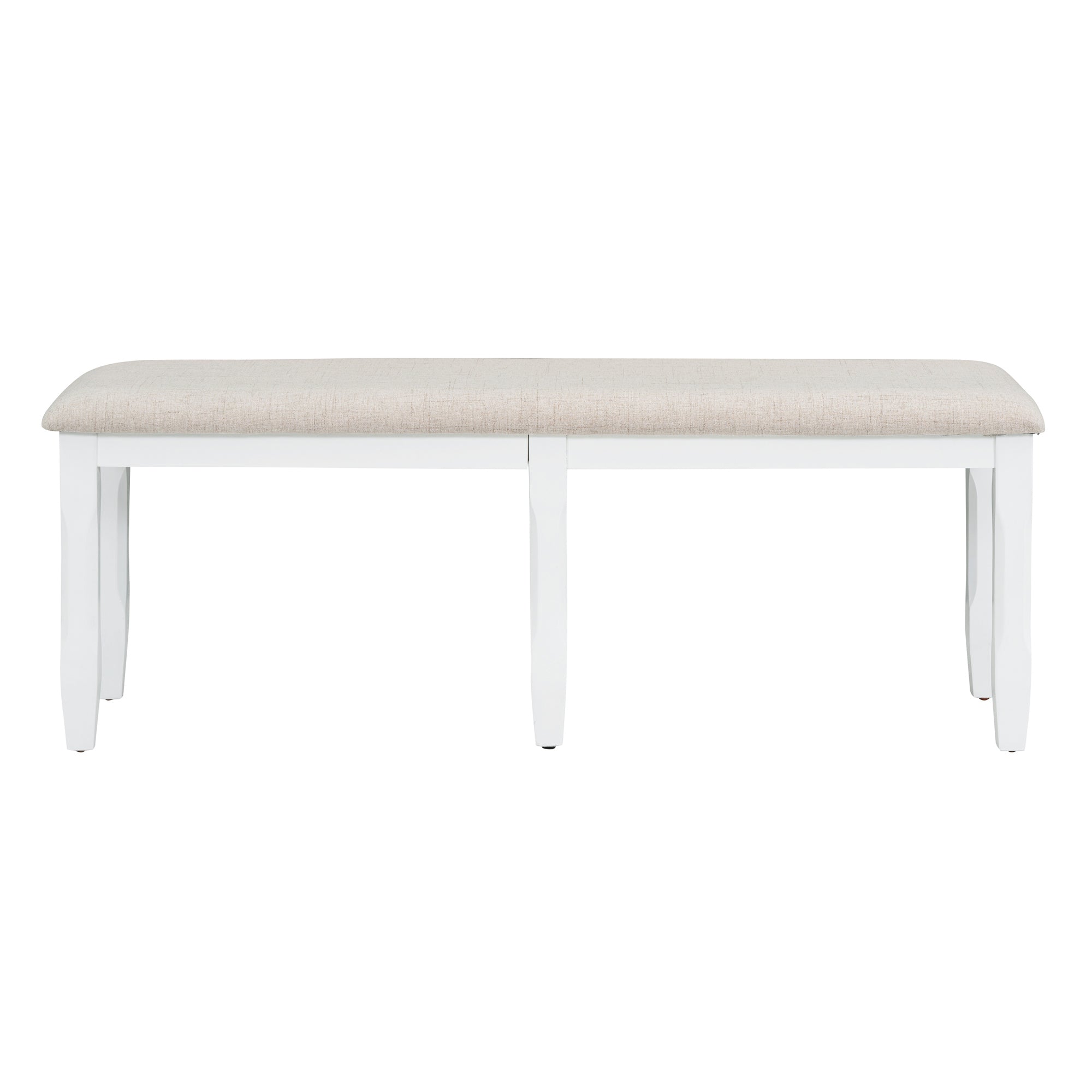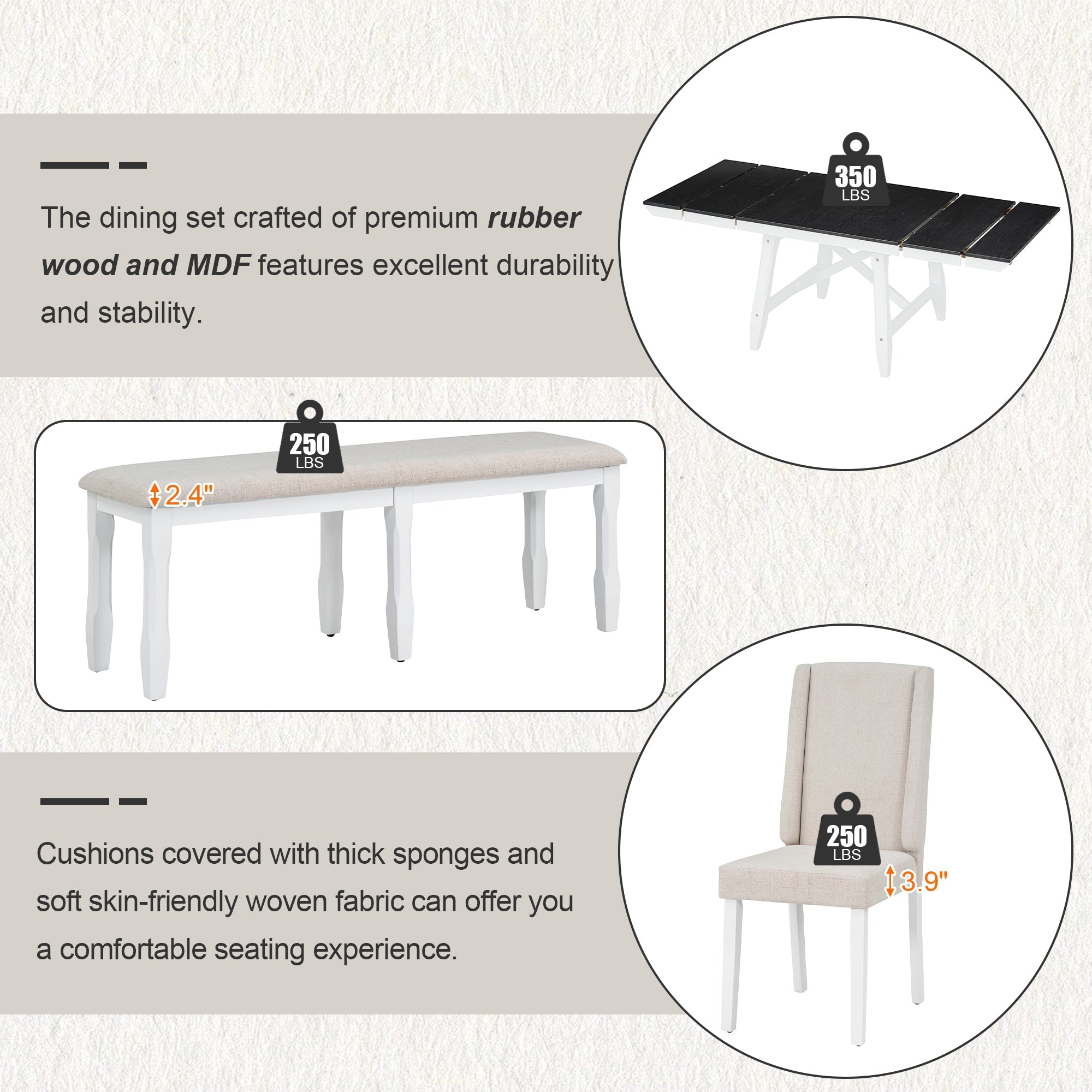 - The wing back element gives this dining chair set a retro look and adds comfort. The main structure of these chairs is made of rubber wood to ensure stability in daily use. Four chairs and the bench use woven fabric as the wrapping material for backrest and cushion, and the 100% polyurethane foam pad as the filler. The bench legs are in the design of 4 sided square taper and an irregular eight-angular prism, exuding a remarkably delicate and elegant flair.