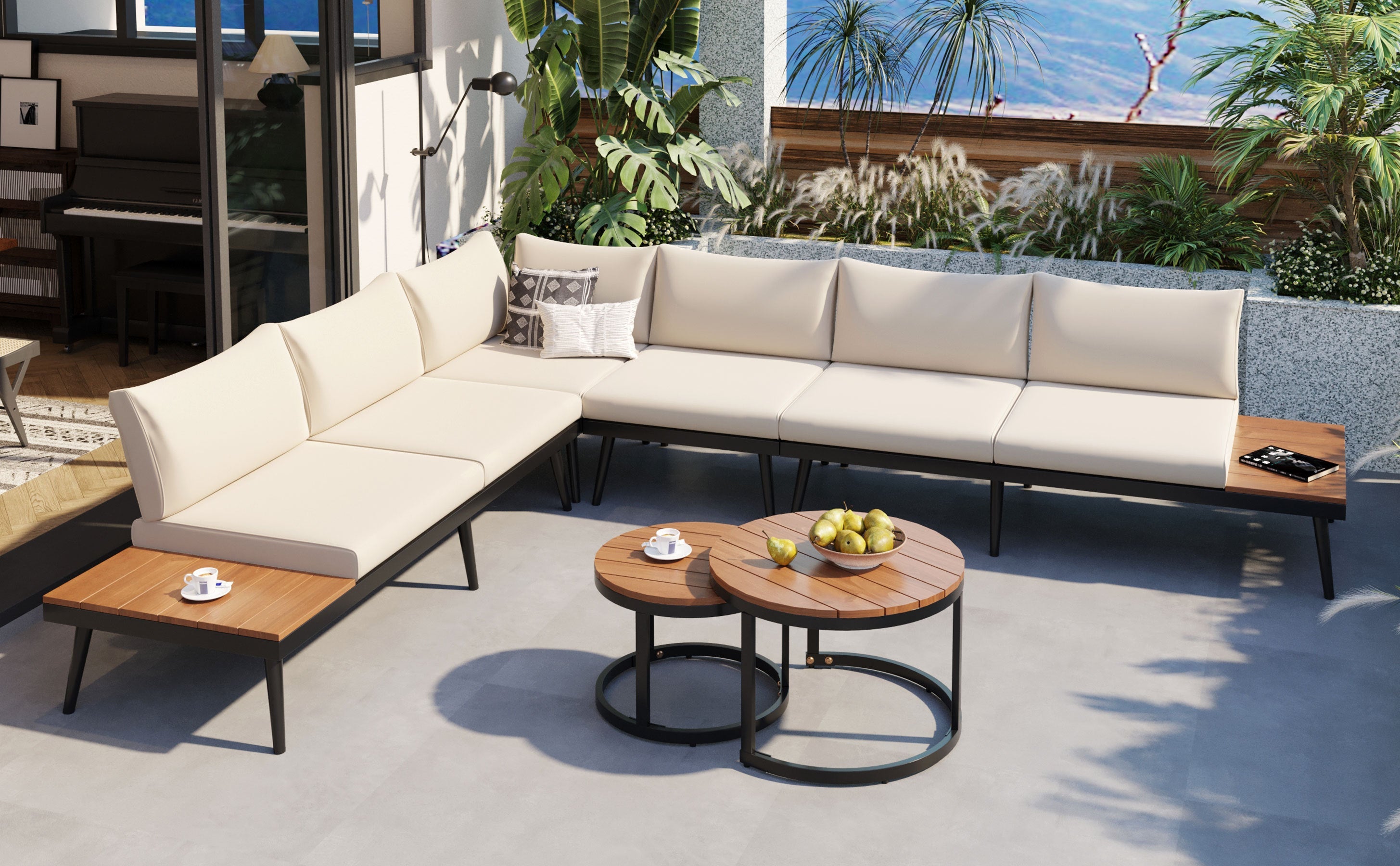 - Charming Modern Style: Soft sofa set and a sophisticated wooden coffee table add a functional and stylish element to your patio. The color of acacia wood is paired with gray or beige upholstery. The striped wooden table top also brings a natural and rustic feel. This modern patio sectional sofa set creates a strong summer atmosphere. It will become a great decoration that suits your outdoor style.