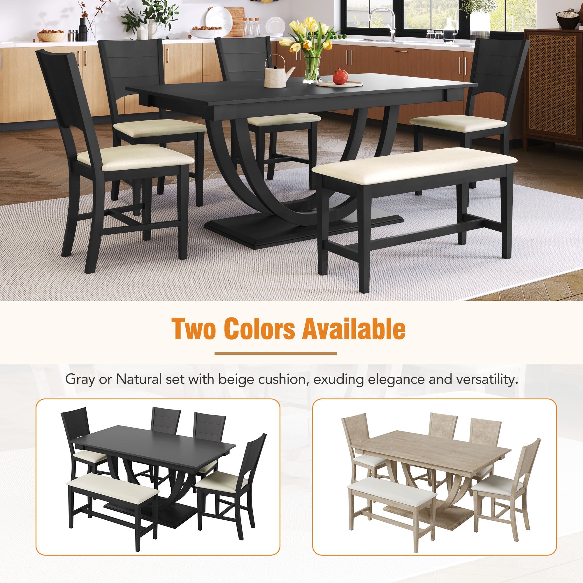 - [Modern Dining Set for 6] Experience a harmonious blend of modern and traditional design with our 6-piece solid wood dining set. This collection comprises a rectangular table, four chairs, and a bench, all uniquely distinguished by half-round table legs. Each chair and bench seat is lavishly padded, offering both comfort and style. Ideal for accommodating up to six, this set elevates your dining space, making a statement in any interior.