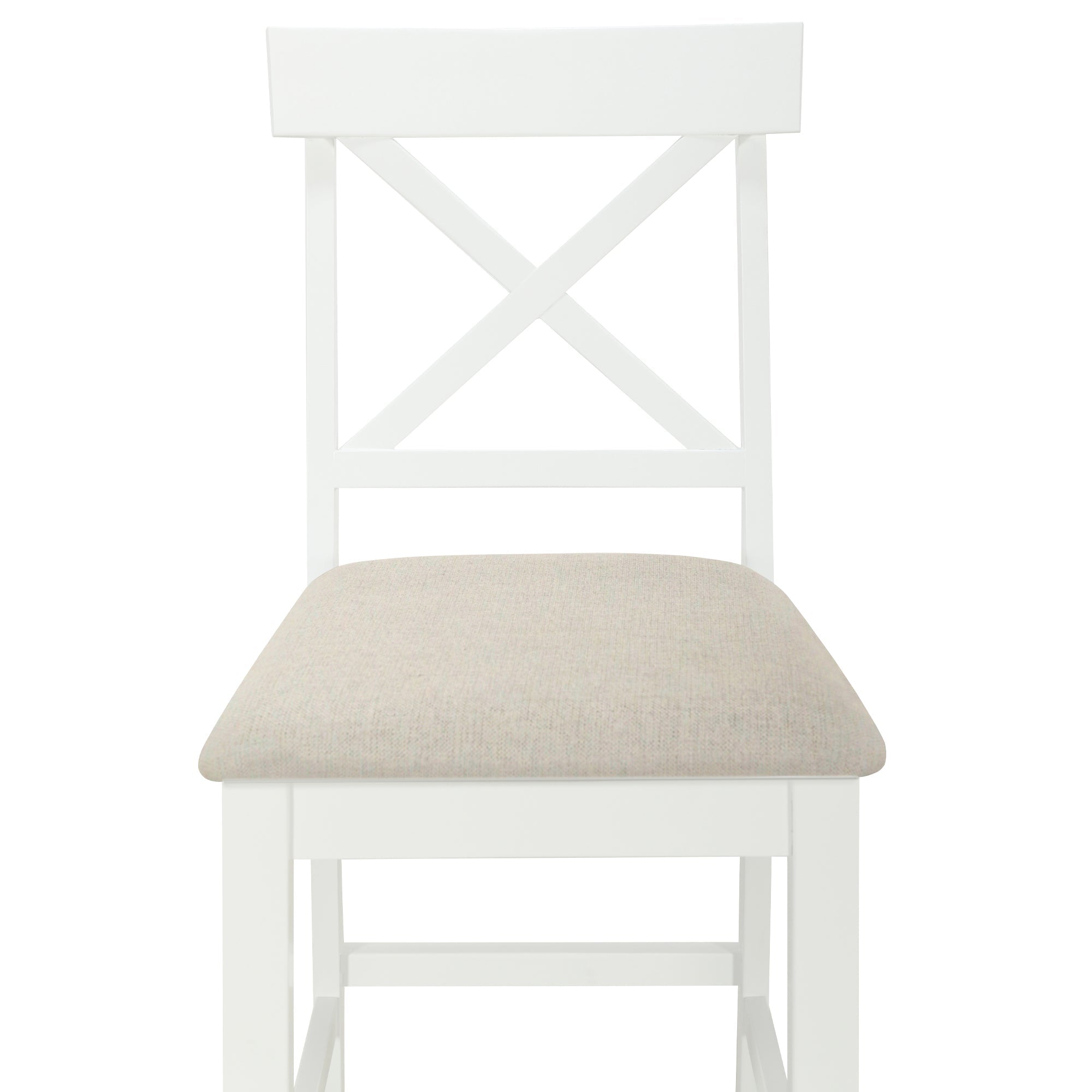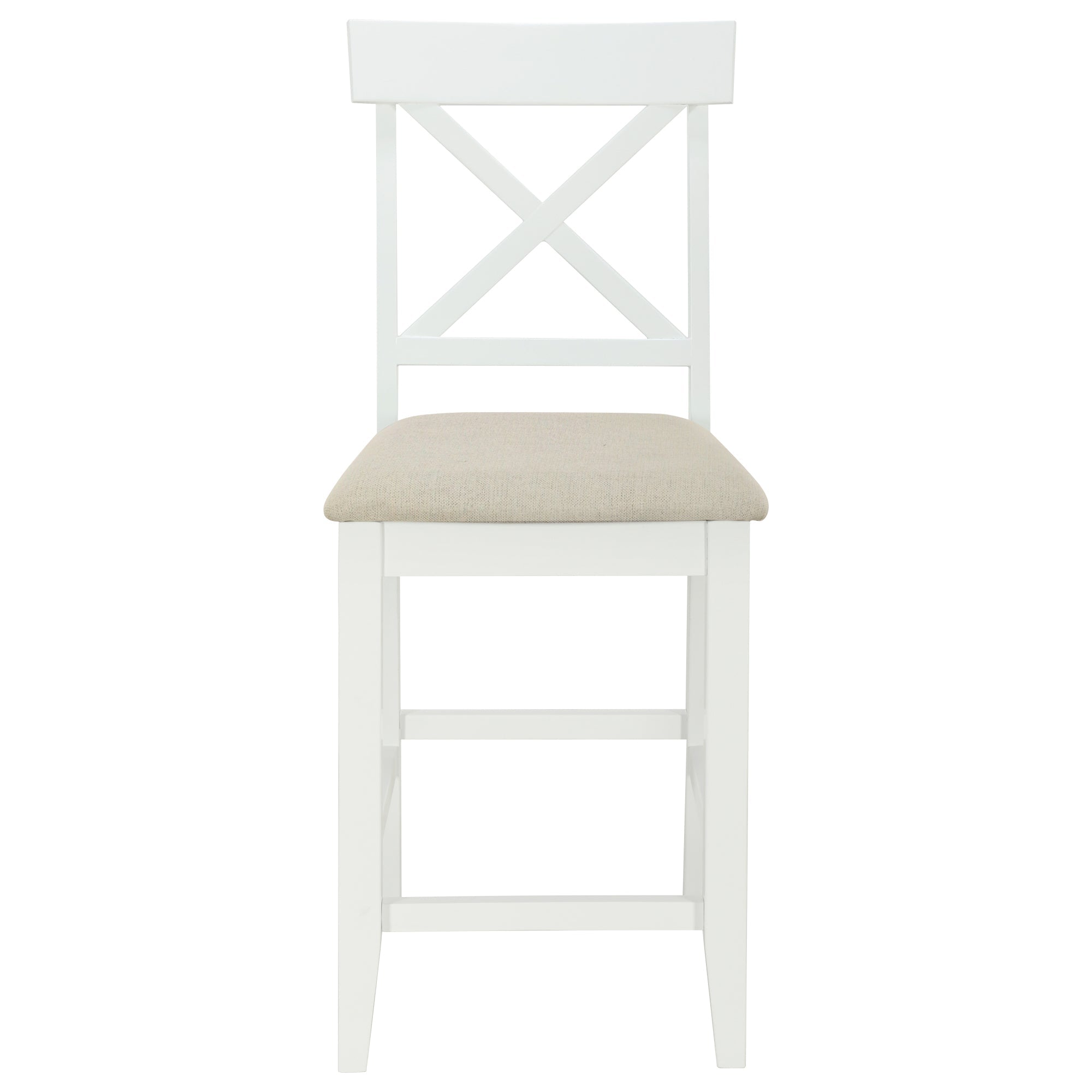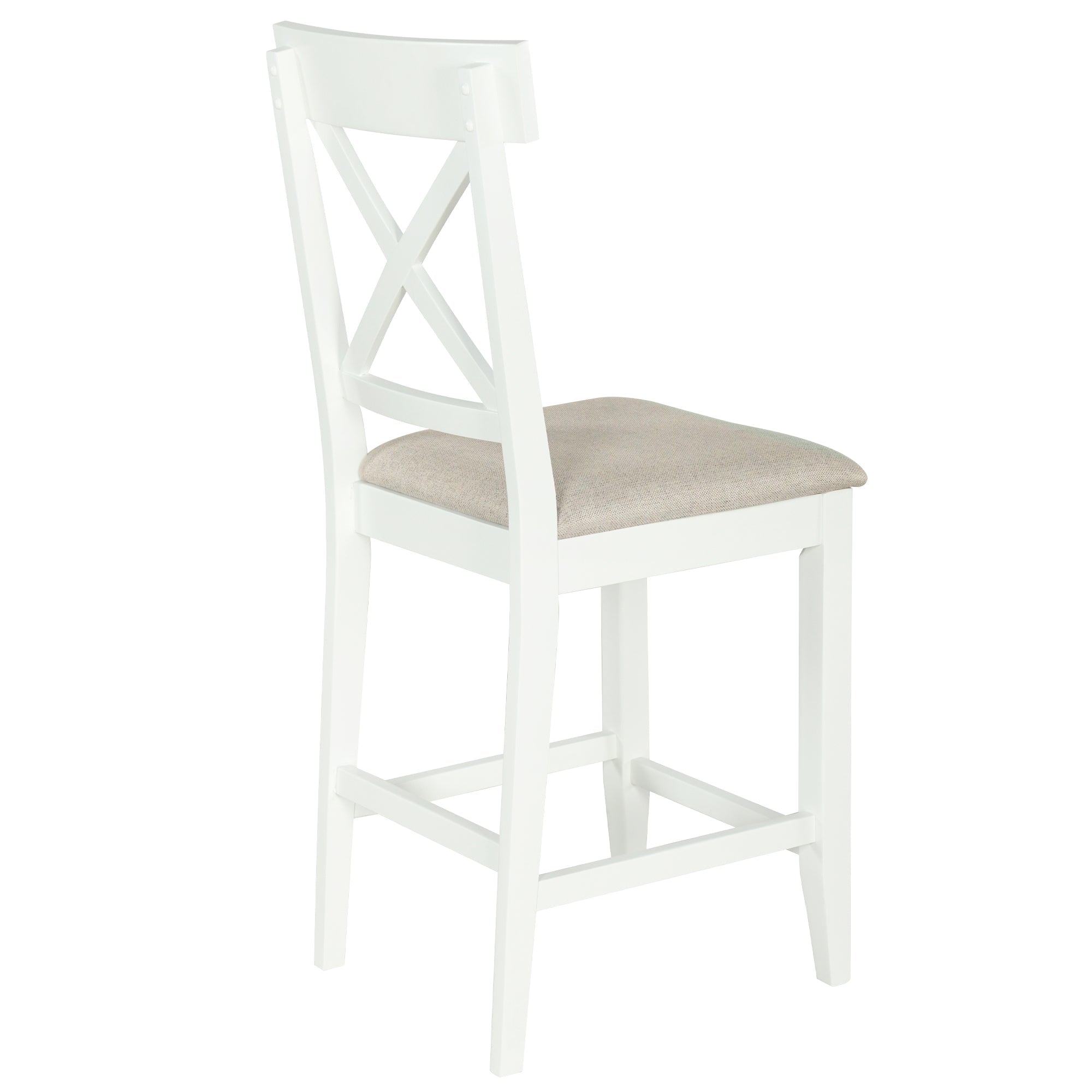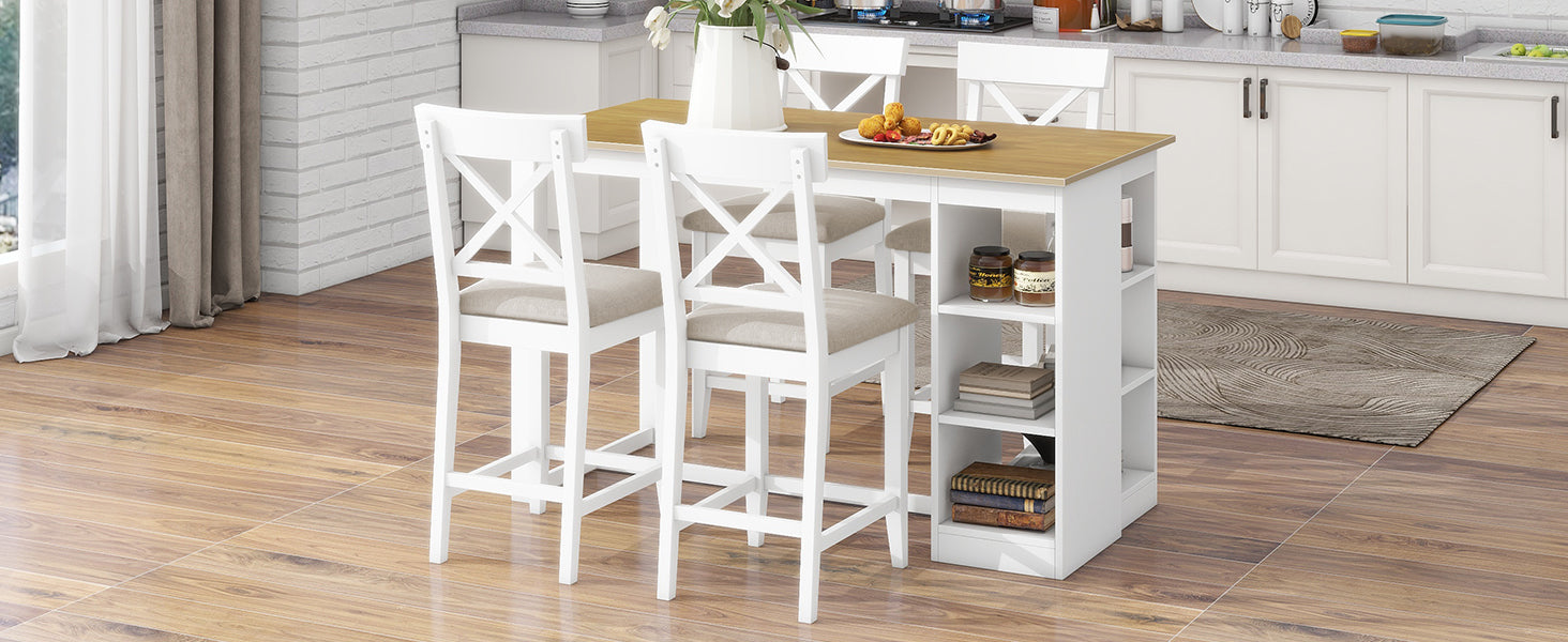 | Highlights | Farmhouse Style // Solid Wood // Counter Height // 2-Tone Design // Half-Open Side Storage Shelves // 3 Tiers // Long Stretcher under Top // Cross Back Dining Chair // Padded Cushions // Footrests // Dining Set for 4 // 2 Colors Available |