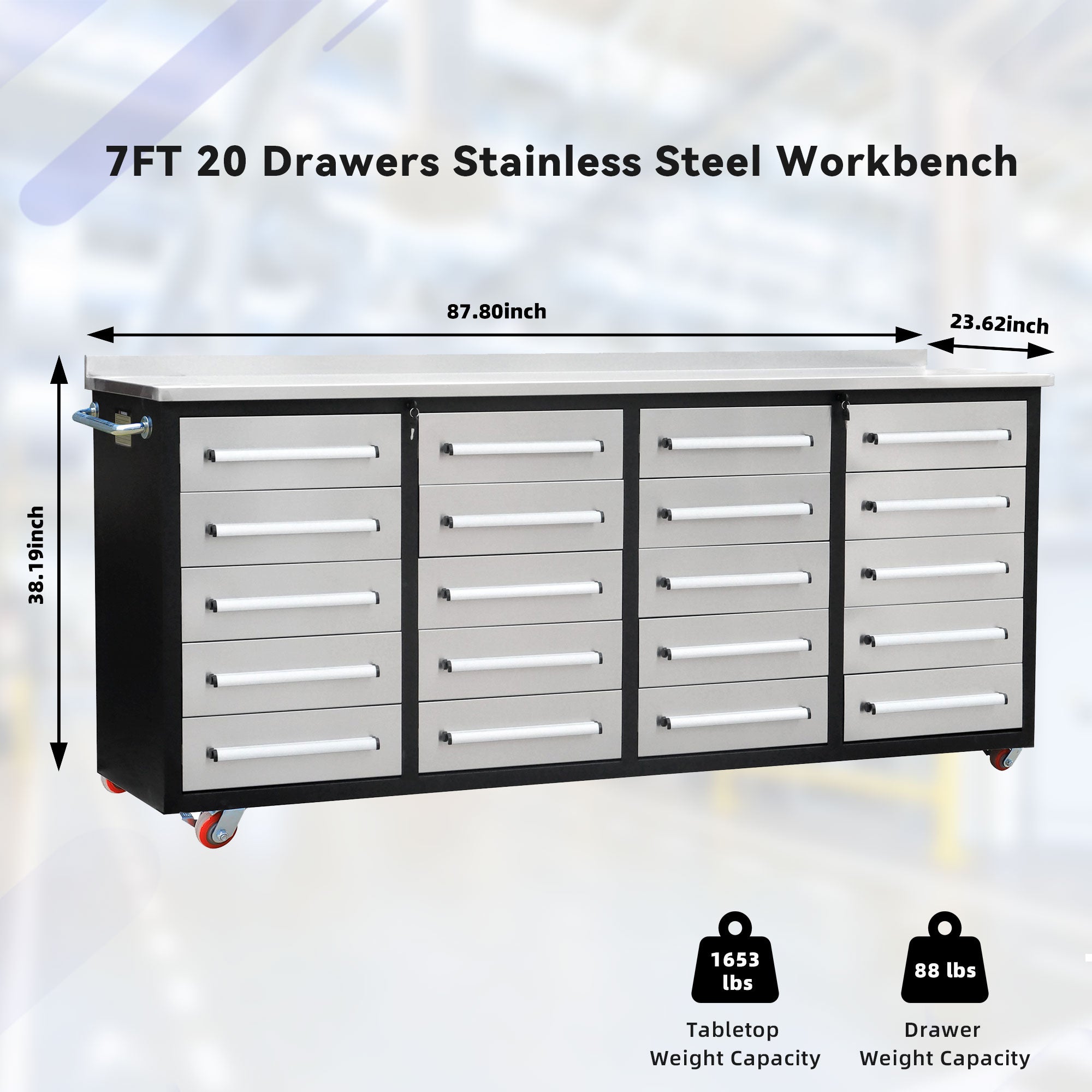 This 7ft Storage Workbench offers robust storage with 20 steel drawers and heavy-duty wheels for easy mobility. It features a thick, durable plywood-lined stainless steel desktop with a 1,653 lb bearing capacity and sturdy handles on both sides. Each drawer supports 88 lbs, making it ideal for demanding workspaces.