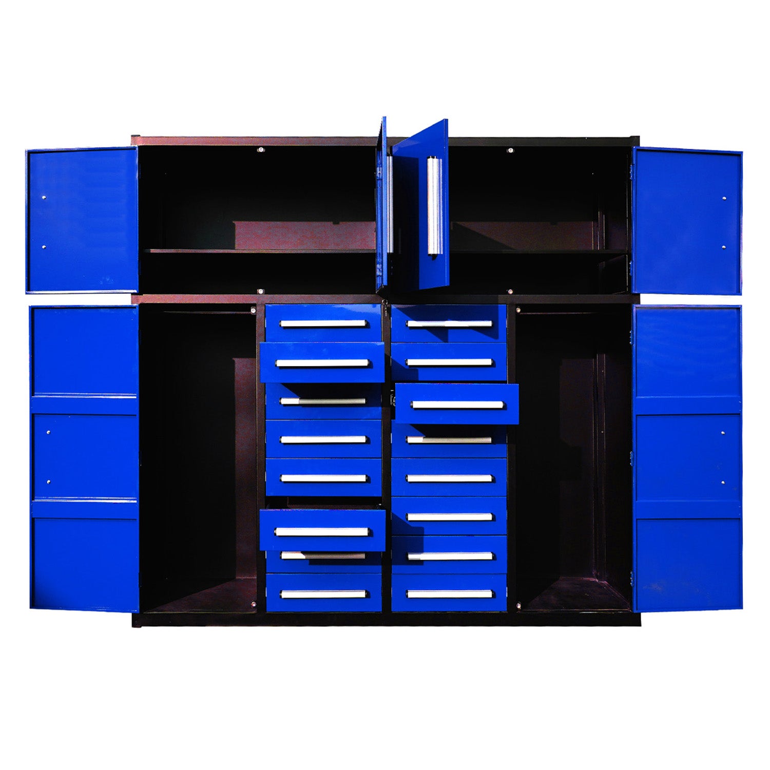 This 7ft garage storage cabinet with 16 drawers and different size cabinets is perfect for storing big and small items. The upper 2 big cabinets can be used for keeping space-consuming but not common-used supplies, and the 2 long cabinets on the side can be used for hanging your clothes to keep them clean and tidy. The best thing about storage cabinets is that 16 drawers are perfect for organizing your belongings, no matter in your garage, workshop, basement, or laboratory. Colors in red and blue are available for your convenience to match your space most.