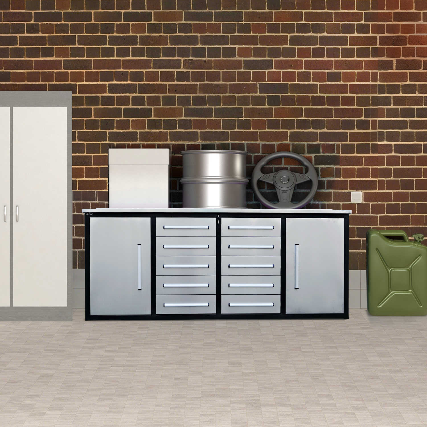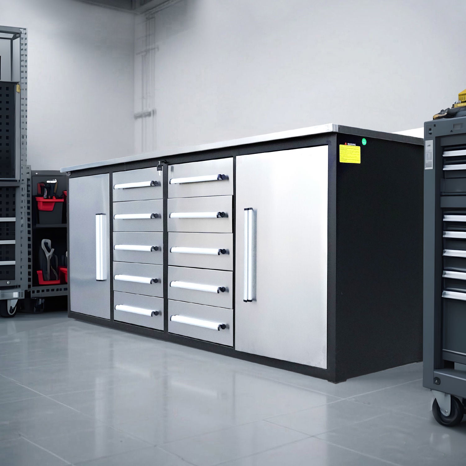 This Steeman 7ft storage cabinet with workbench is for space-saving and organization in the garage, storage room, basement, hobby room, laboratory, office, and other applications. Drawers with locks are helpful for storing miscellaneous work supplies, and you can store some bigger-shaped items in the cabinet. This industrial-grade roller cabinet was designed, tested, and built to last. This unit gives you the flexibility to organize a wide variety of tools with narrow, wide, and extra-wide drawer options. The industrial paint finish is durable, easy to clean, and looks great in any garage.