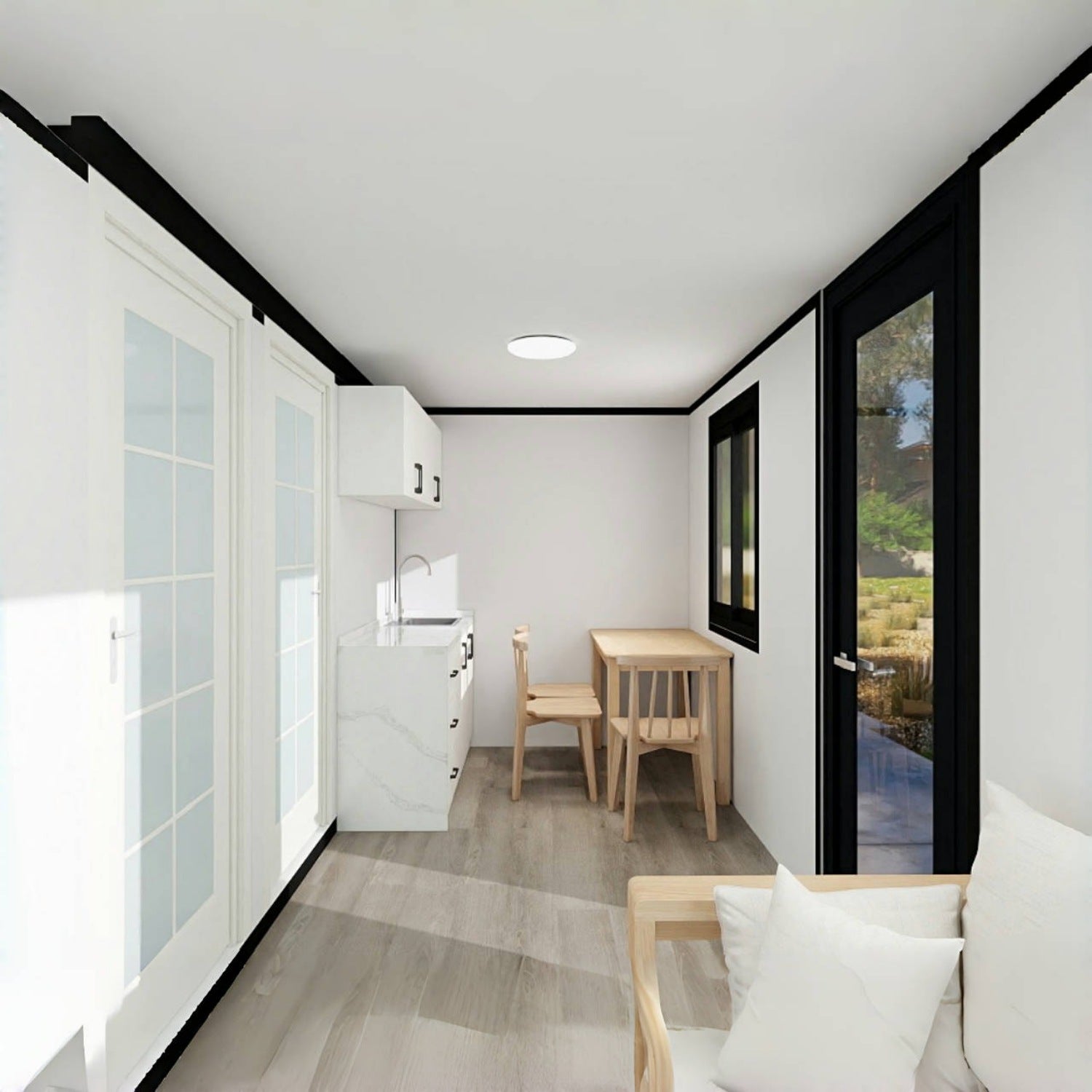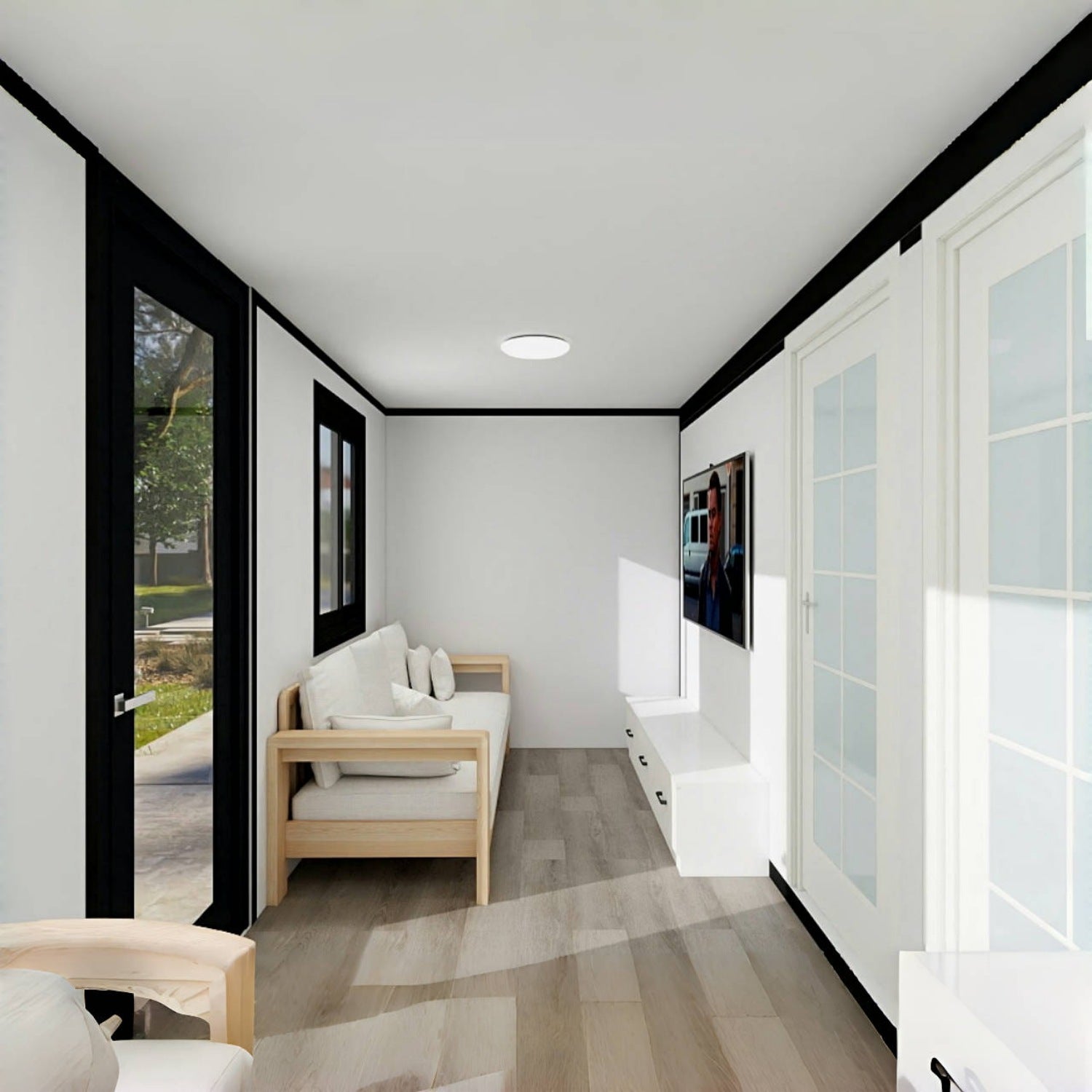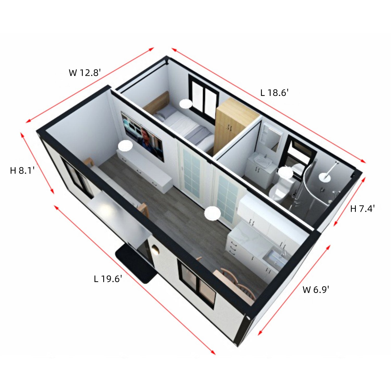 7ft x 20ft Mobile Studio with Extended Space: Starts at L20’xW7’, expanding to L20’xW13’ for extra room. Features a bedroom, bathroom with shower, compact kitchen with integrated cabinets, and small living area—ideal for mobile, versatile living.