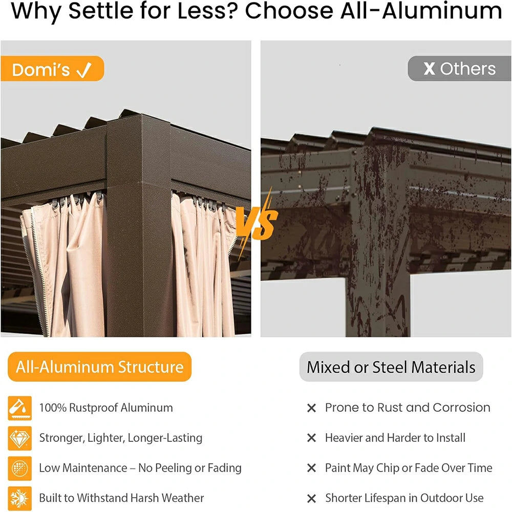 Elevate your outdoor living experience and embrace a lifestyle of luxury with the Domi Louvered Pergola. Immerse yourself in the lap of sophistication as you savor the pleasures of a well-designed and impeccably crafted outdoor space. Transform your backyard into a sanctuary that reflects your refined taste and desire for the finer things in life. Indulge in the extraordinary with the Domi Outdoor Living Louvered Pergola.