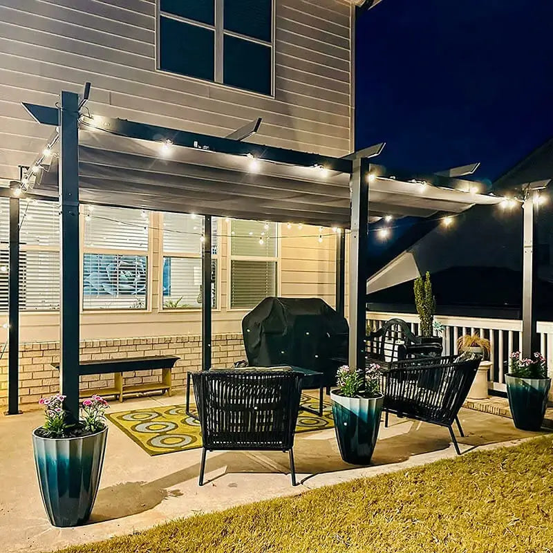 A standout feature of this pergola is its retractable shade canopy. It shades you from the sun’s glare, so whether you’re reading a book, relaxing, hosting a party, or baking your favorite meal, you can enjoy the cool, comfortable atmosphere.