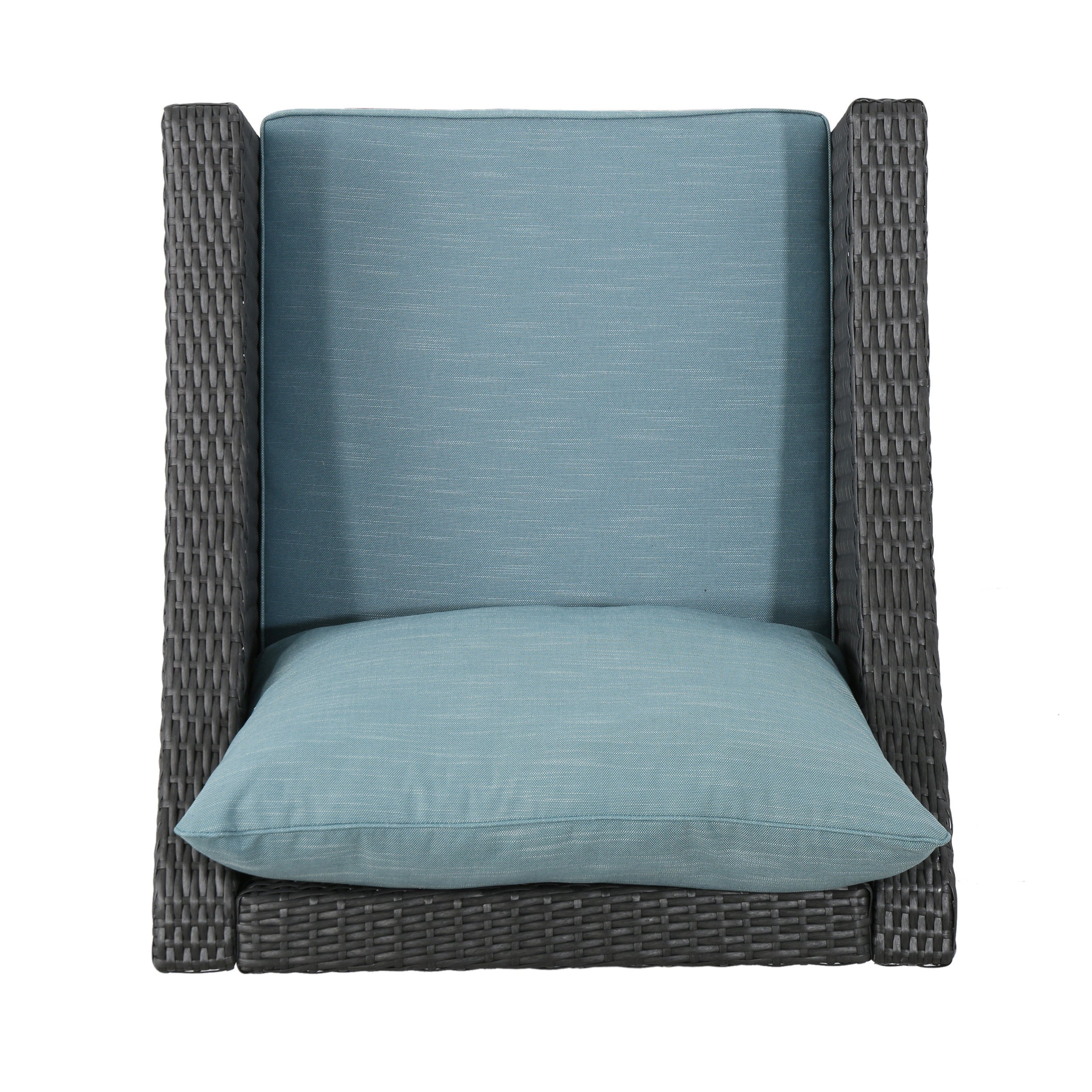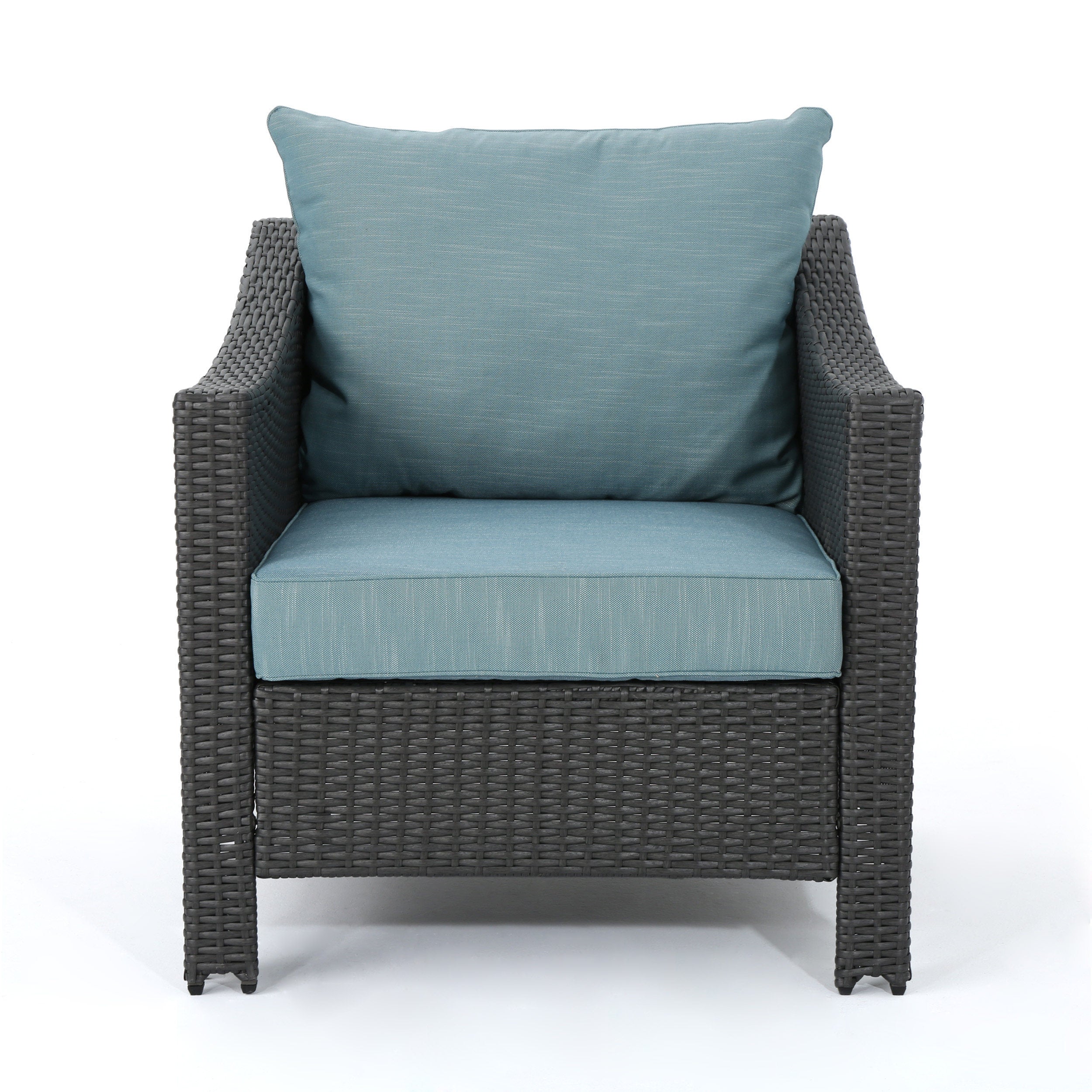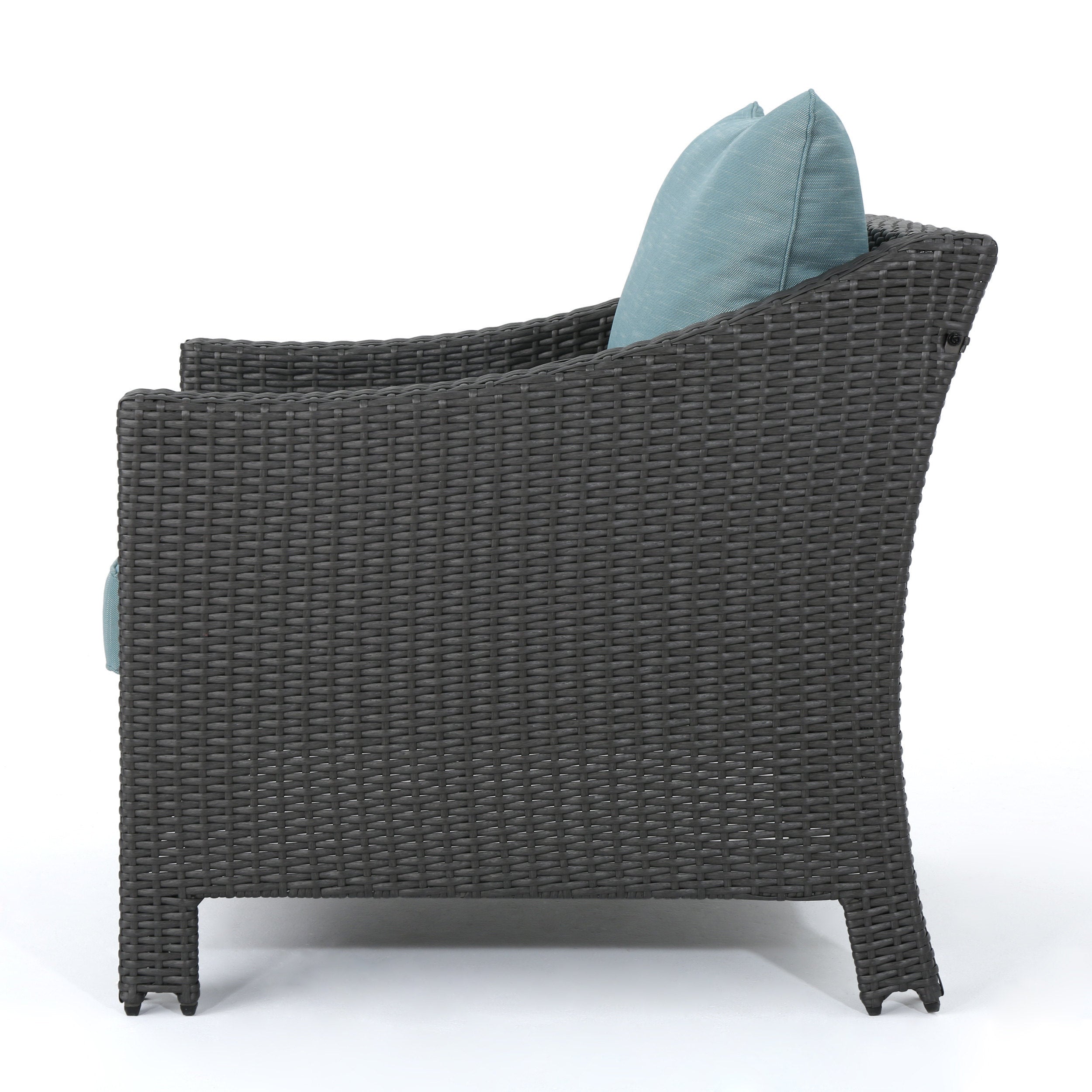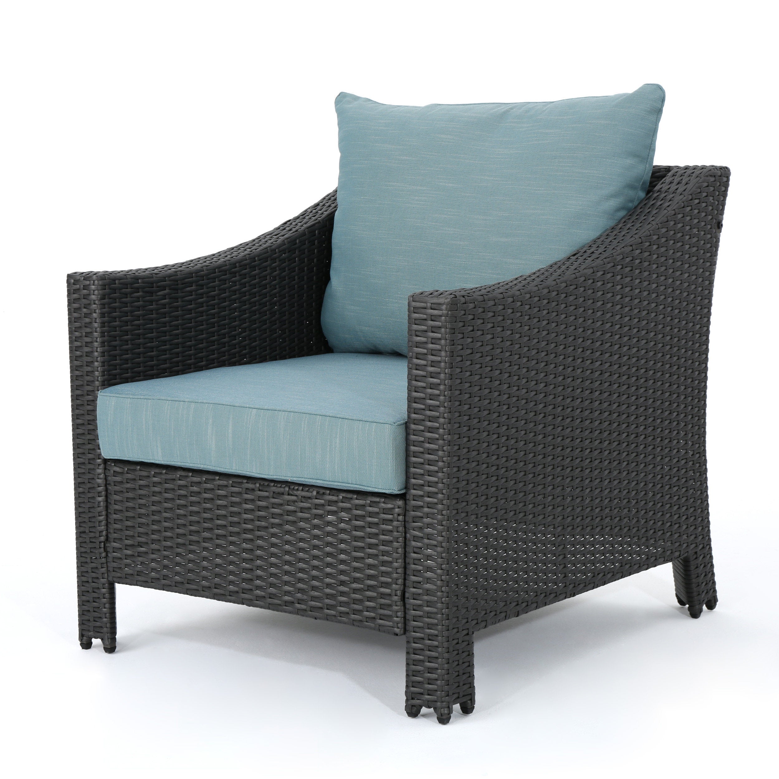 - These wicker club chairs are a great addition to any patio. The water resistant cushions make both the chair and the cushions ideal for an outdoor setting (good to stay out all summer long.) The slight curve of the arms adds the perfect amount of flair, giving you a stylish and comfortable set of club chairs for your patio.