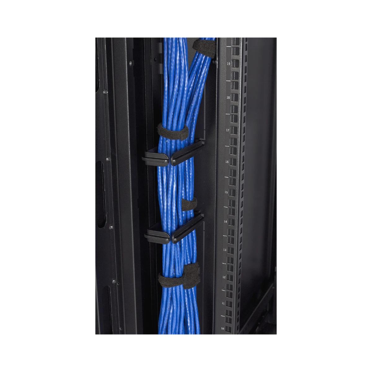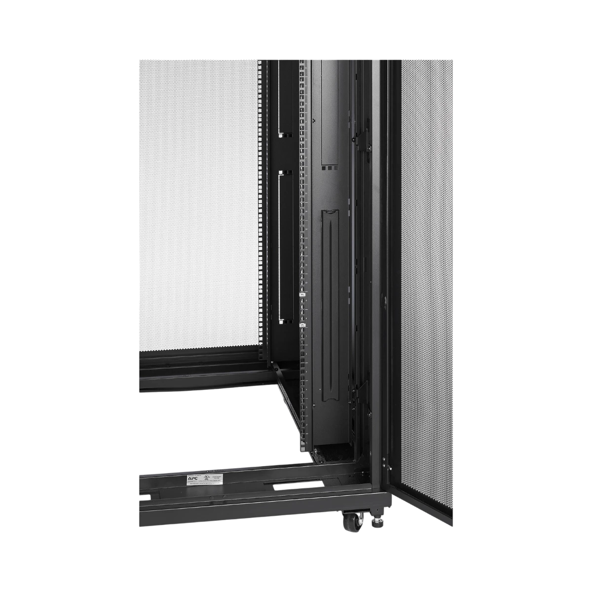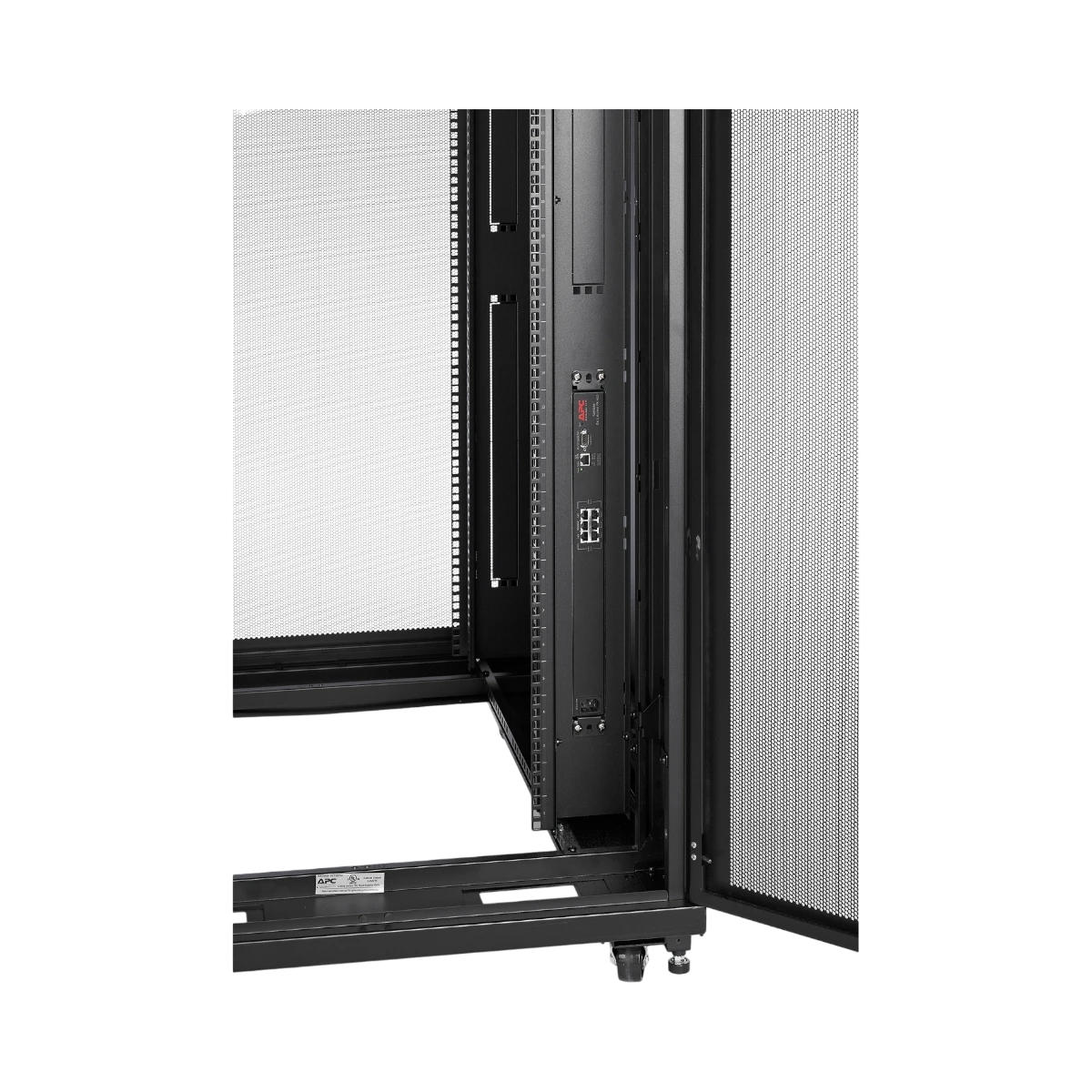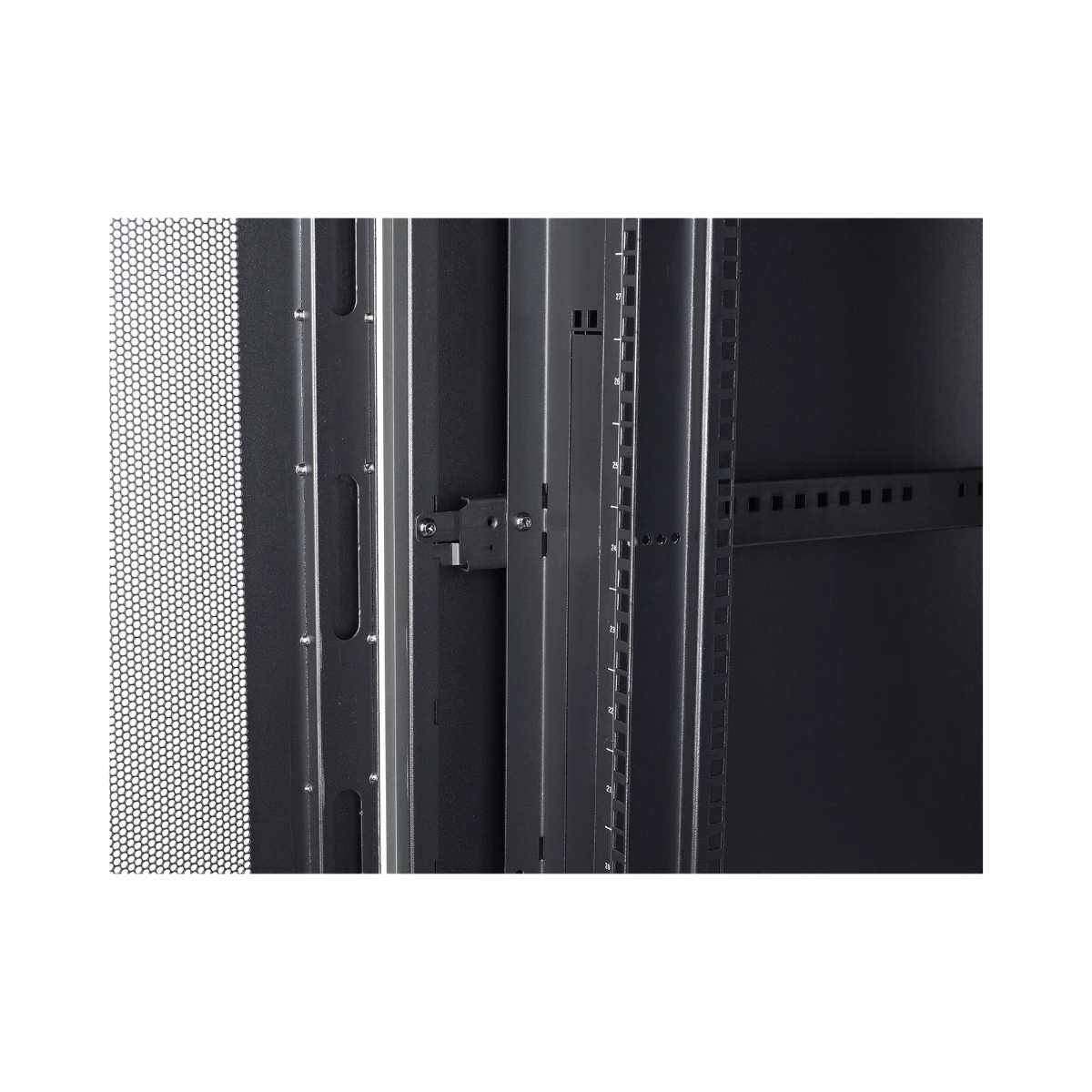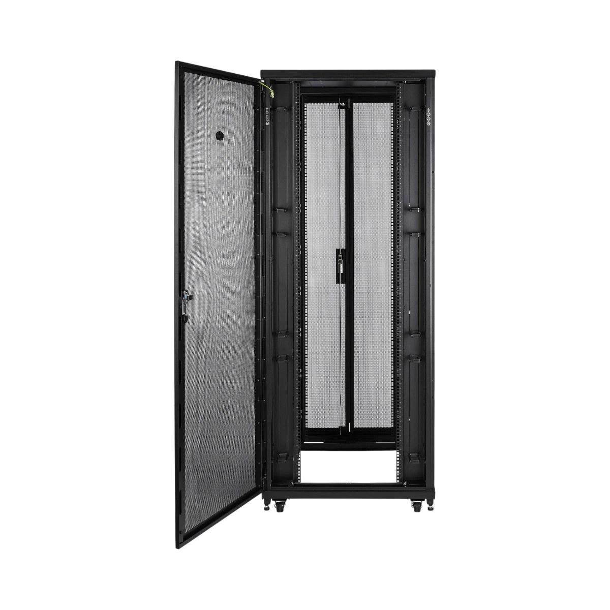 Security and flexibility come standard. The front and rear doors and the side panels share one key, so administrators can control access without juggling multiple sets. Two 1U vertical mounting bays sit near the front of the frame, a position that reserves full rack units for core hardware while still accommodating patch panels, monitoring devices, or cable organizers. The enclosure arrives fully assembled, and its steel construction supports industry-standard rack equipment without flex.