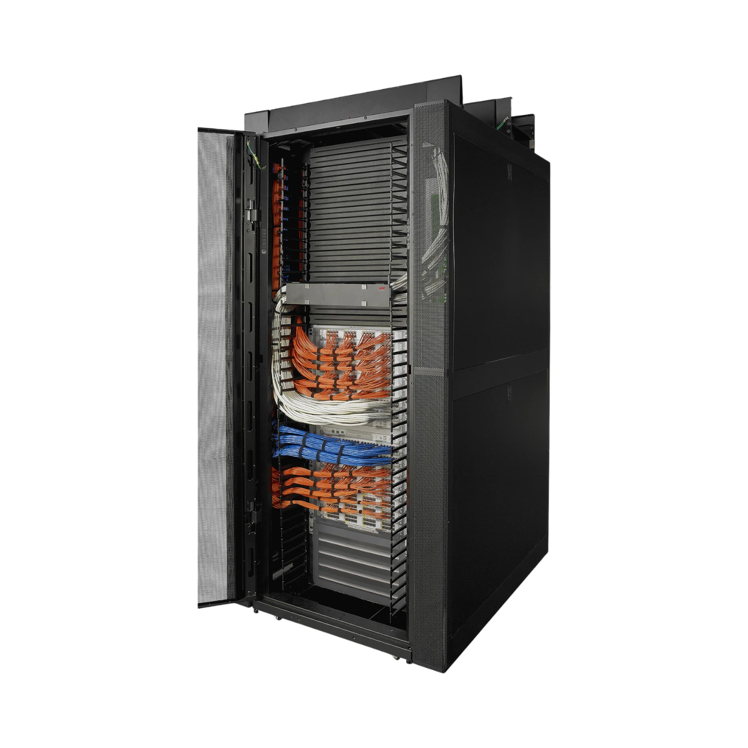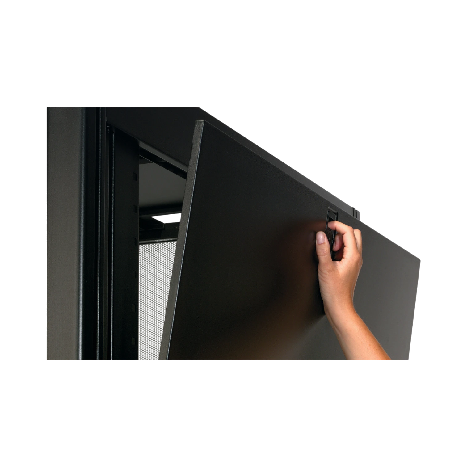 Security and serviceability go hand in hand. Quick-release side panels are lockable yet easy to remove for fast lateral access. Split rear doors reduce the clearance needed behind the rack while still opening wide enough for full-depth servers. Front and rear doors are perforated to promote airflow and are ready for standard lock inserts.