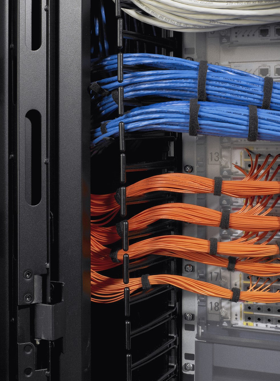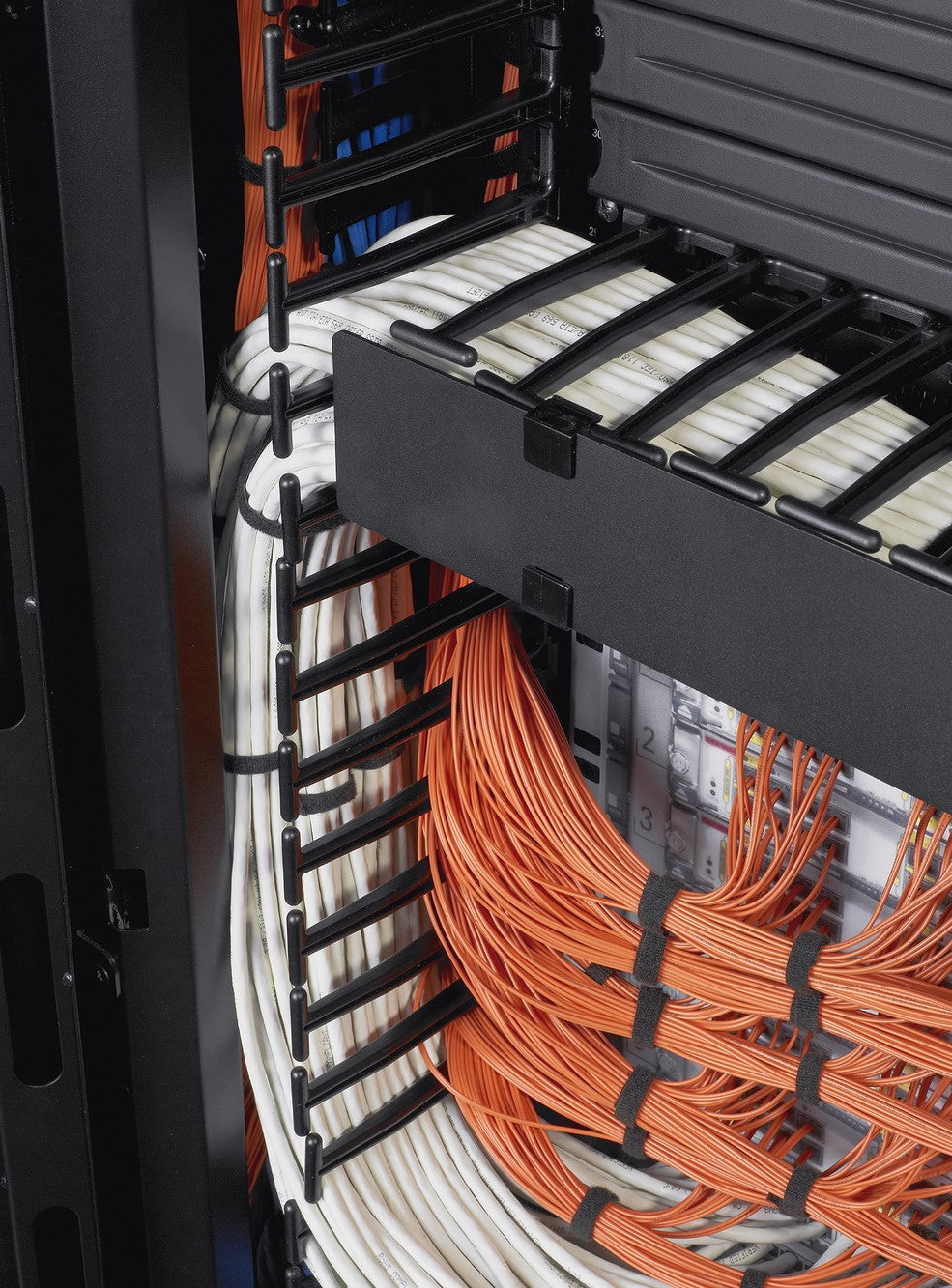 Cable management features are built in from top to bottom. Wide vertical channels and large brush-sealed openings let you route copper or fiber bundles without tight bends, so moves, adds, and changes stay neat and fast. Side-to-side airflow support keeps switch ports cool by guiding air across the equipment rather than front to back, which is especially valuable for high-density top-of-rack deployments.
