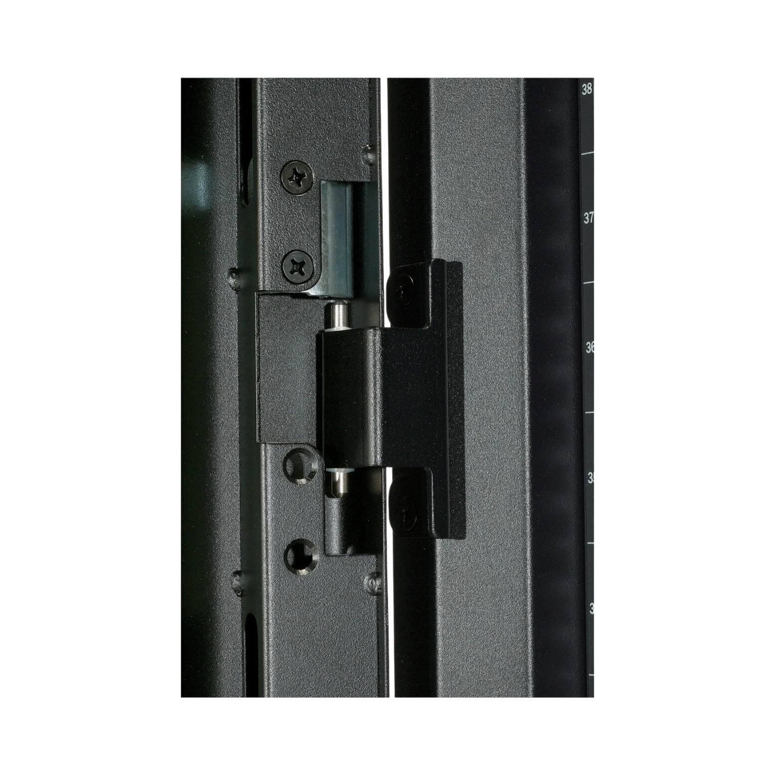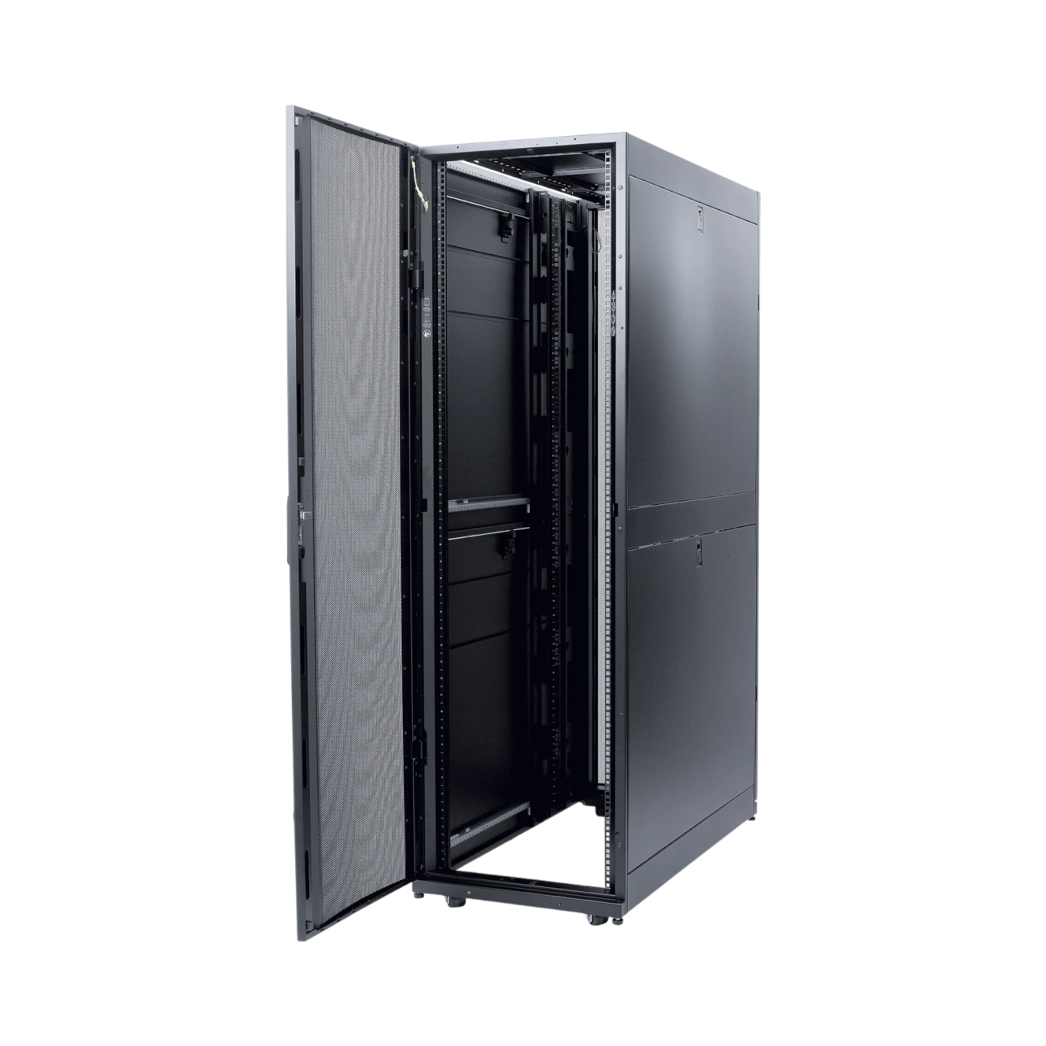 Positioning the enclosure is straightforward. Pre-installed casters let you roll the cabinet into place, and leveling feet lock it down on uneven floors for a solid, vibration-free base. Split rear doors open in two narrower sections, conserving aisle space and giving technicians quick access to rear cabling without swinging a full-width door.