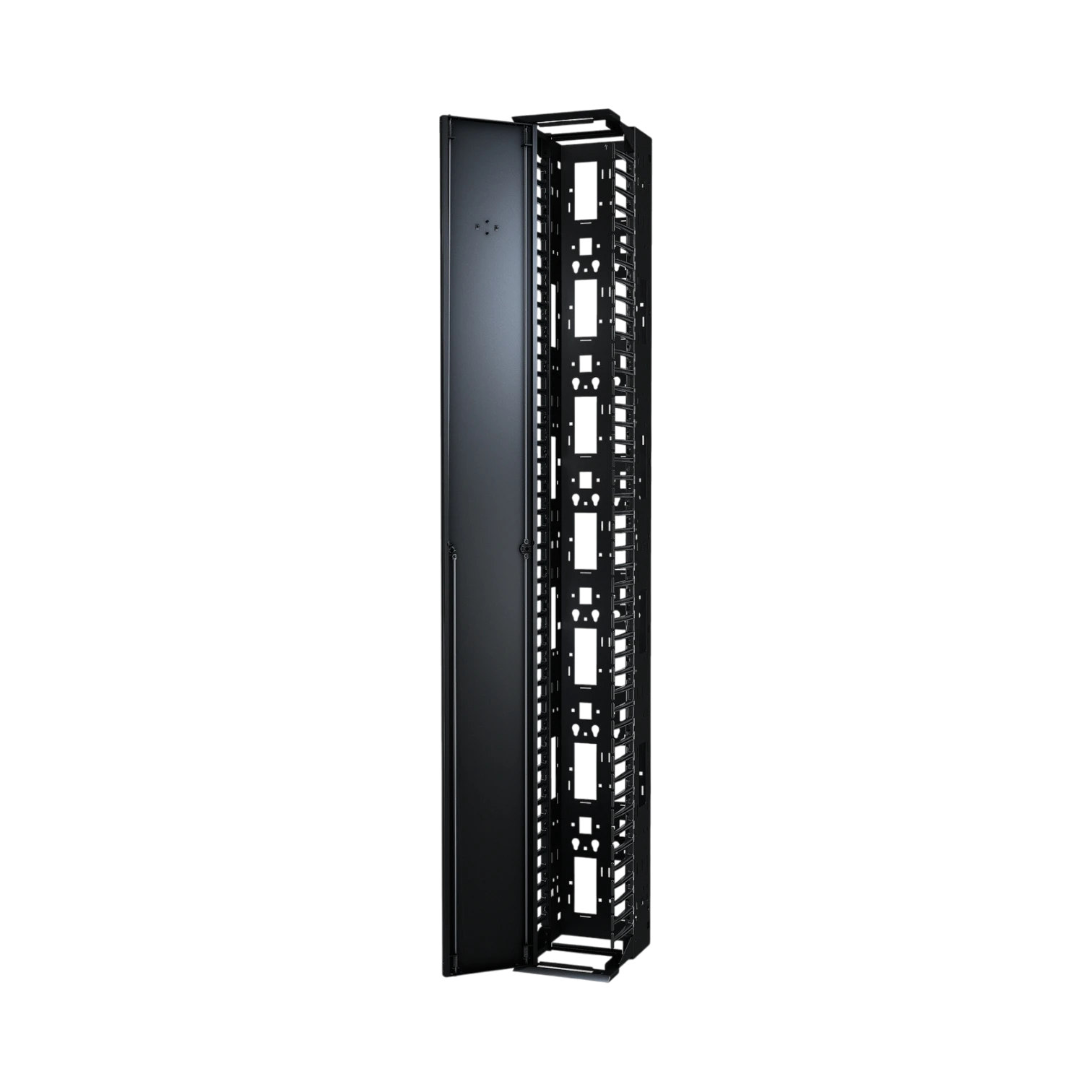 Plastic fingers sit at every 1U position to guide cables and protect their bend radius. Integrated tie-off points and pass-through openings let you move cables from front to back in a clean, controlled manner that prevents strain on ports and connectors. A contoured door latches securely yet can swing open to either side, so technicians can reach the bundle quickly during moves, adds, or changes.