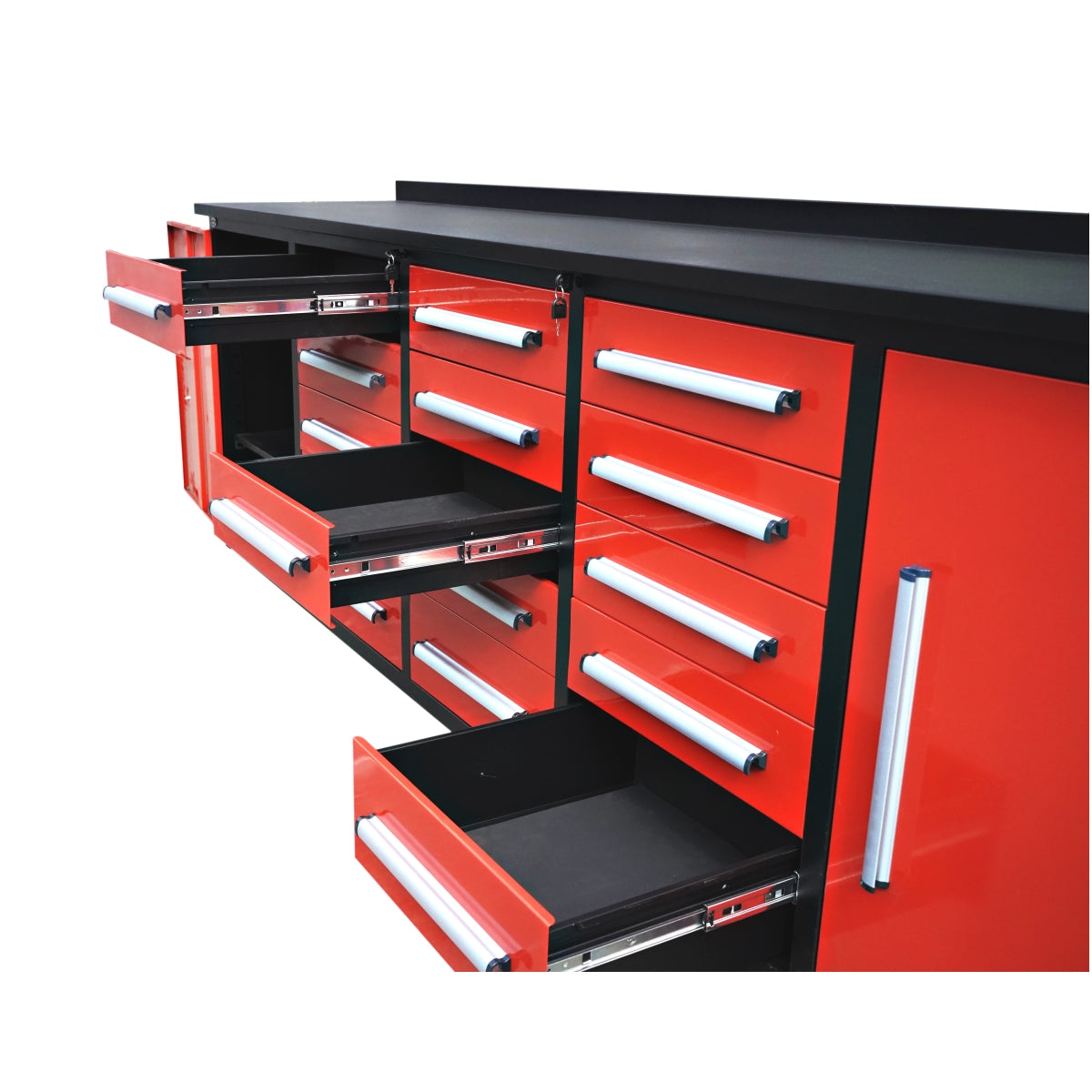 [AS-IS] 10ft Storage Cabinet with Workbench offers 15 spacious drawers and 2 cabinets, providing ample storage for tools and supplies. The sturdy workbench top supports heavy-duty tasks, making it ideal for workshops or garages. Note: Dents on the side and minor scratches are present but do not affect functionality. Sold as-is, perfect for budget-conscious buyers seeking a durable storage solution.