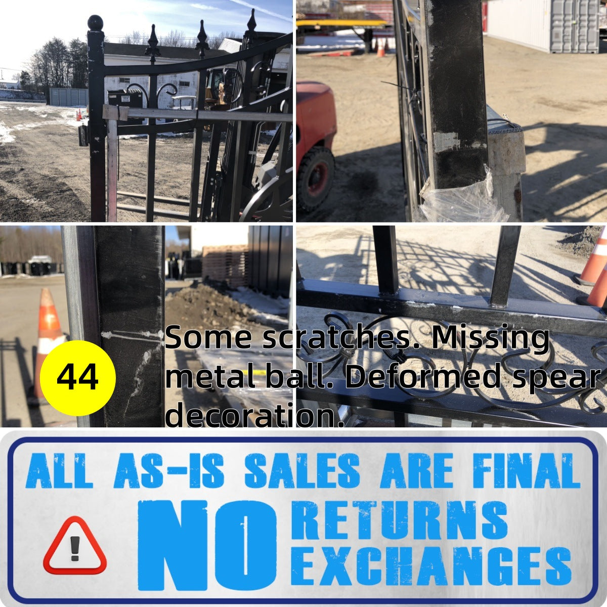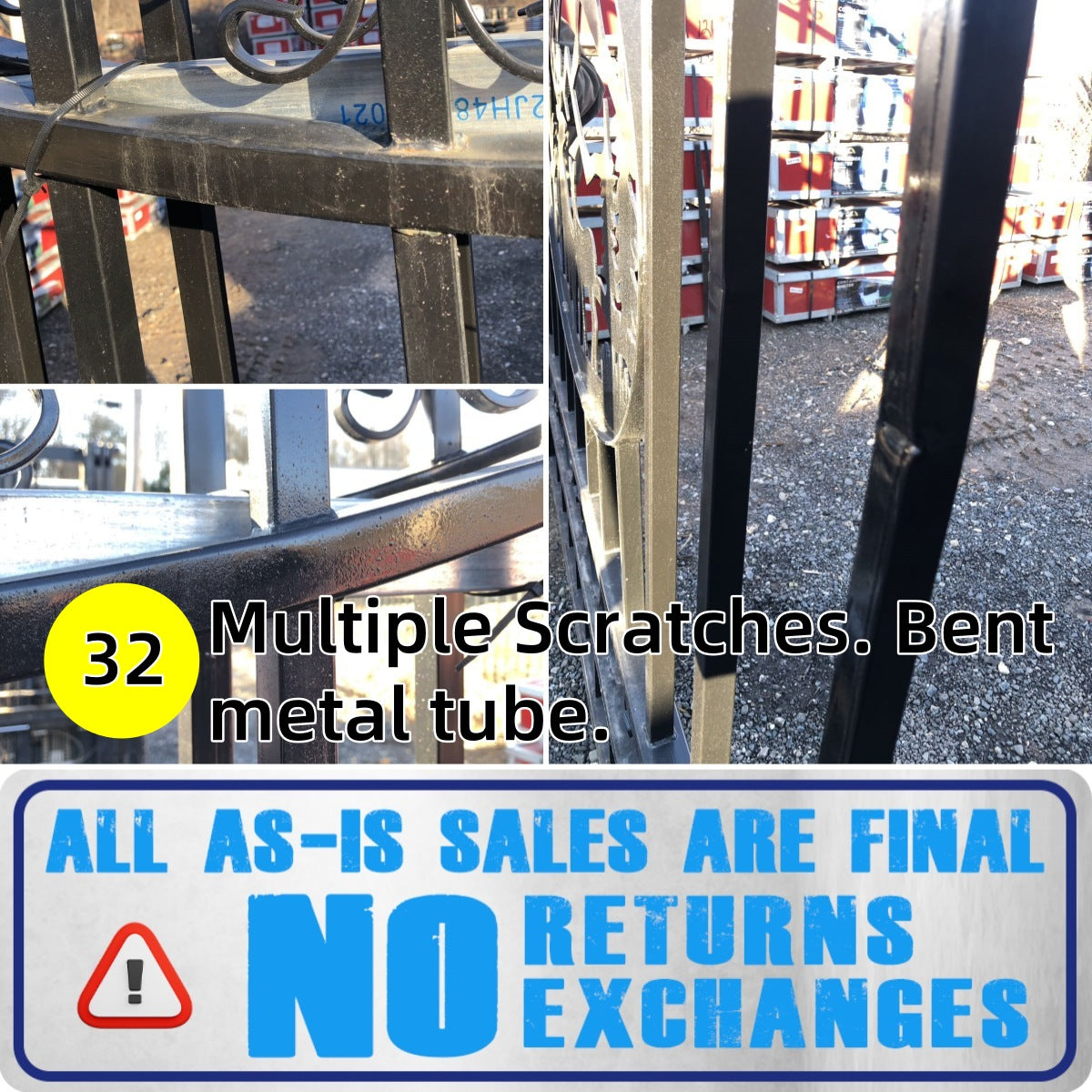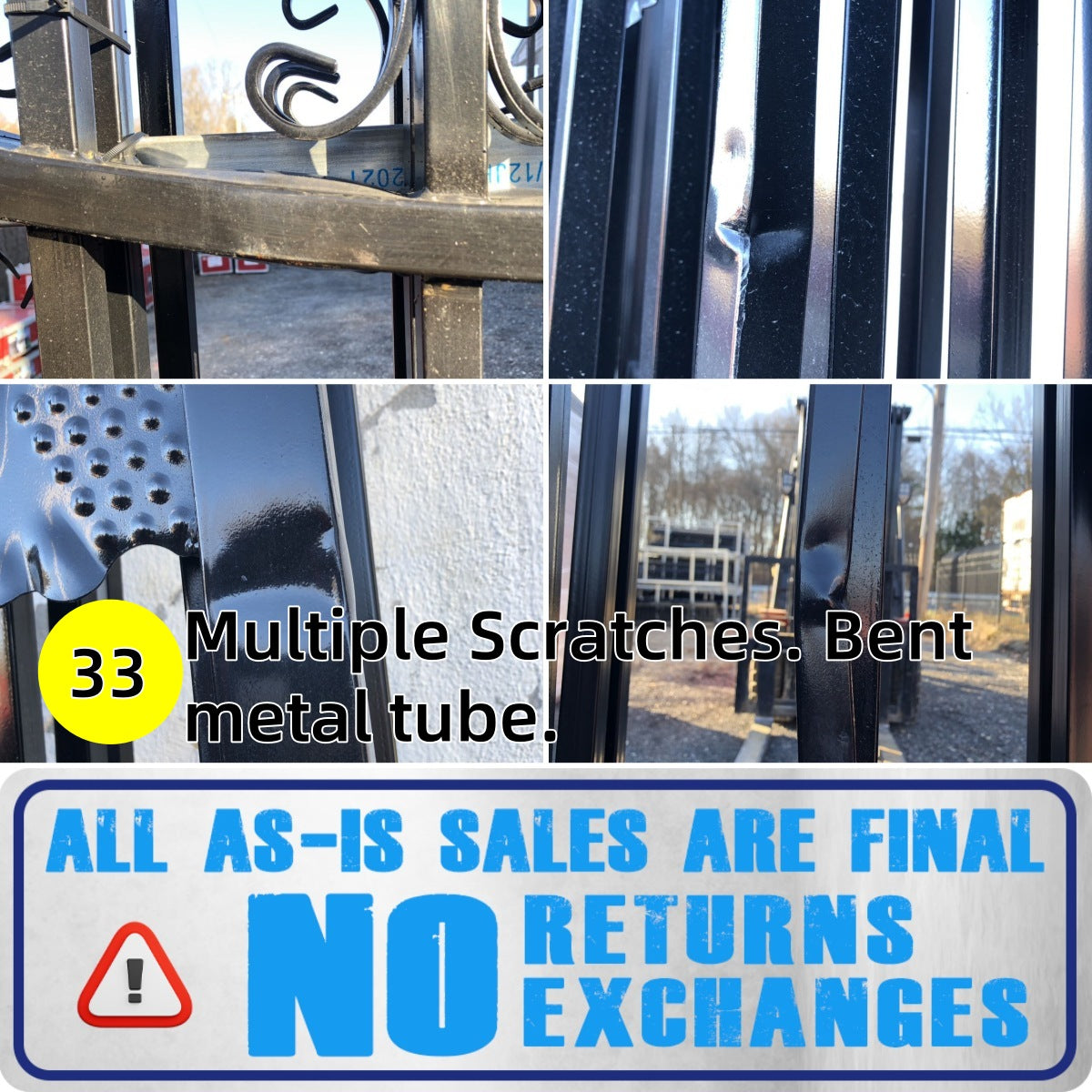 This [AS-IS] 14ft Dual Swing Wrought Iron Gate is in good condition, offering a sturdy and stylish solution for property entrances. It features a durable design with a bent metal tube and multiple scratches that do not affect functionality. Perfect for residential or commercial use, this gate provides both security and a classic aesthetic at a great value.