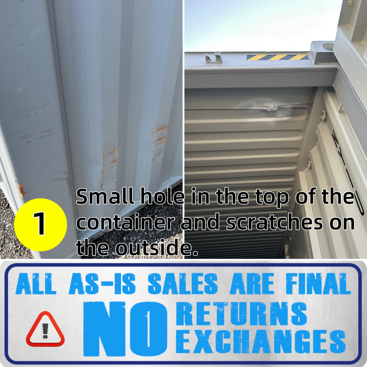 This [AS-IS] 40ft Shipping Container is perfect for storage with two side doors for easy access. While it has some visible wear, including a small hole on the top and scratches on the exterior, it still provides solid functionality for your needs. Ideal for those looking for an affordable storage solution with a bit of character.