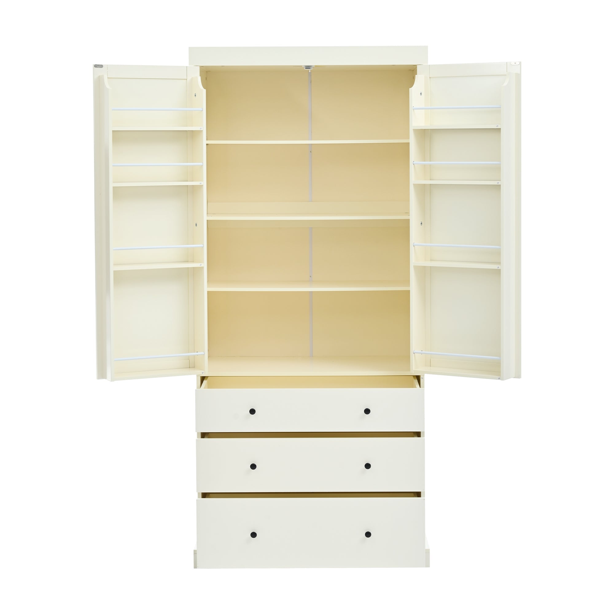 Adding to its space-saving prowess, this kitchen pantry features a hidden gem behind its doors: total 8-tiered door shelves system. The shelves boast varying heights and includes guardrails to prevent items from toppling over.