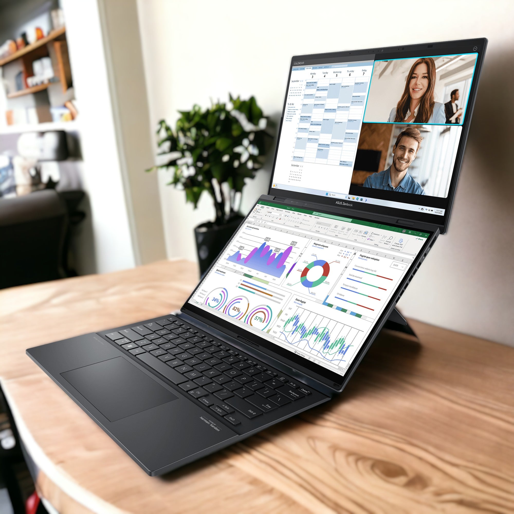 Introducing the ASUS Zenbook DUO — a revolutionary dual-screen laptop with two 14-inch up to 3K OLED touchscreens1, a detachable full-size Bluetooth® magnetic keyboard and built-in kickstand. Expertly combining multitasking versatility with superb mobility, the dual displays instantly expand your workspace up to 19.8 inches. Outstanding performance is assured with up to the AI-powered Intel® Core™ Ultra 9 processor and up to 32 GB LPDDR5x memory, plus 1 TB PCIe® 4.0 SSD. Paired with dedicated smart software, intuitive gesture control and a 75 Wh battery, the easy-to-use Zenbook DUO maximizes productivity with zero fuss. Come on — Let’s DUO it.