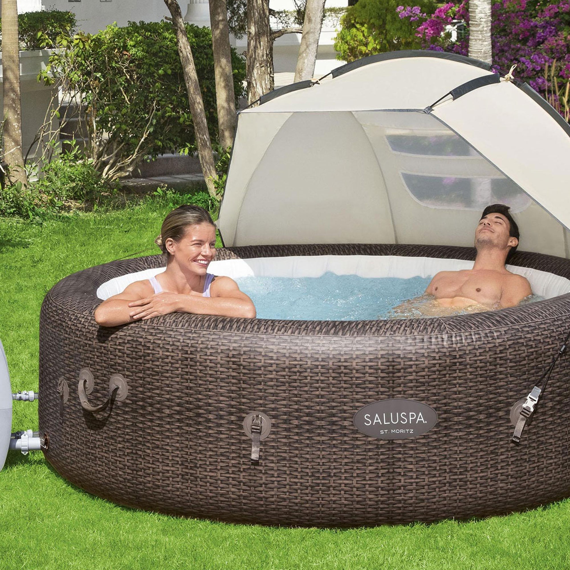 Escape away using the Sunshade Canopy while relaxing in the St. Mortiz SaluSpa Inflatable Hot Tub from Bestway.