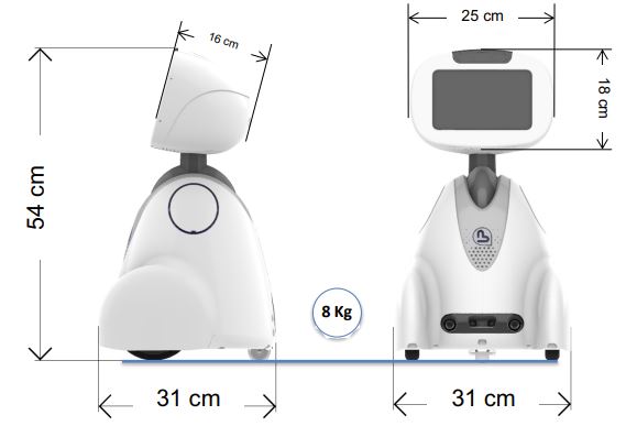 Buddy is made up of sensors (Obstacle detection, Cliff sensors, Cameras, Caress sensors, Omnidirectional microphones, Touch screen), and actuators (Wheel motors, head motors, arm connectors). Buddy expresses its emotions through a screen that displays its face and through LEDs on its shoulders and chest. It communicates via Wi-Fi wireless networks, 4G SIM card (optional), Bluetooth. It recharges manually via a connector plugged into the charger or automatically by going to its charging station (optional).