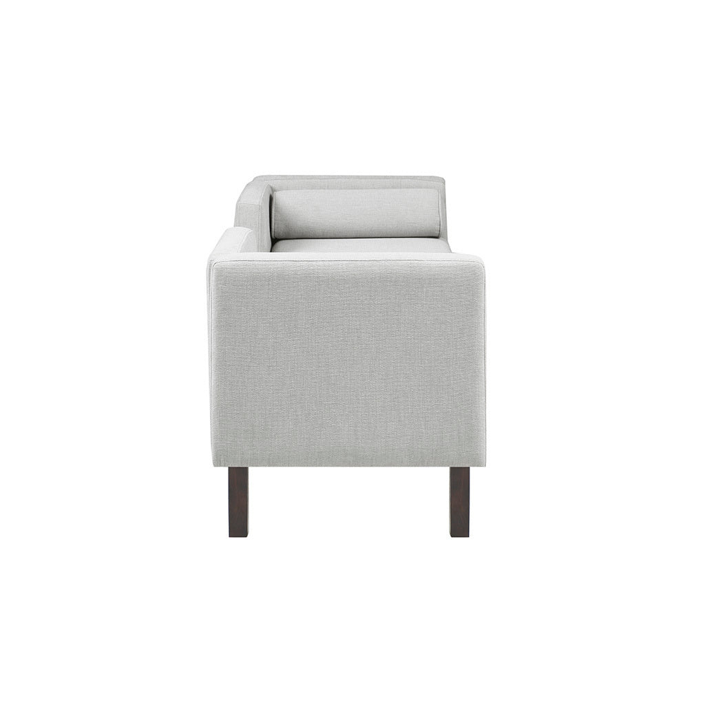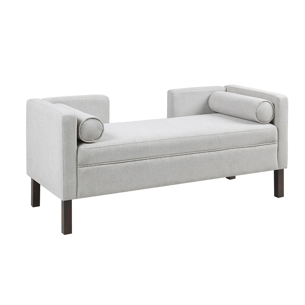 Elevate your home decor with the mid-century charm of the Madison Park Bradford accent bench. Featuring a unique cutout open back, this upholstered accent bench flaunts clean lines that provide a sophisticated and modern look to any room. The gray upholstery is soft, yet durable and is complemented by the dark coffee finish in the solid wood legs, for a handsome contrast. Matching round bolster pillows are removable, adding comfort and complete this upholstered accent bench.