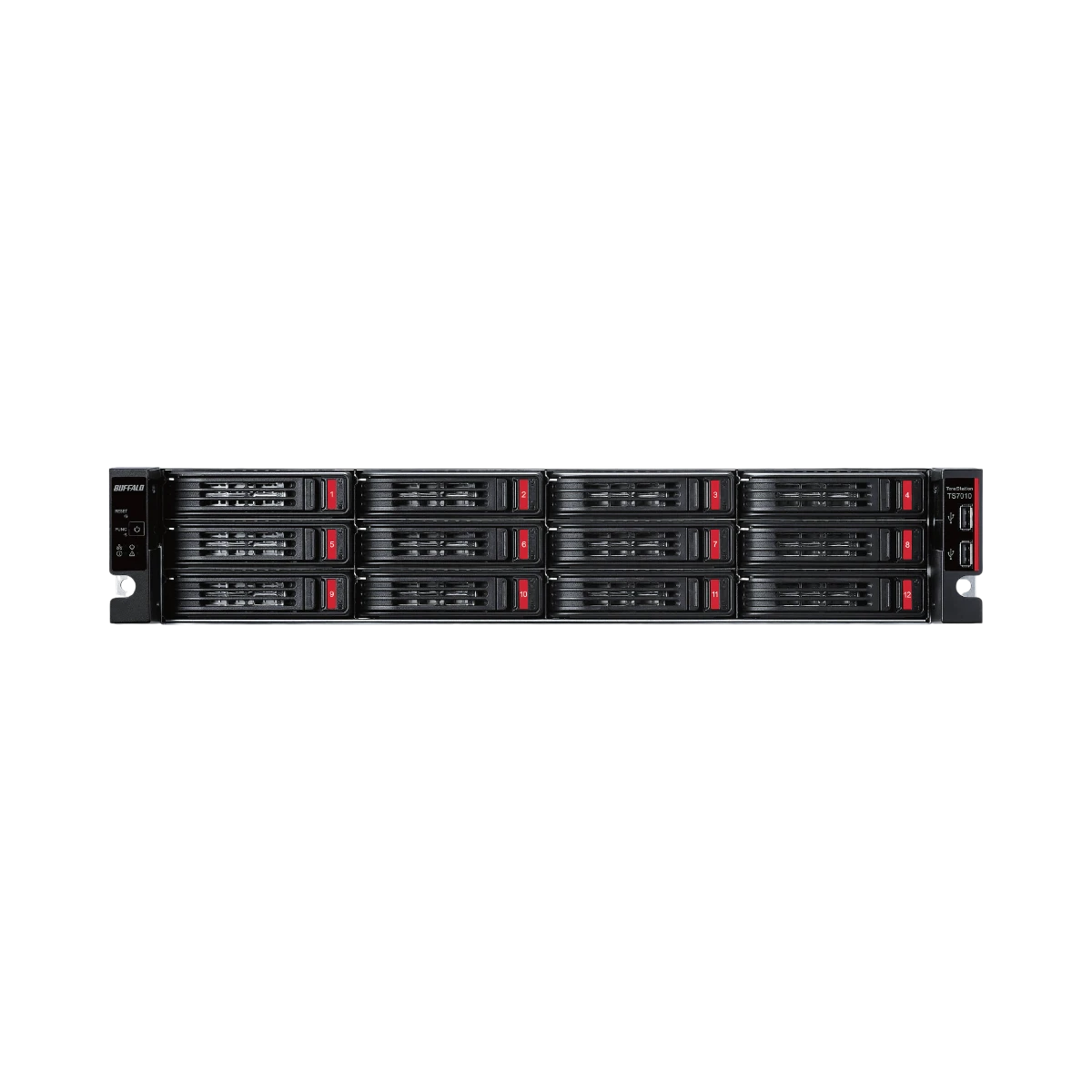 The Buffalo TS71210RH9612 is a 12-bay rackmount network attached storage server that ships with twelve 8TB enterprise-class drives, giving you 96TB of raw capacity right out of the box. It is designed for companies that need both speed and space, whether you are archiving high-resolution media, running virtual machines, or consolidating daily backups from multiple offices.