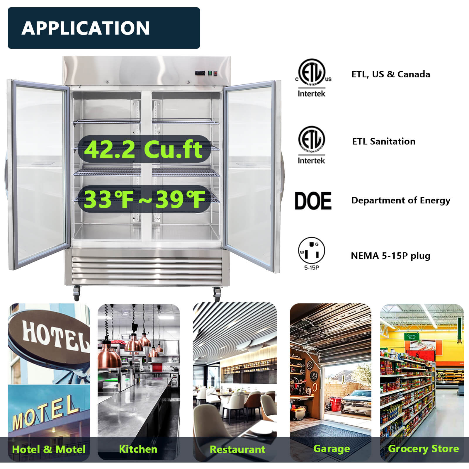 Check out our [CLEARANCE] 54″W Commercial Refrigerator, a 2-glass-door upright merchandiser with stainless steel interior and exterior. It offers 42.2 Cu. ft. of space, fan cooling, and a temperature range of 33℉~39℉. Perfect for showcasing your products in restaurants and commercial settings.