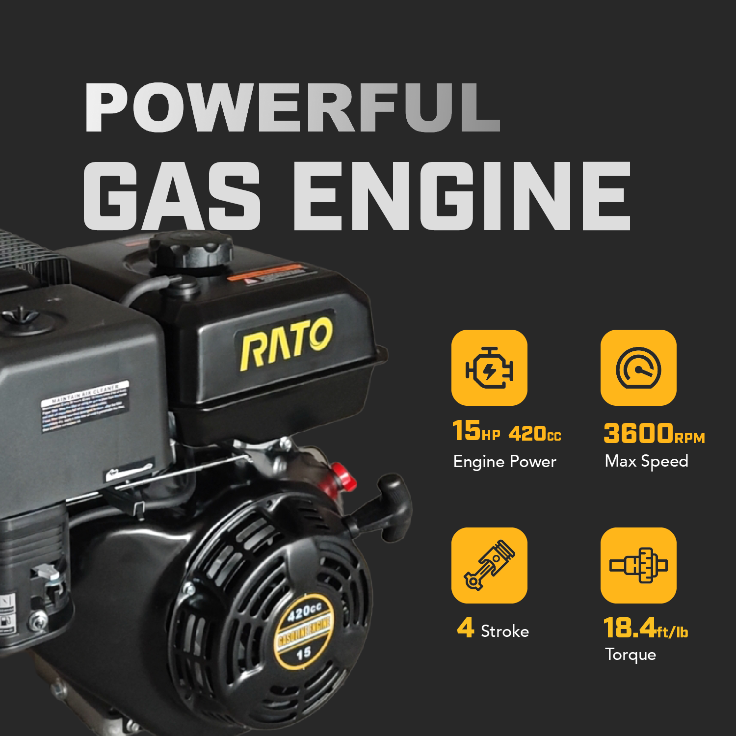 - Powerful 15hp 420cc RATO gas engine with recoil start.