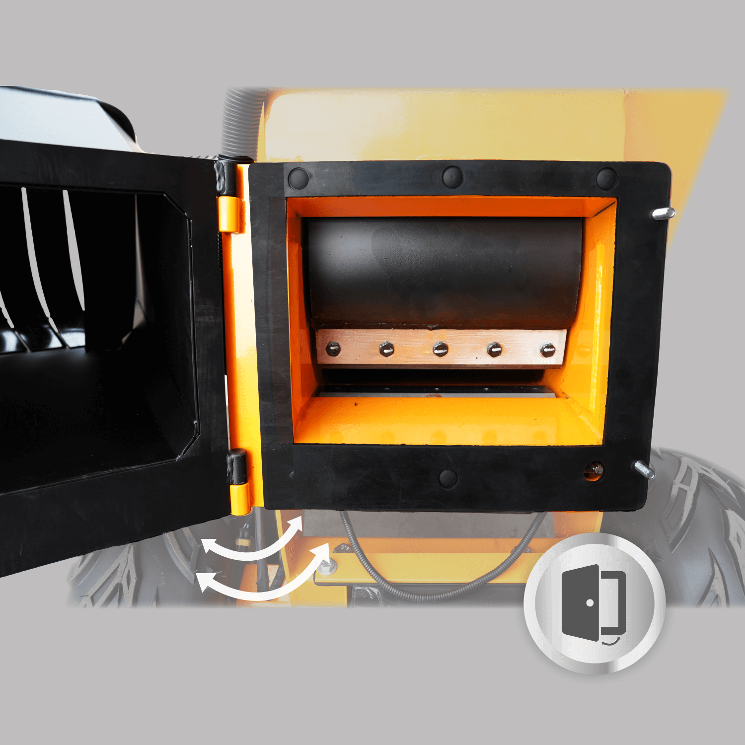 - Side-opening Feed Chute: Remove 2 bolts to open the hopper for easy cleaning and blade changes.