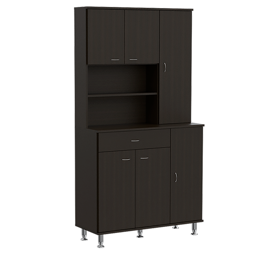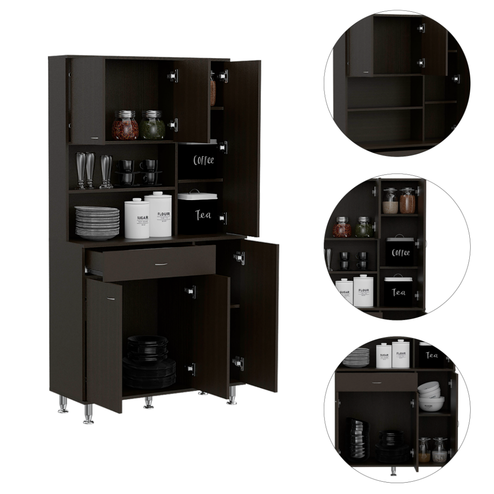 The Della 90 Pantry Cabinet is a kitchen organization station that frees up valuable counter and cabinet space. Providing plenty of storage for your plates, glassware, silverware and other small appliances. This kitchen pantry also features a spacious drawer and hidden storage behind two lower panel doors. Elegant doors complete the look and incredible functionality of this pantry cabinet. This unit also has adjustable metal legs to provide stability. Measuring 14” x 35” x 67” H. Finish: black