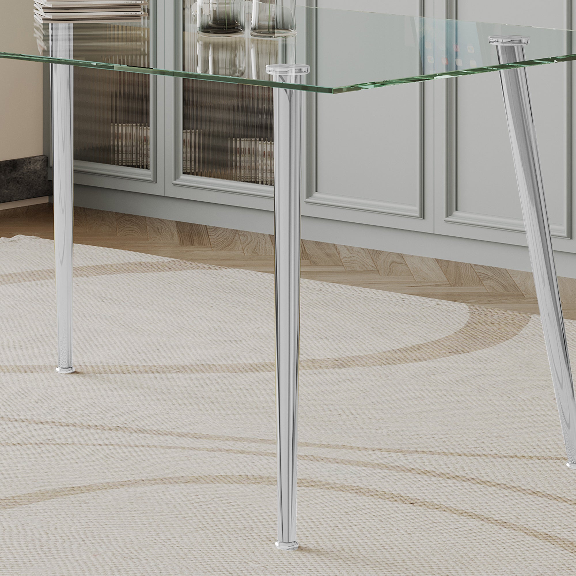 Be the first to review “Dining Table Set of 5, 0.32″ Thick Tempered Glass Top Dining Table with Metal Legs and Four Fabric Dining Chairs, Table Size: 62.99″ L x 35.43″ W x 29.92″ H”